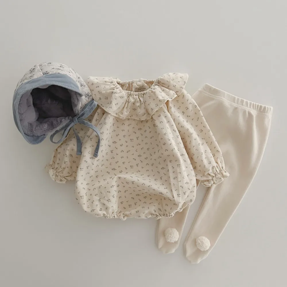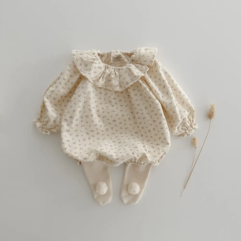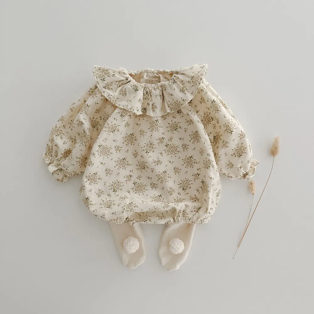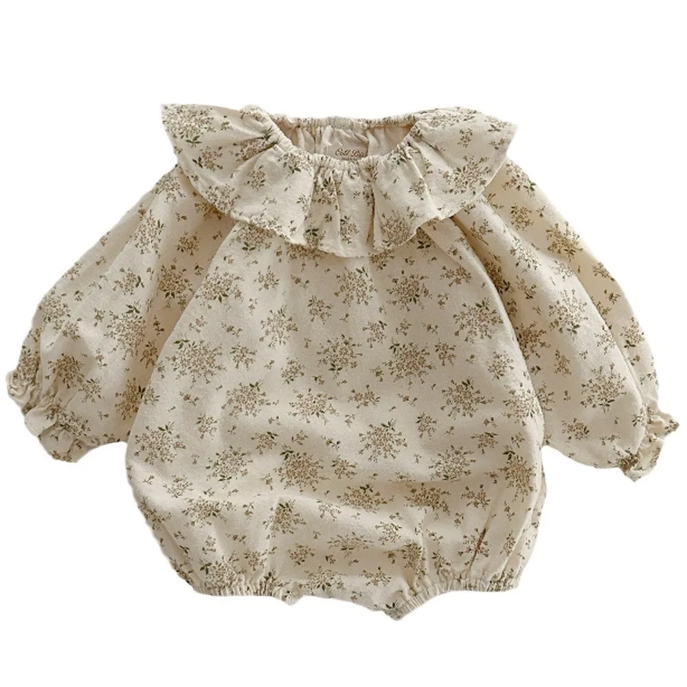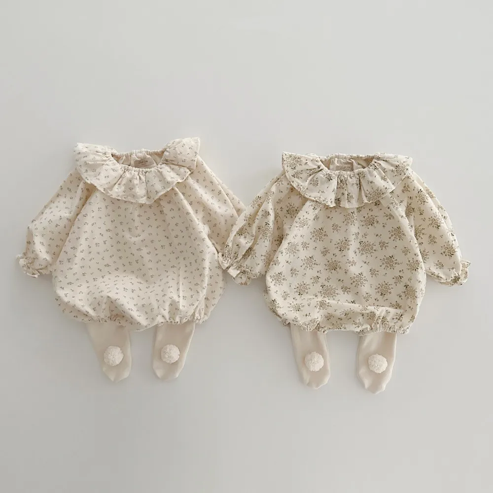 ベビーロンパース フリルサークル襟 長袖ボディスーツ フラワー花柄プリント 2カラー【mh0006562】