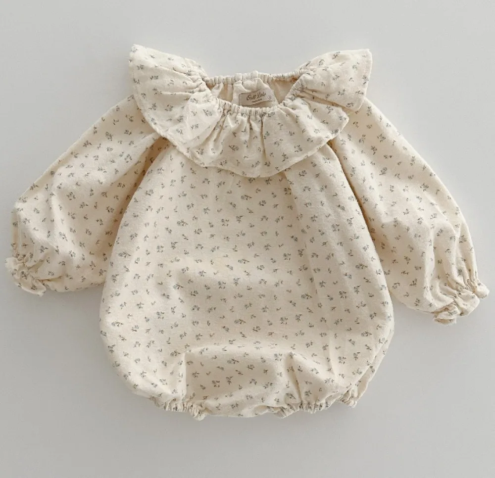 #ベビーファッション #ロンパース #フリルサークル襟 #花柄プリント #コットン素材 #赤ちゃん服 #長袖ボディスーツ