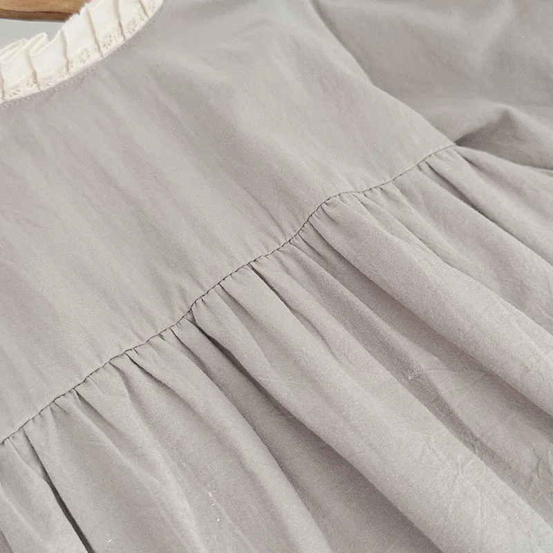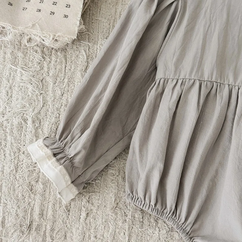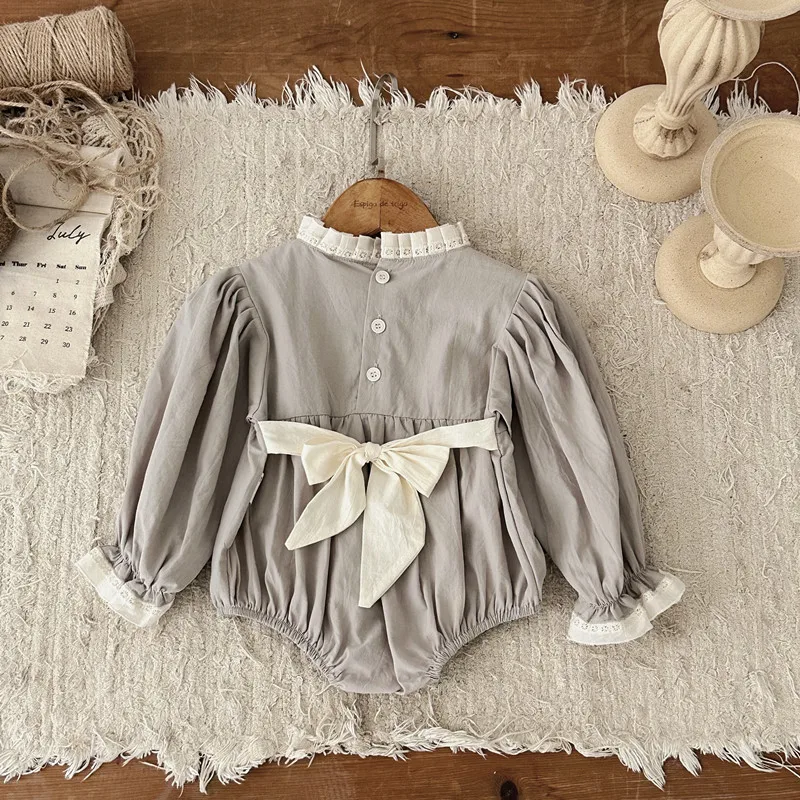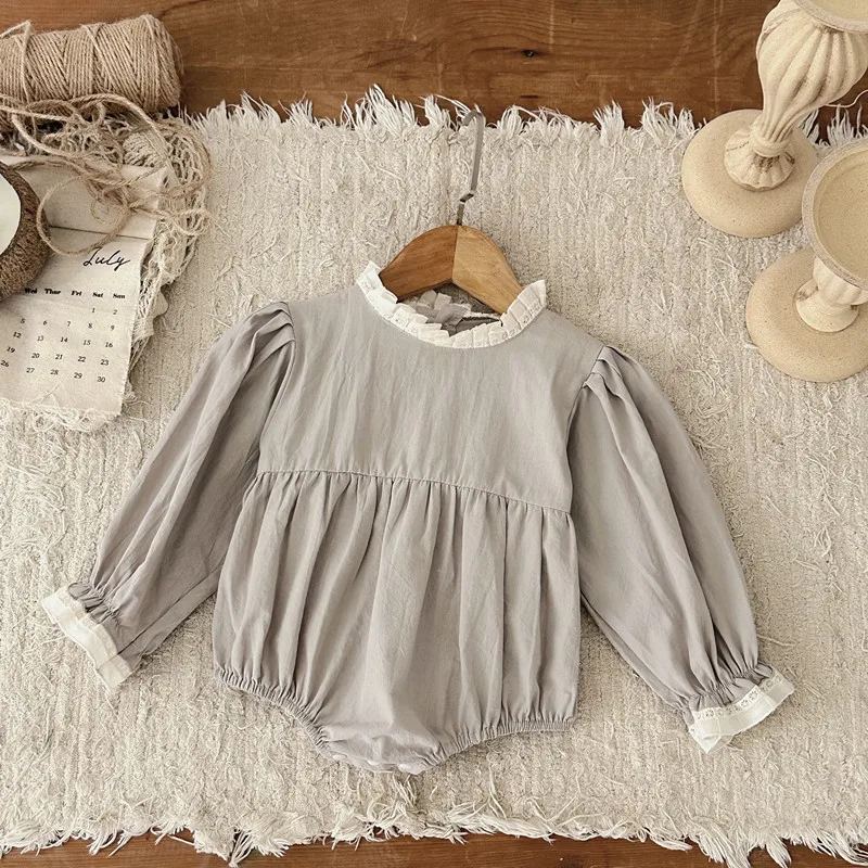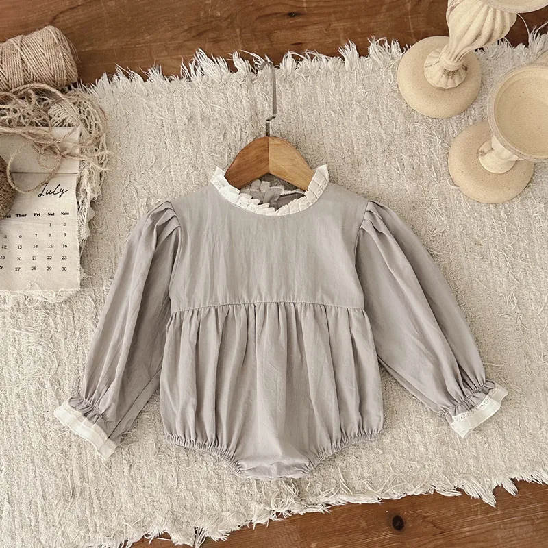 #ベビーロンパース #レーススタンドカラー #パフスリーブ #長袖ボディスーツ #グレーグリーン #赤ちゃん服 #カジュアルロンパース #新生児用