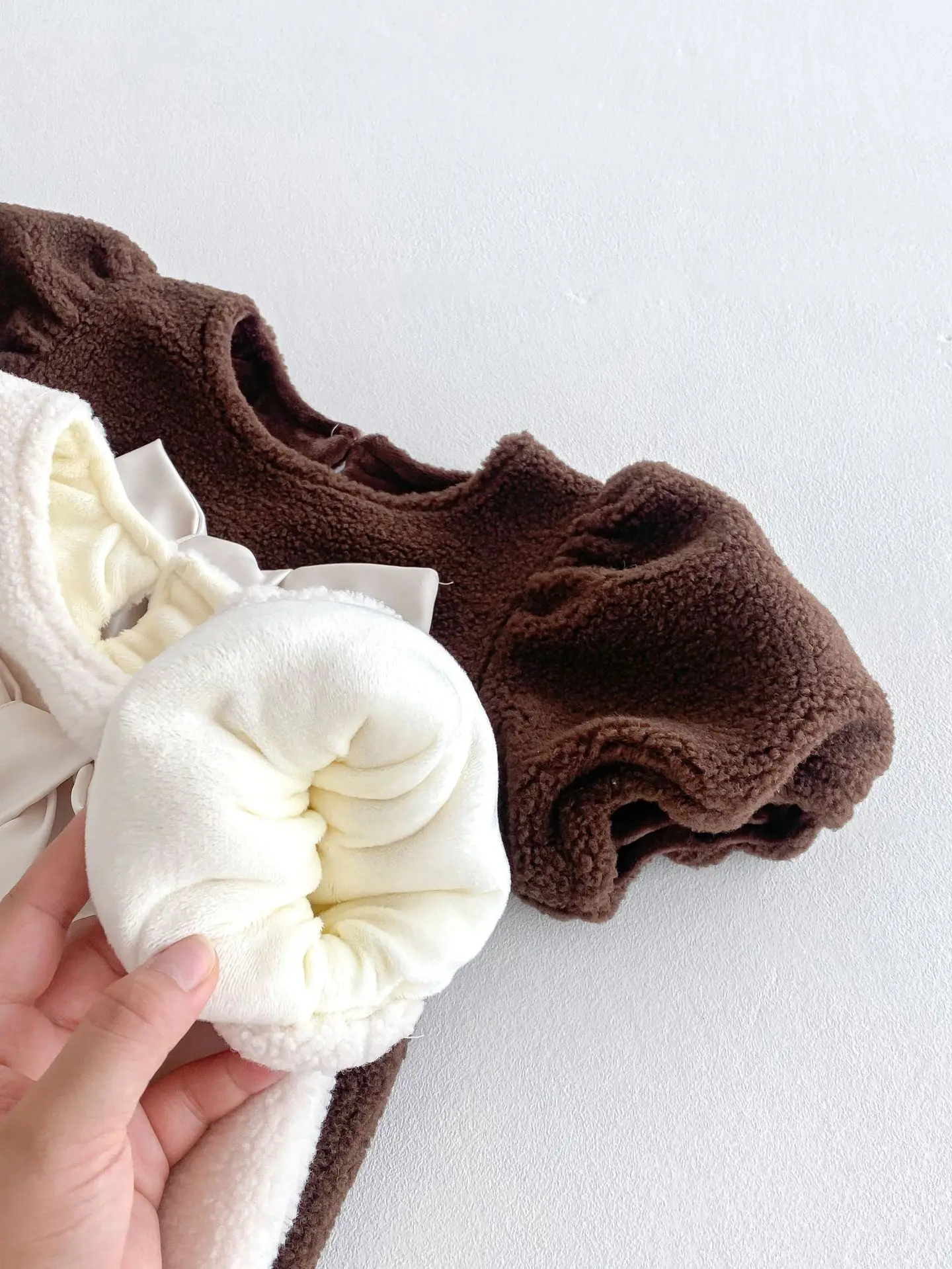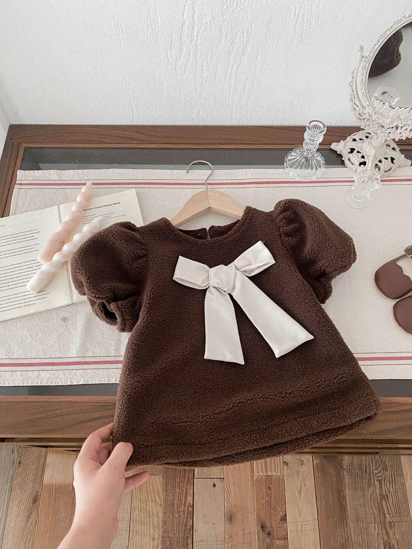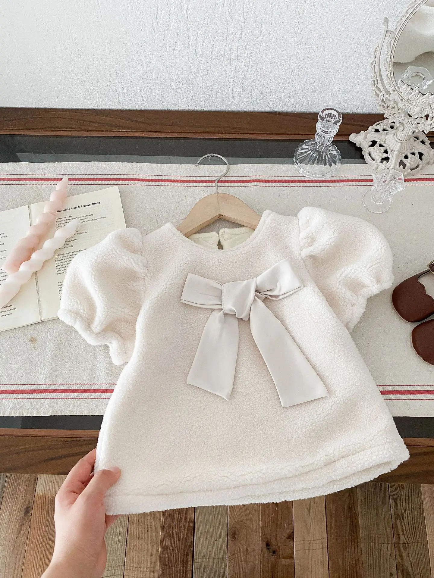 ベビーキッズワンピース ビッグリボンフリース厚手半袖パフスリーブワンピース【mh0007666】