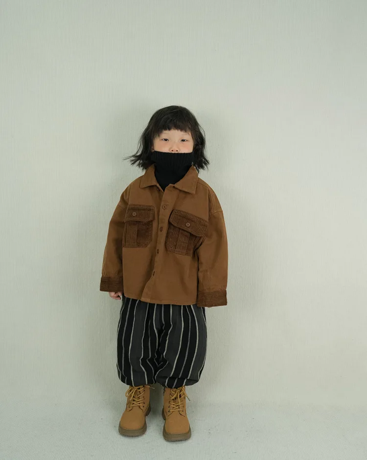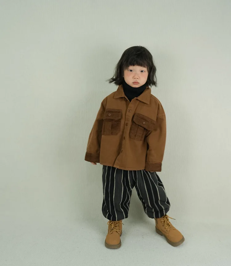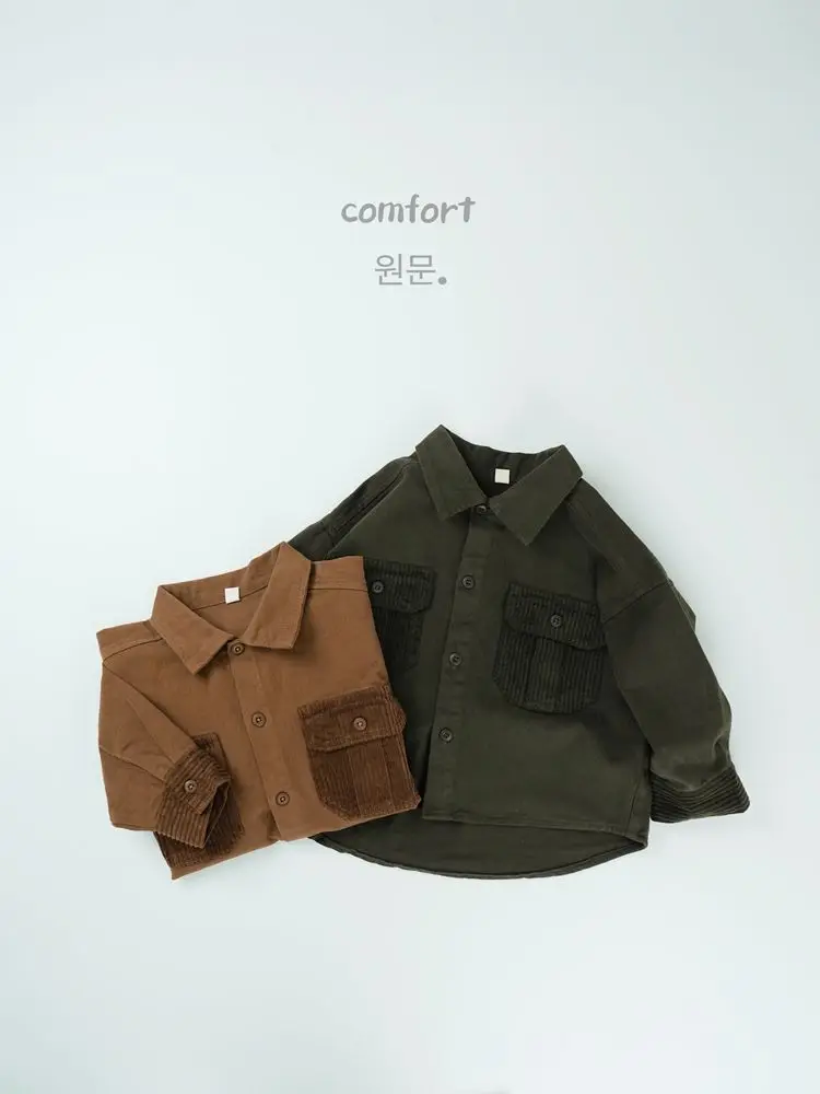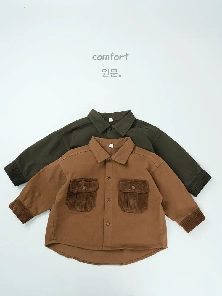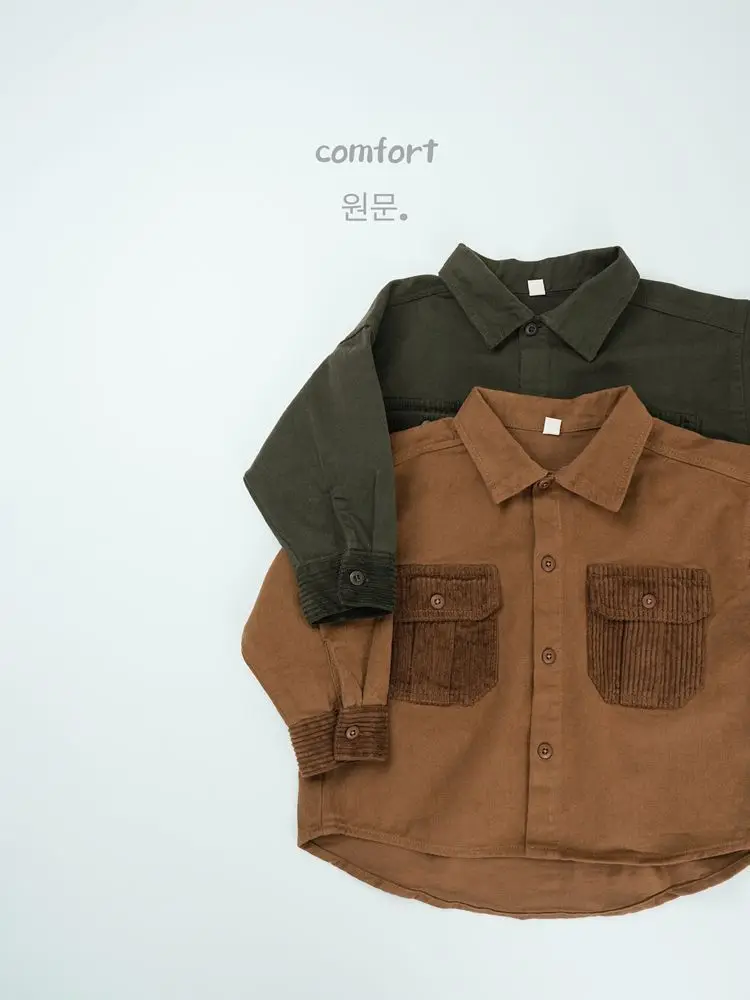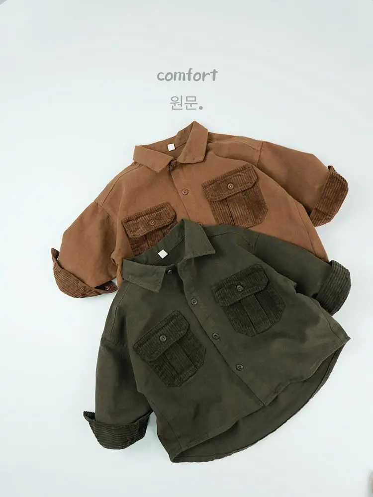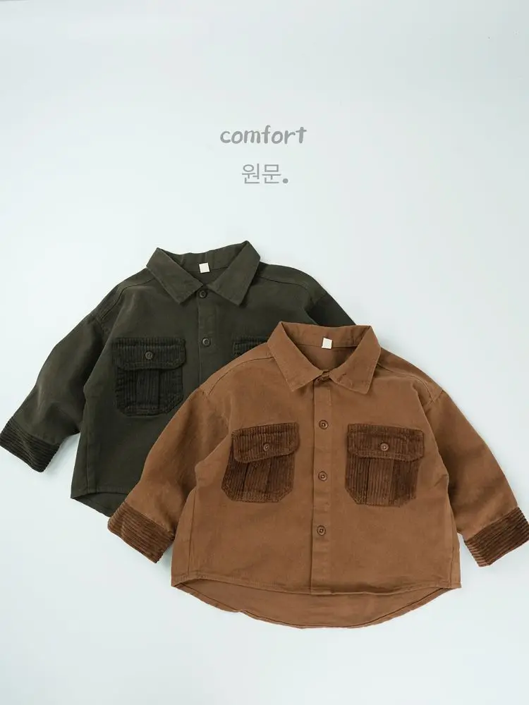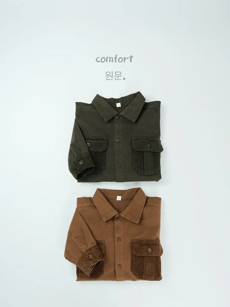 キッズトップス コーデュロイパッチワークポケットレトロ長袖シャツ【mh0007873】