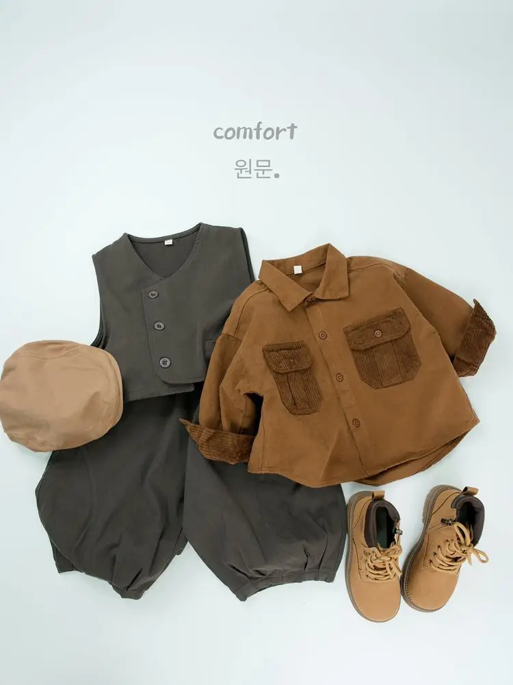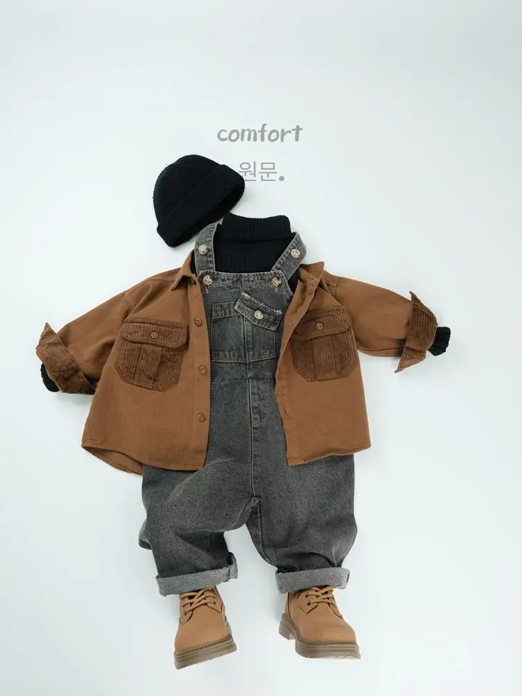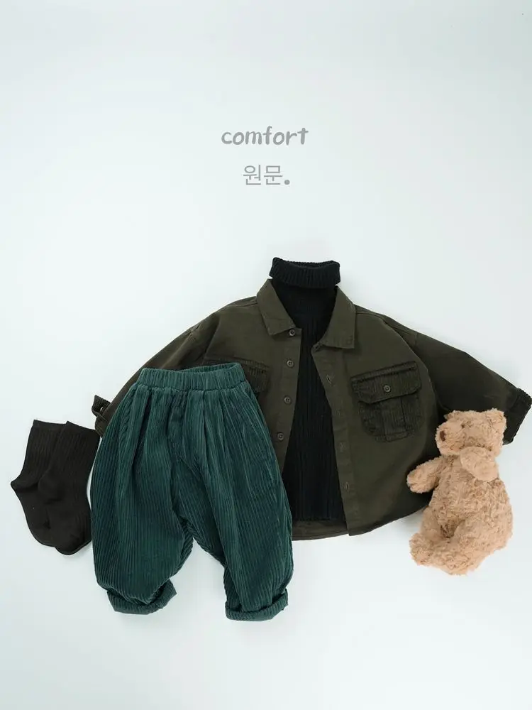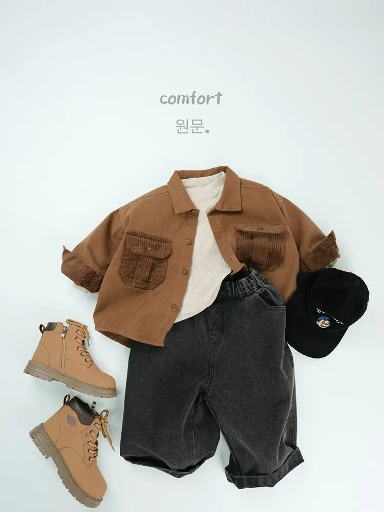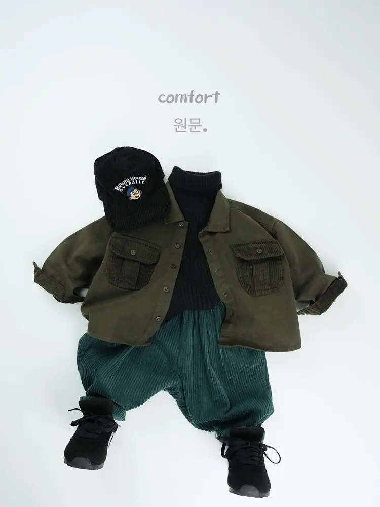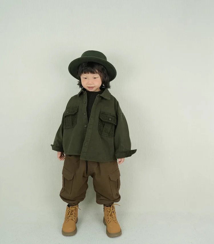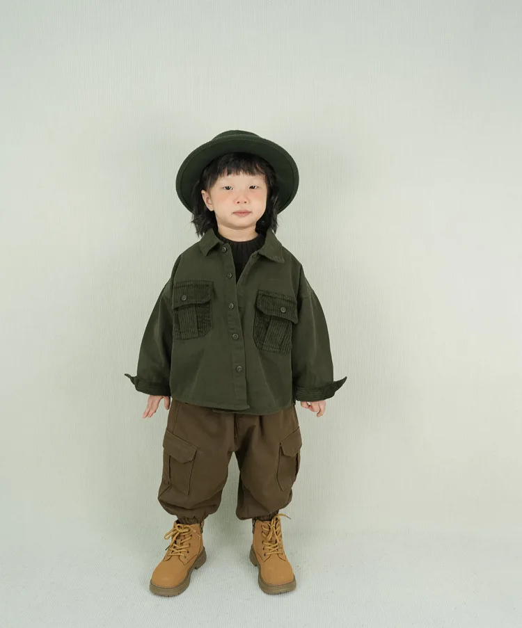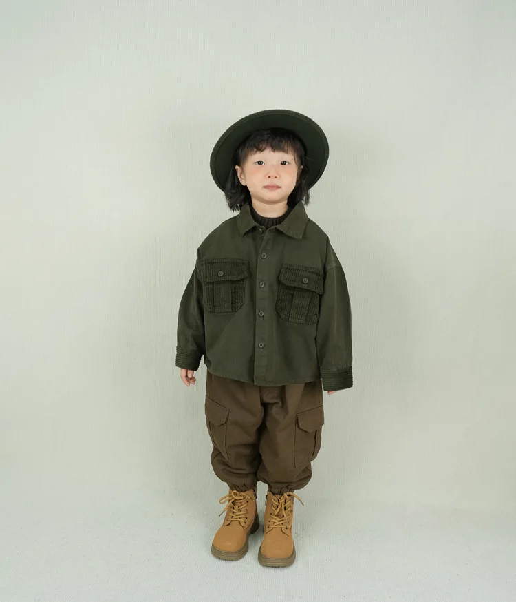 キッズトップス コーデュロイパッチワークポケットレトロ長袖シャツ【mh0007873】
