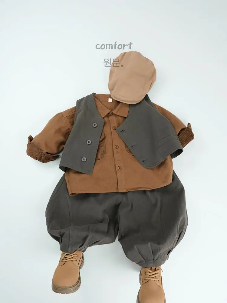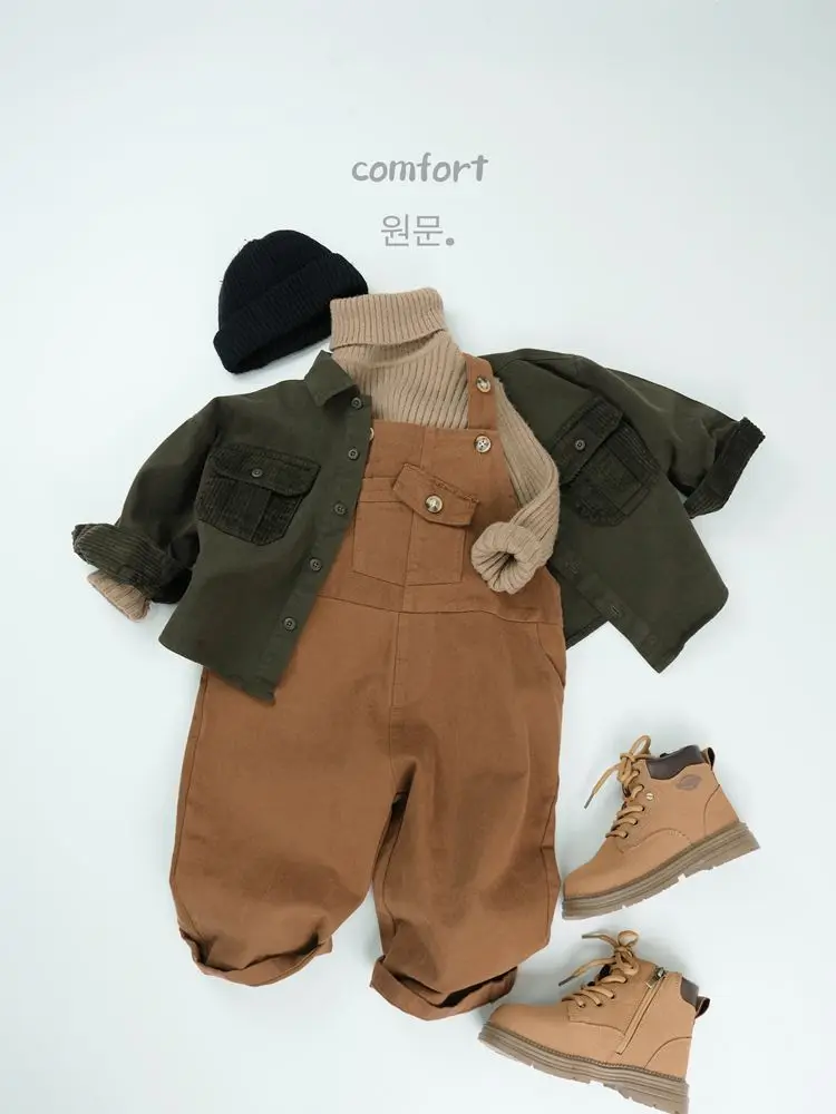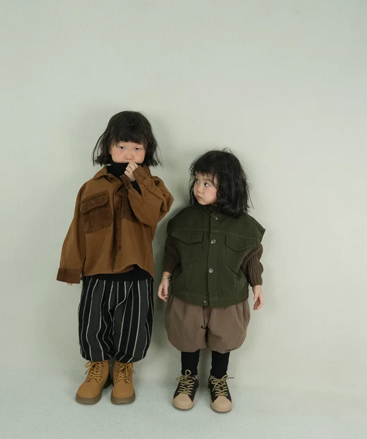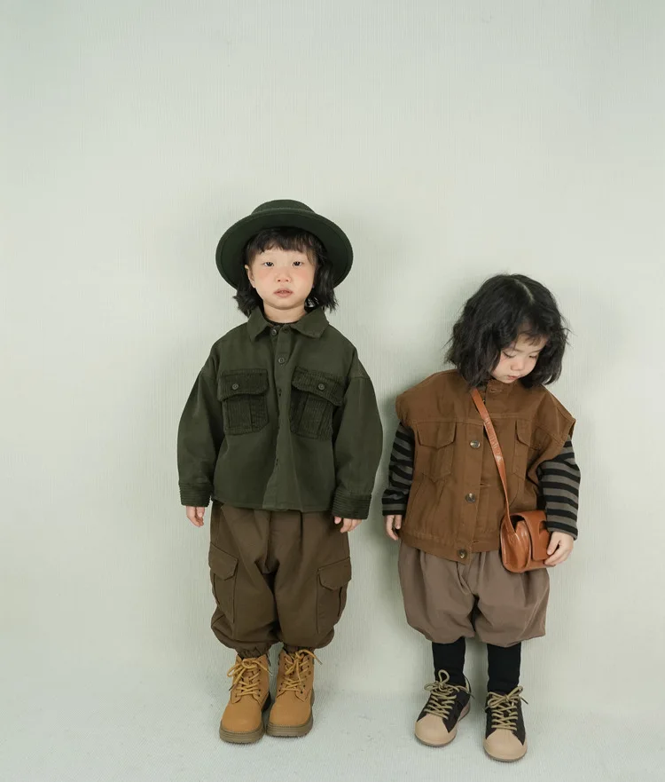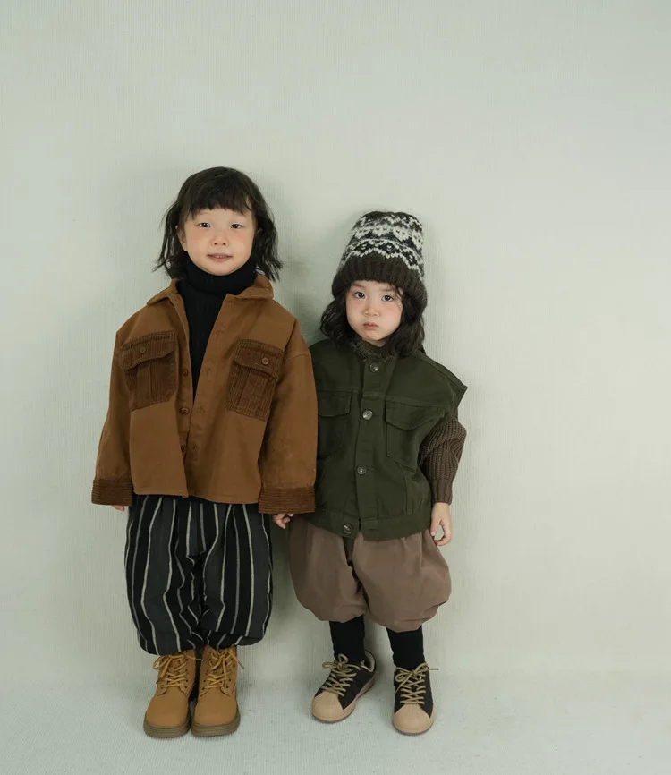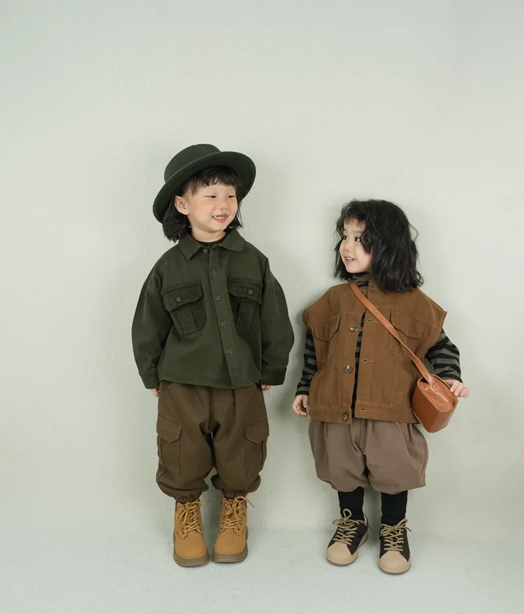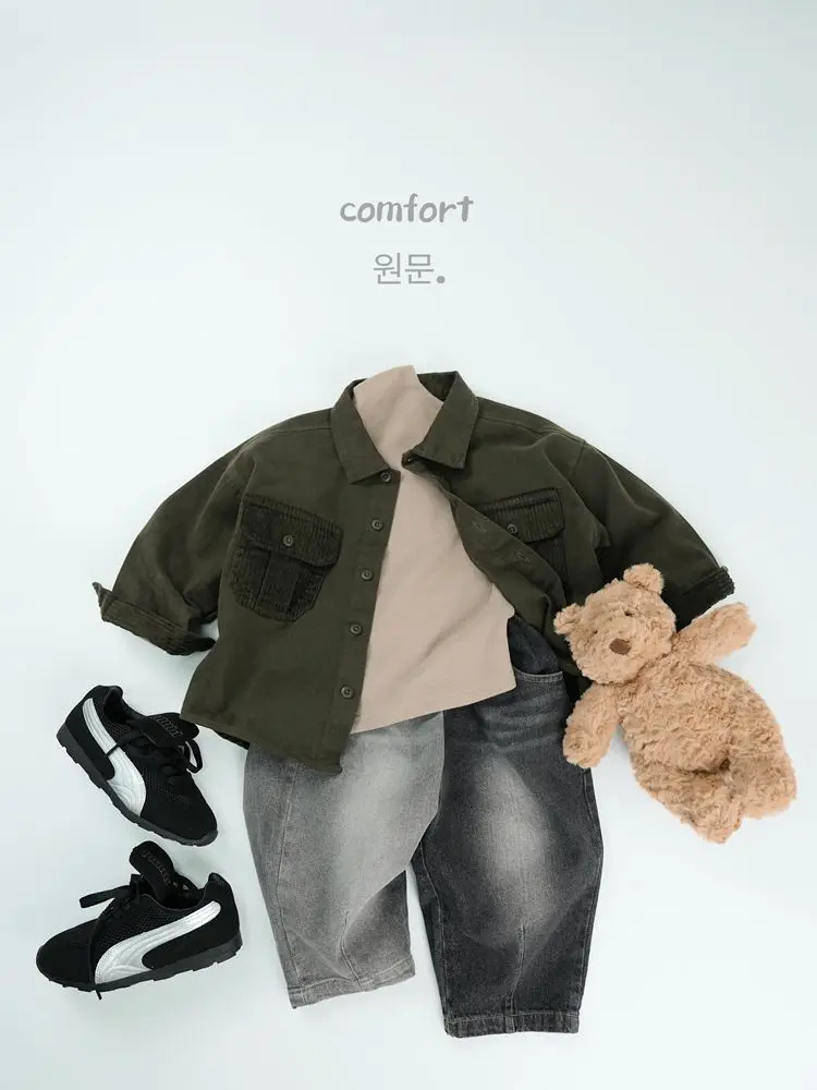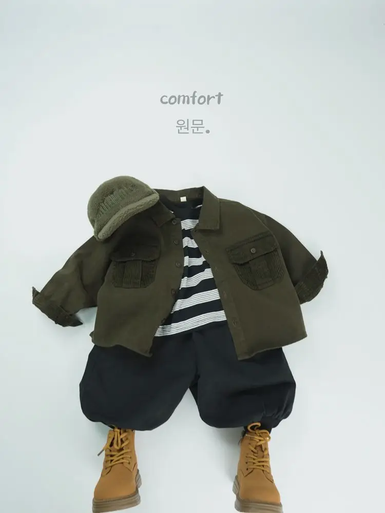 キッズトップス コーデュロイパッチワークポケットレトロ長袖シャツ【mh0007873】