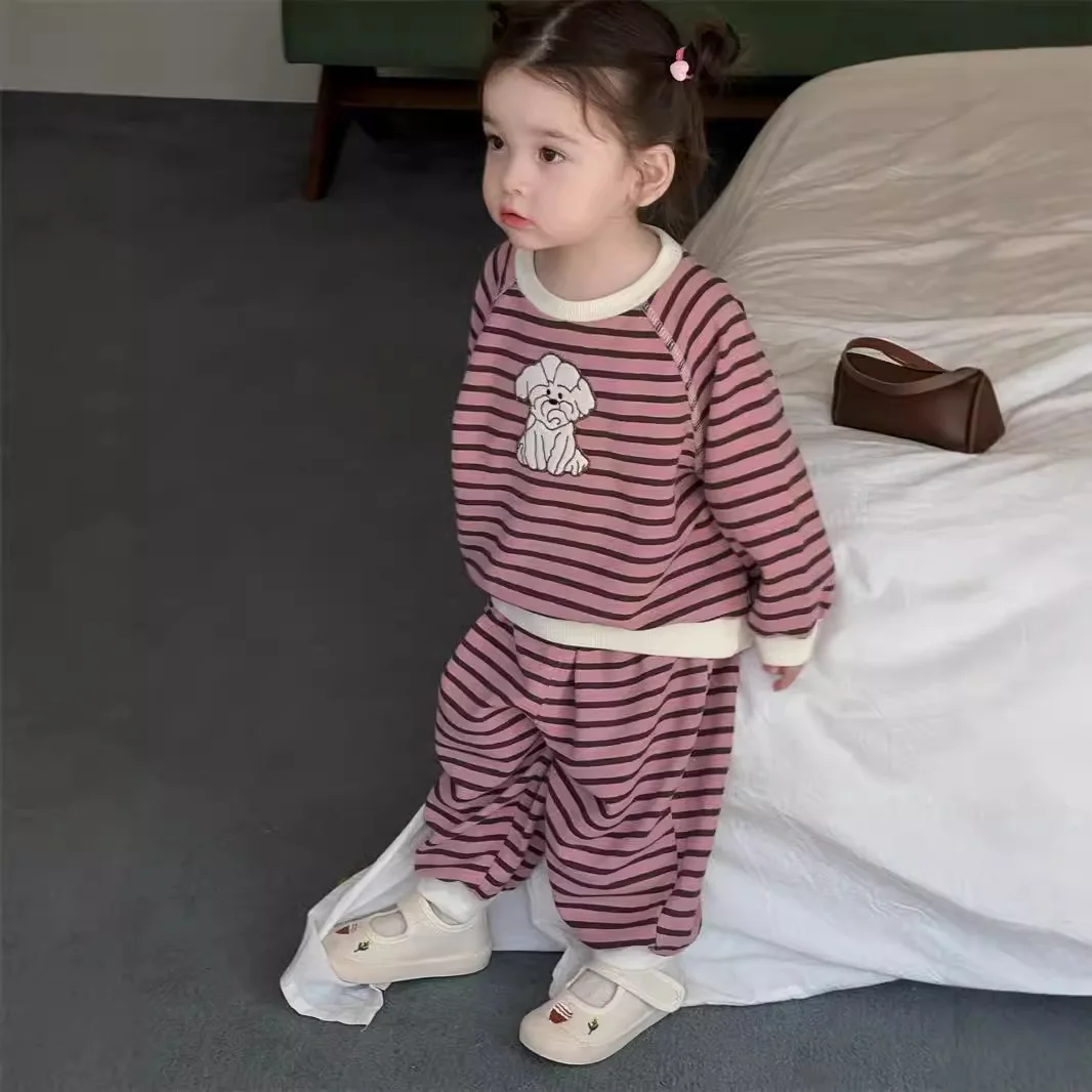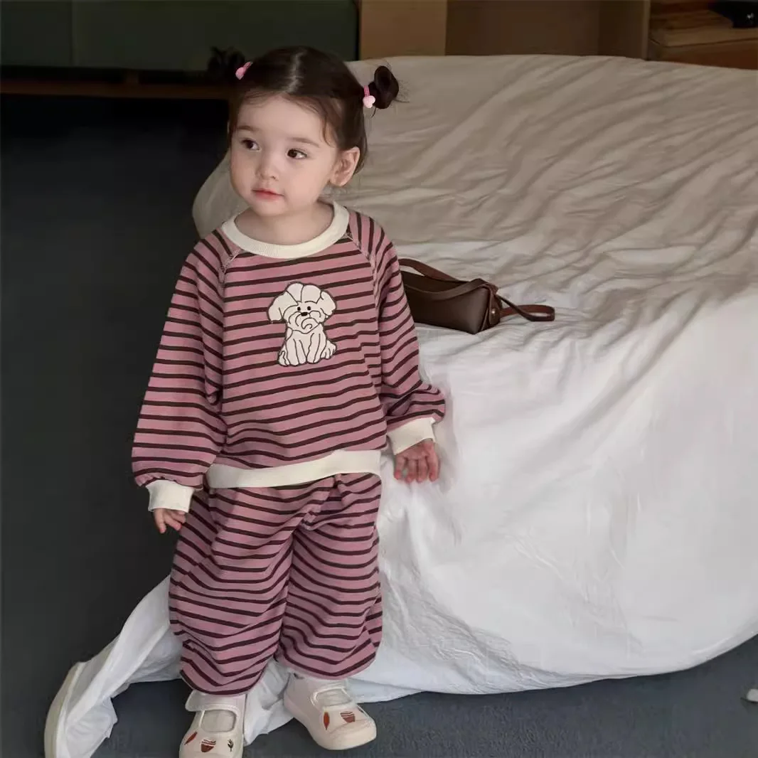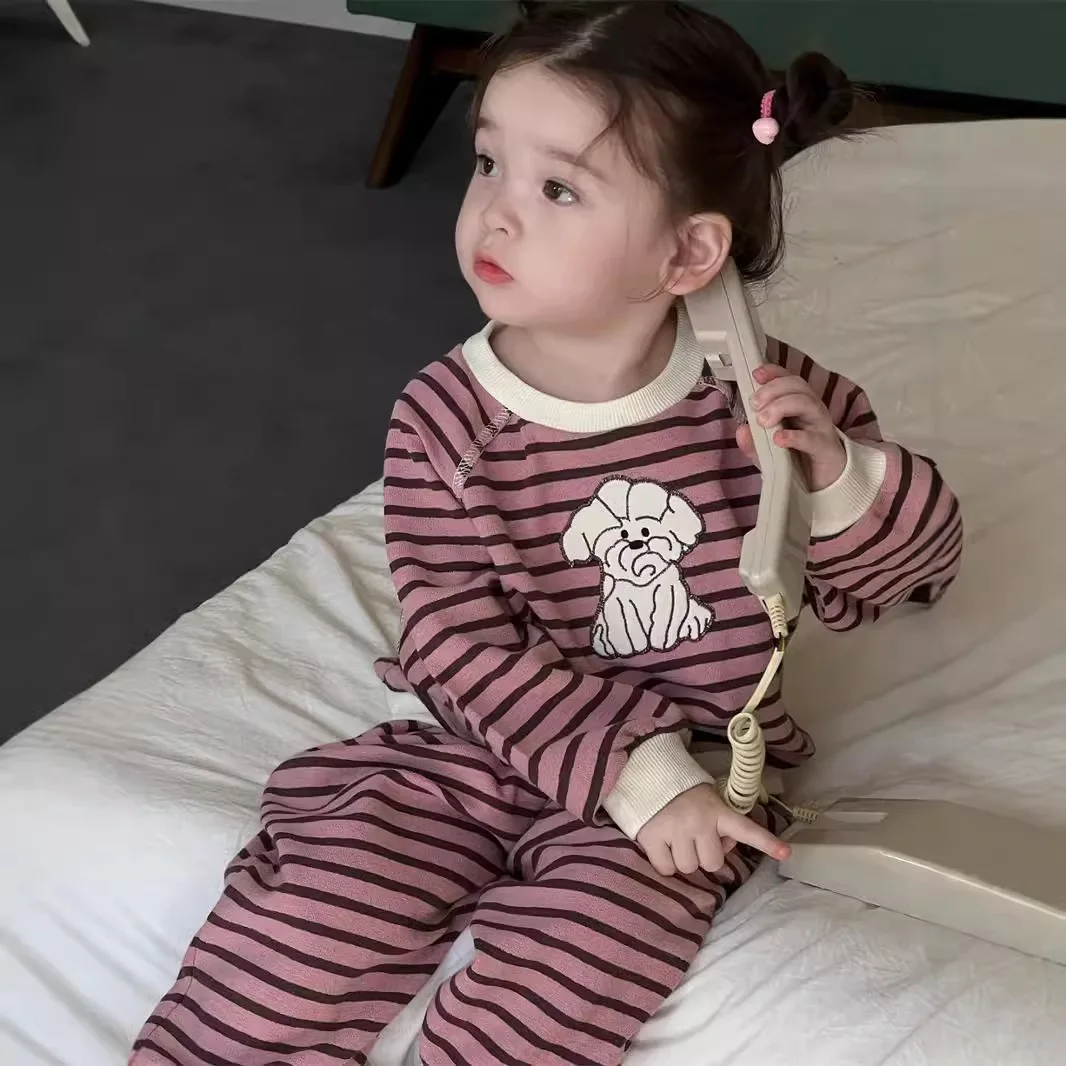 #ベビー服 #セットアップ #犬アップリケ #ボーダースウェット #長袖トップス #ロングパンツ #韓国子供服 #秋用ベビーウェア