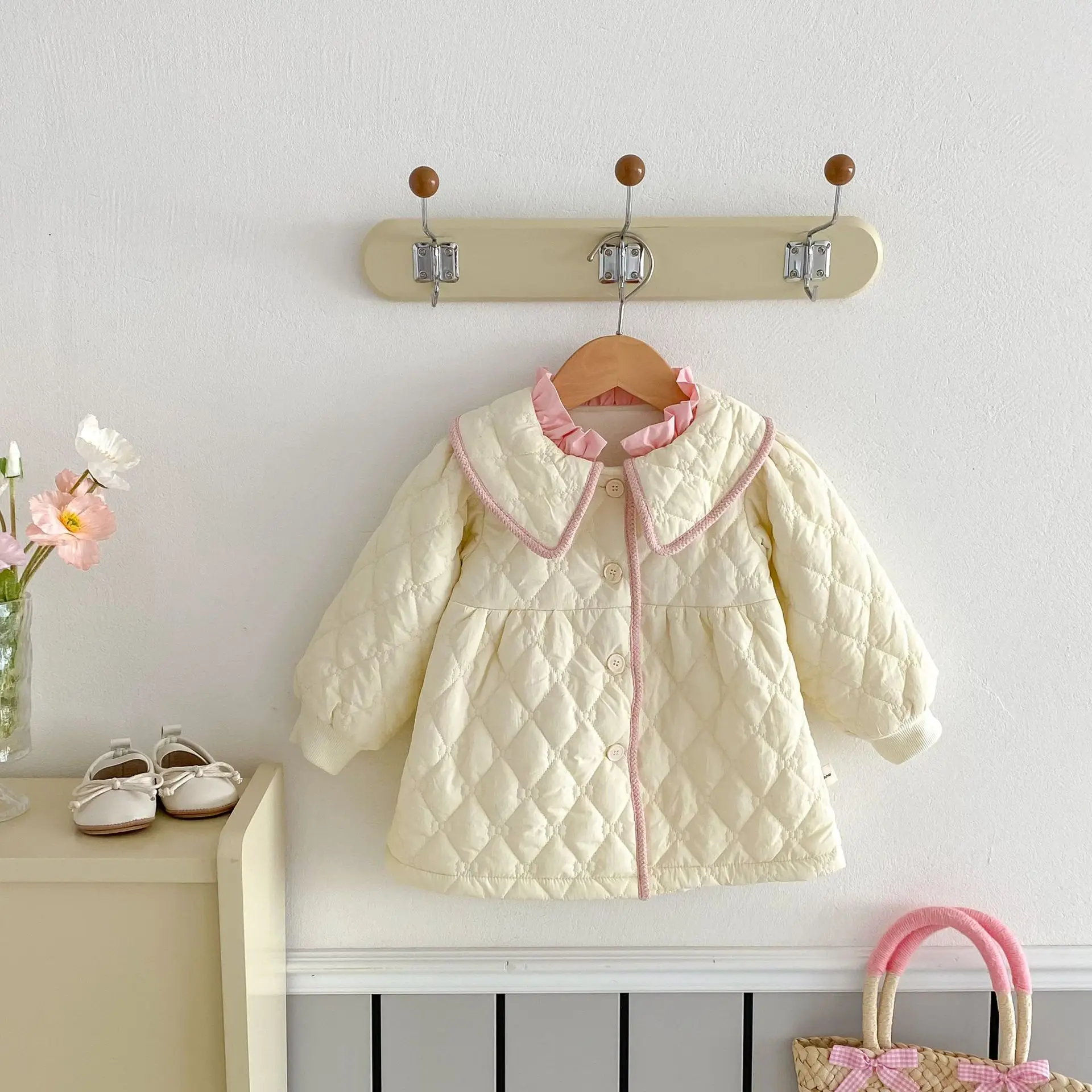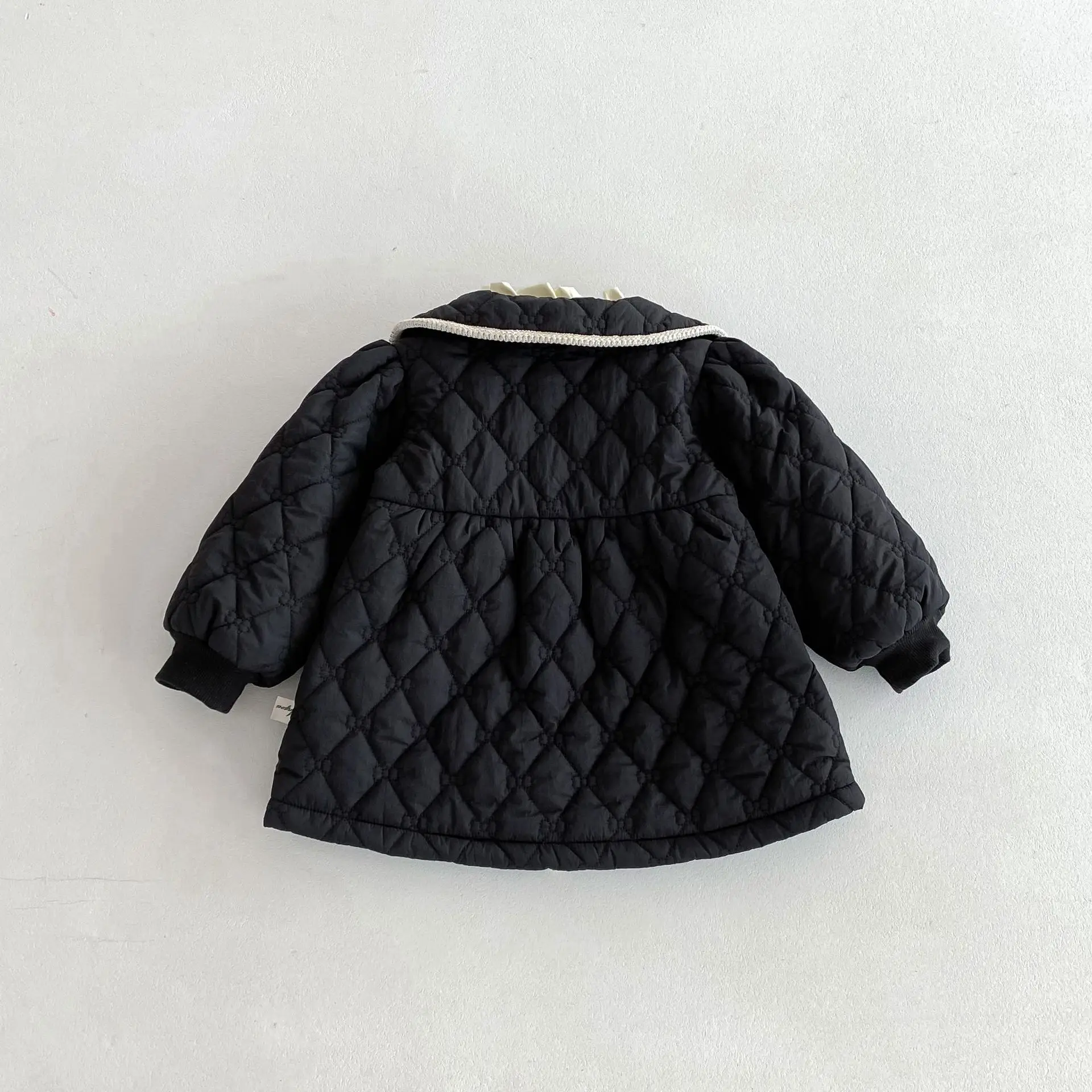キルティングデザインにフリース裏地を組み合わせたジャケットコートは、寒い季節に最適なアウターです。厚手のパッド入りで保温性が抜群、柔らかなフリースが快適な着心地を提供します。シンプルなデザインながらも可愛らしい襟がアクセントとなり、日常のカジュアルなコーディネートにも、特別な日の装いにも合わせやすい一着です。動きやすさを考慮した軽量設計で、小さなお子様も快適に過ごせます。