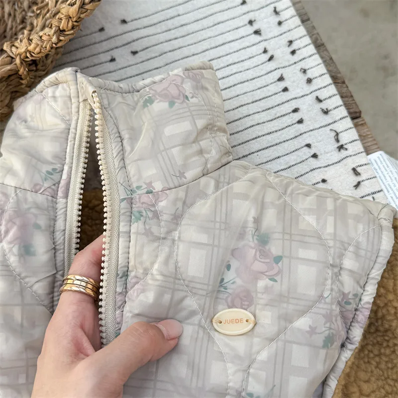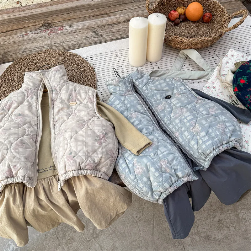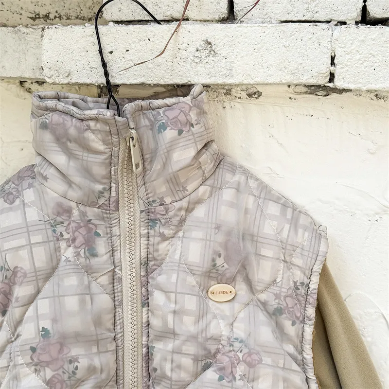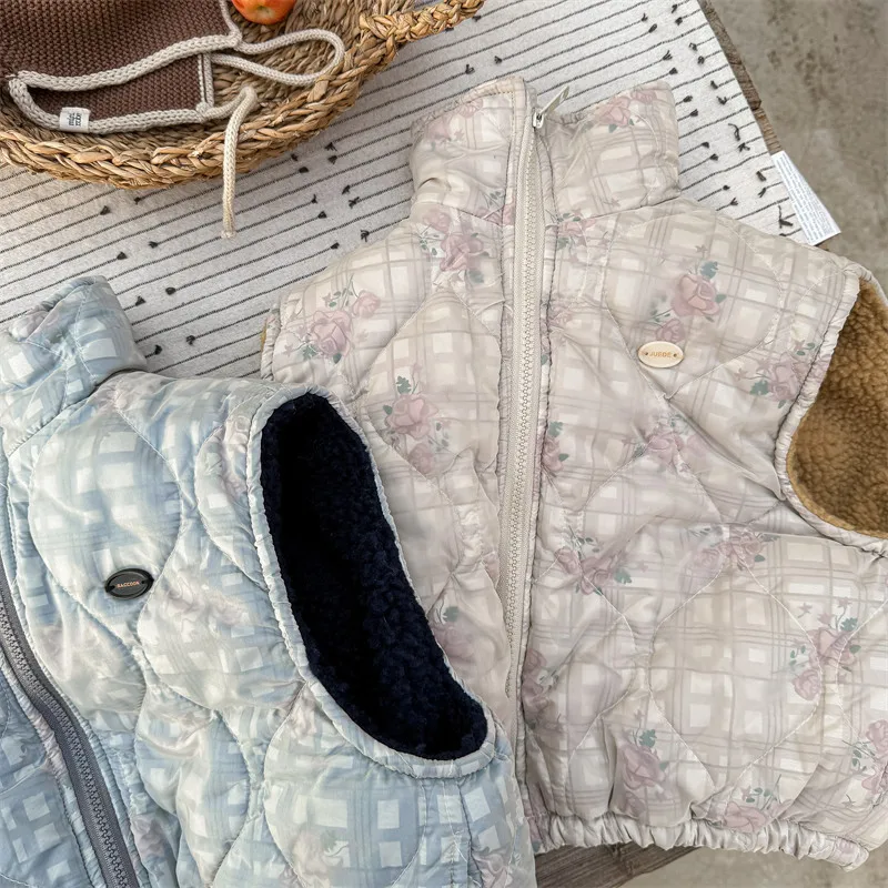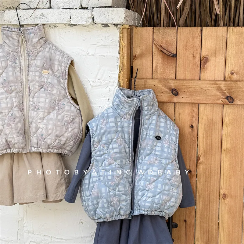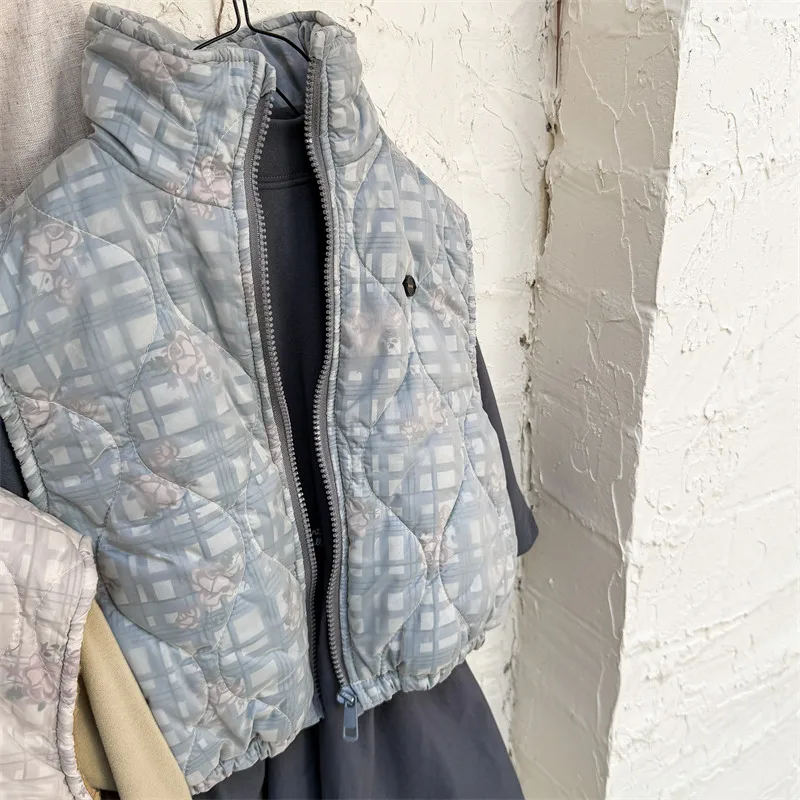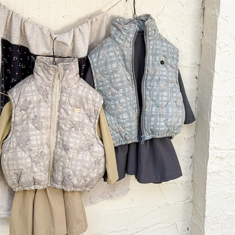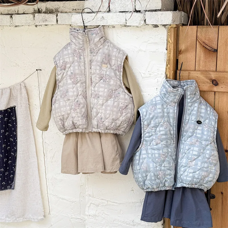 #キッズベスト #フラワーチェック柄 #ジップアップベスト #防寒対策 #おしゃれ子供服 #冬コーデ #ノースリーブ