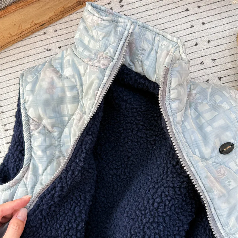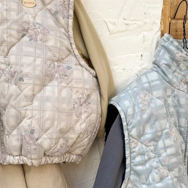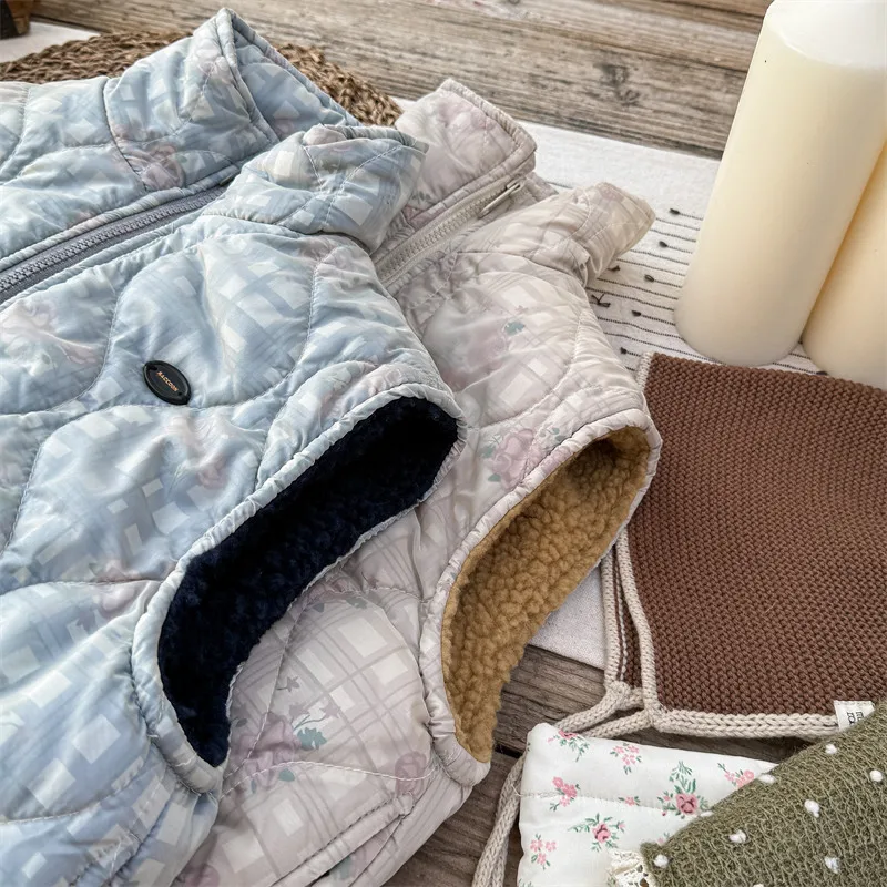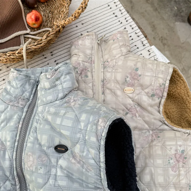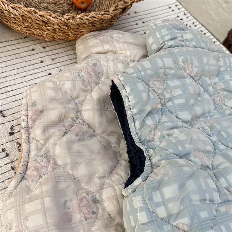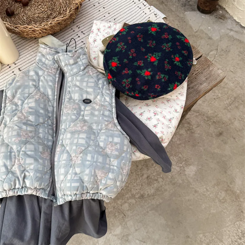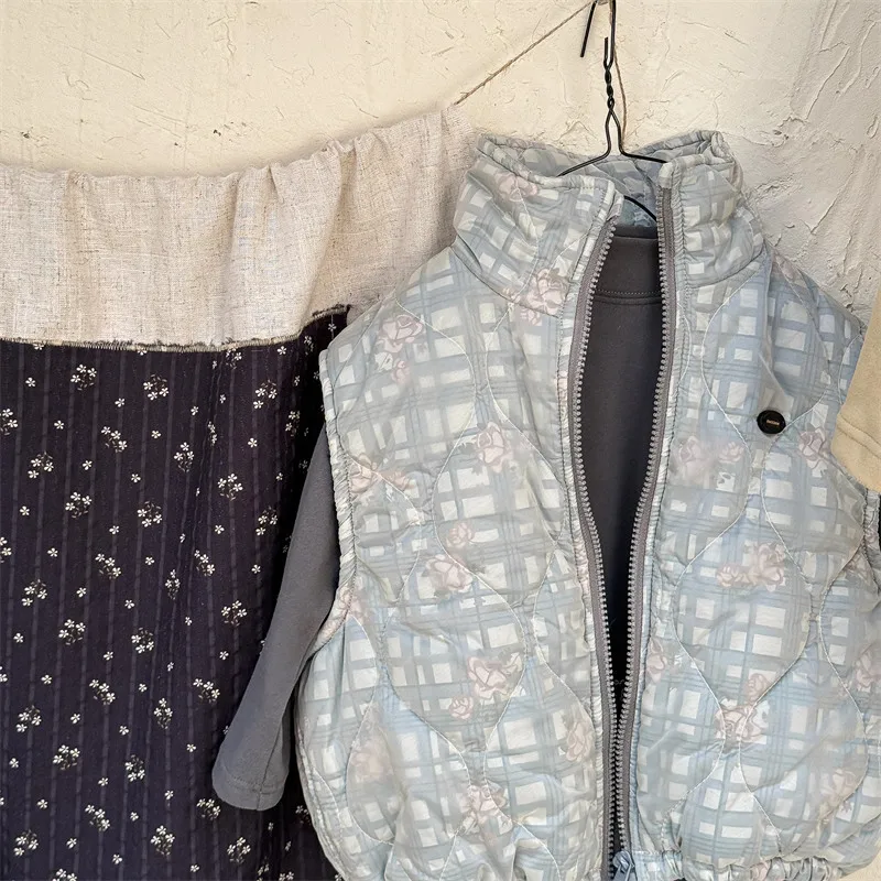 #キッズベスト #フラワーチェック柄 #ジップアップベスト #防寒対策 #おしゃれ子供服 #冬コーデ #ノースリーブ