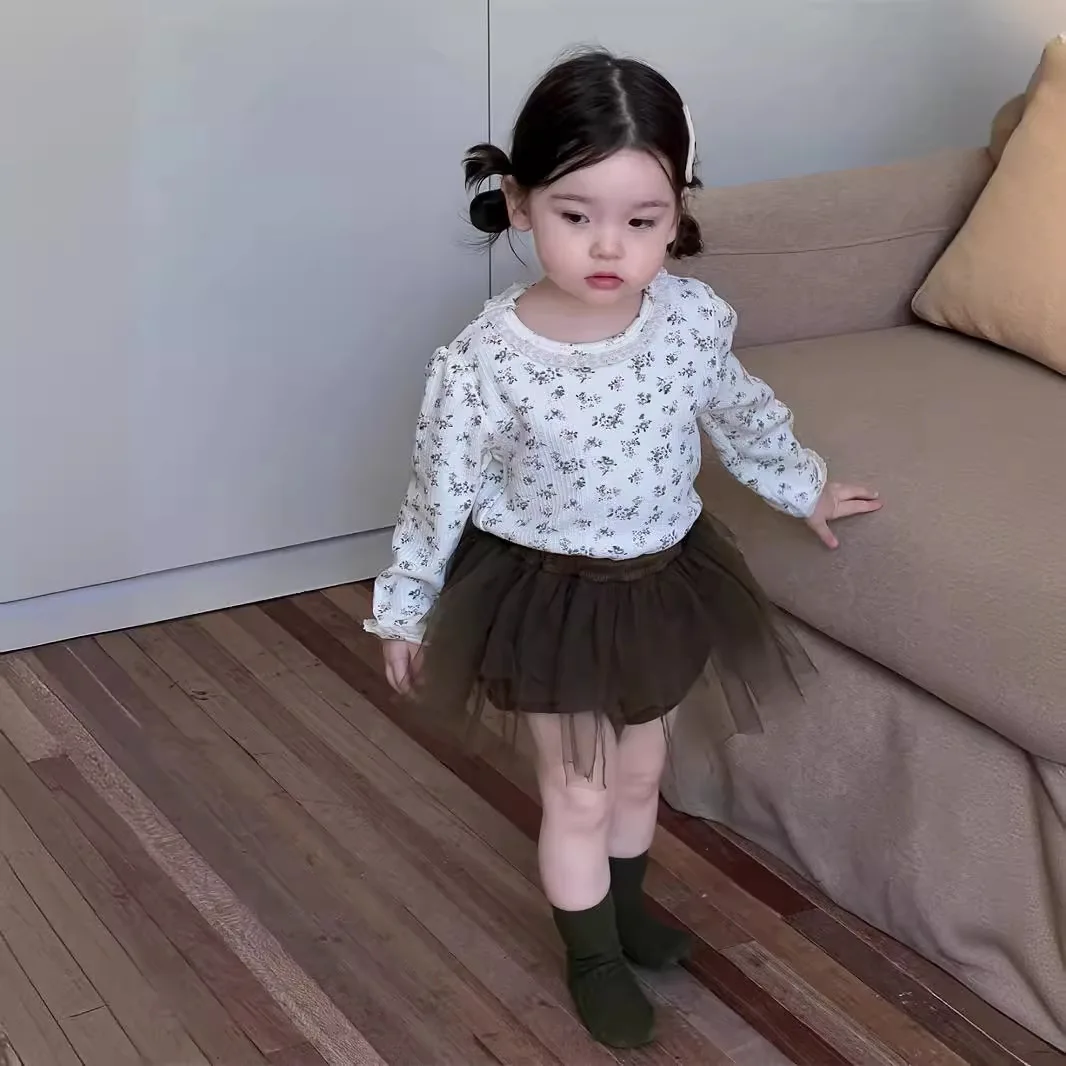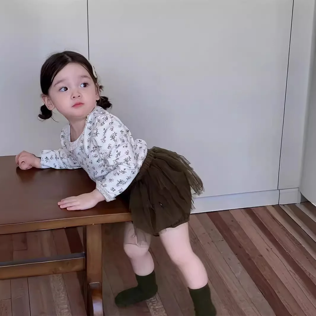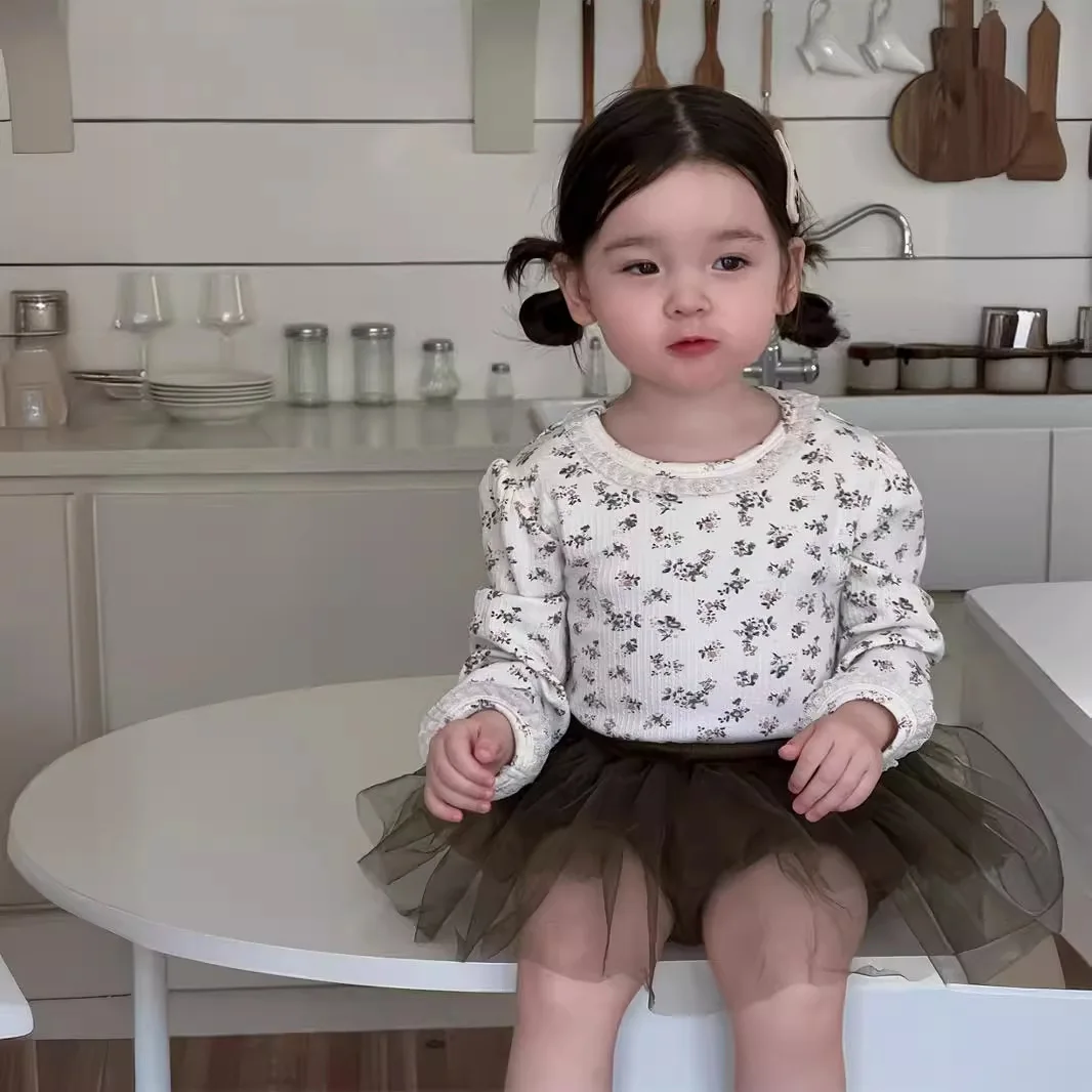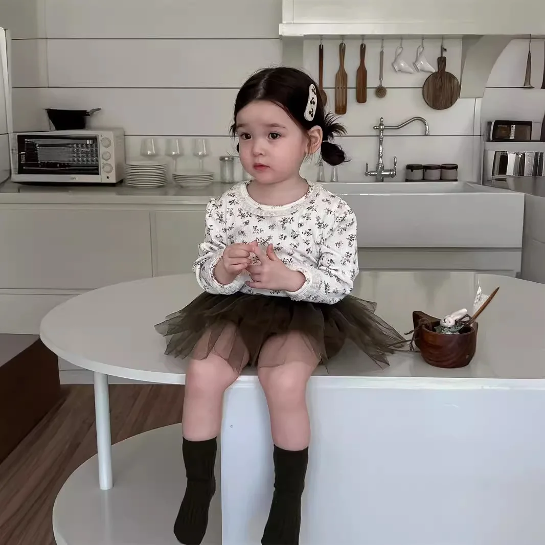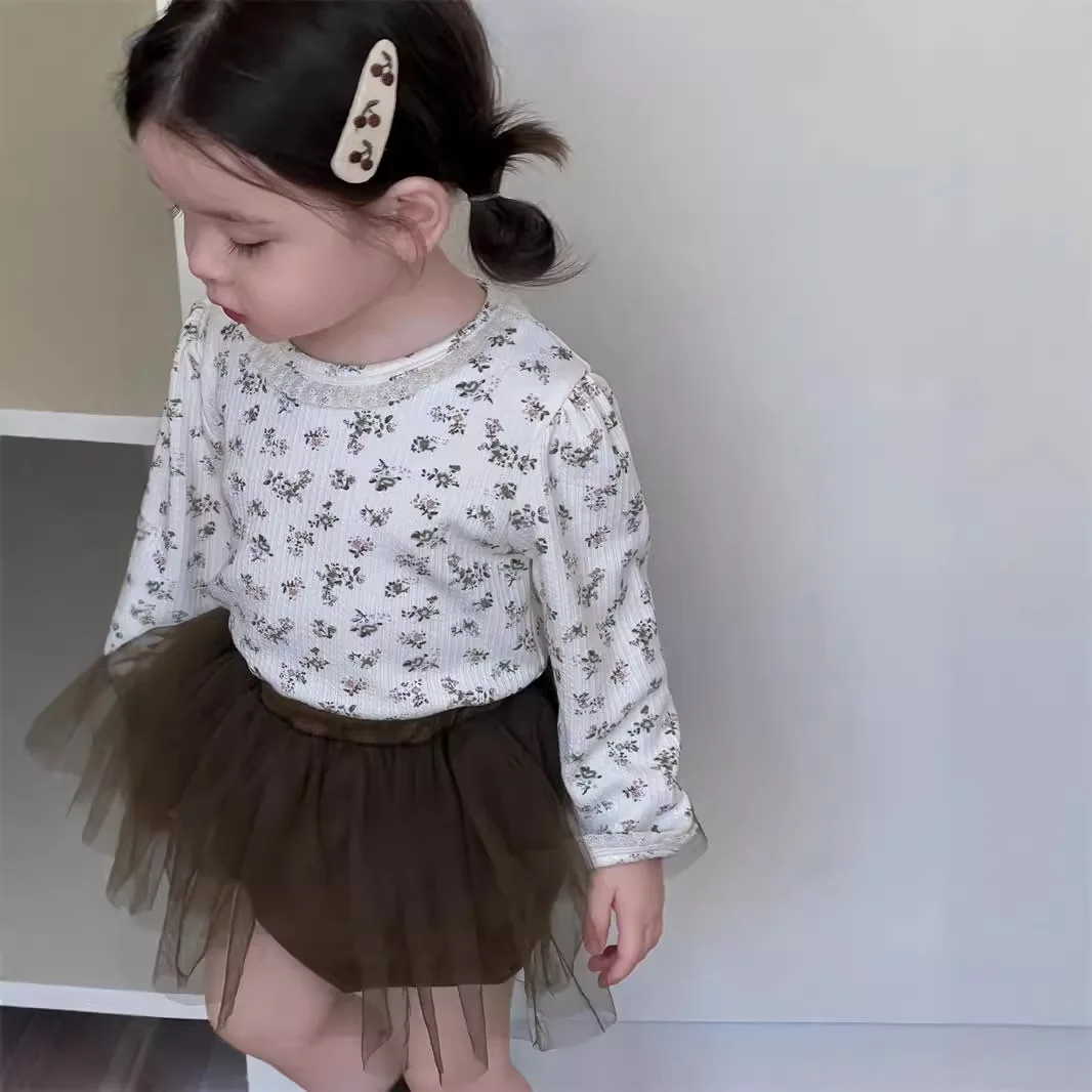 ベビートップス/パンツ フラワー小花柄プリント長袖Tシャツ/チュチュチュールスカートドッキングショートパンツ【mh0008306】