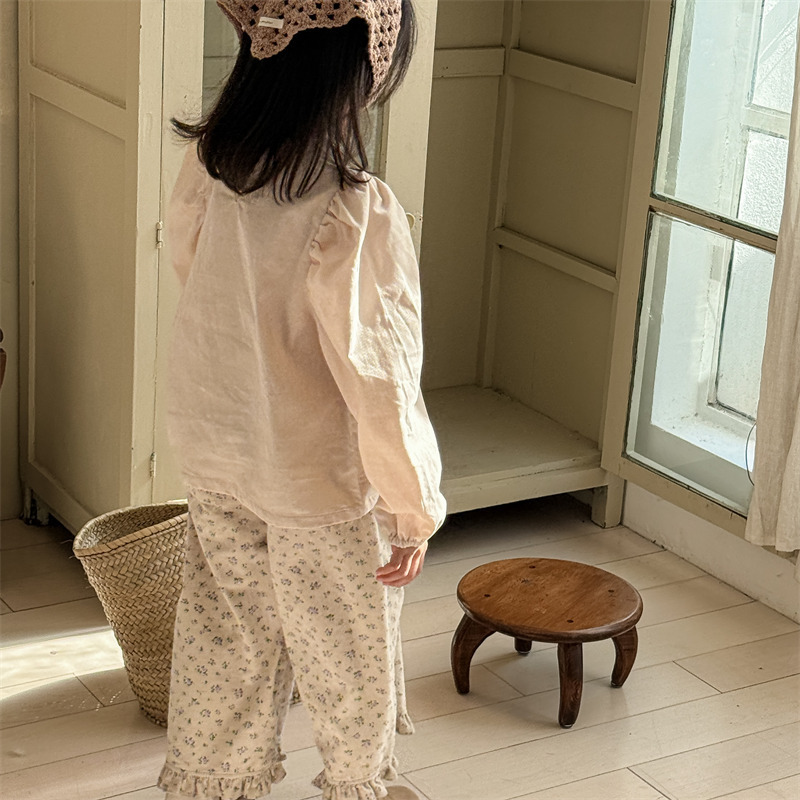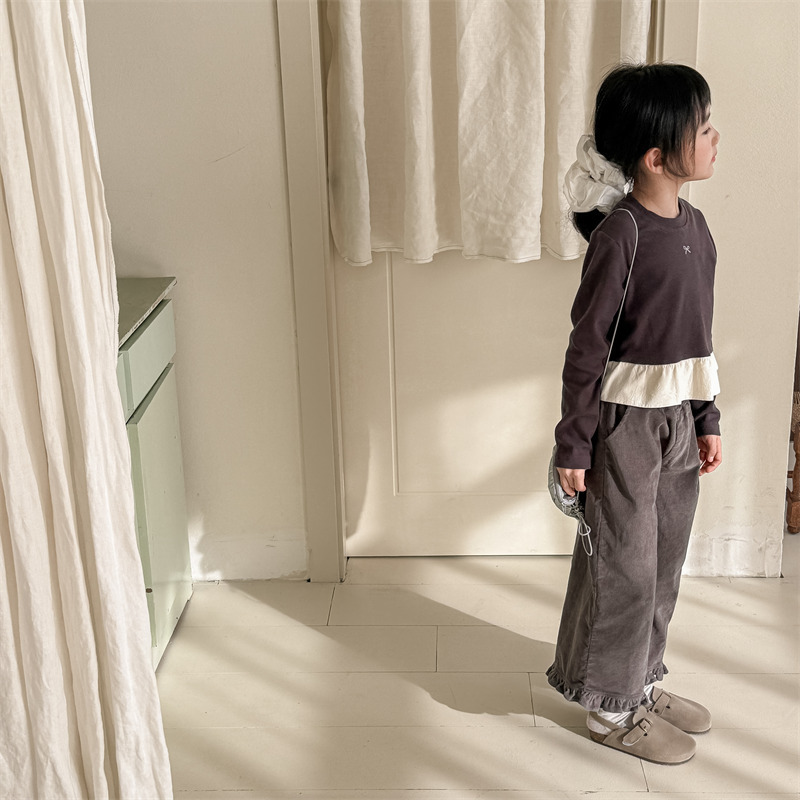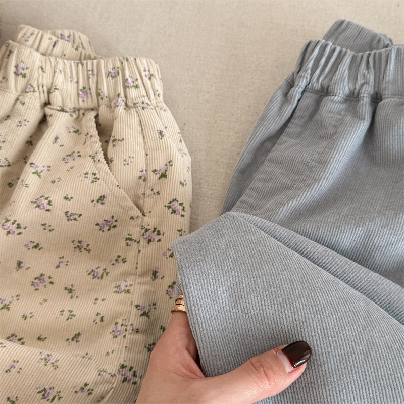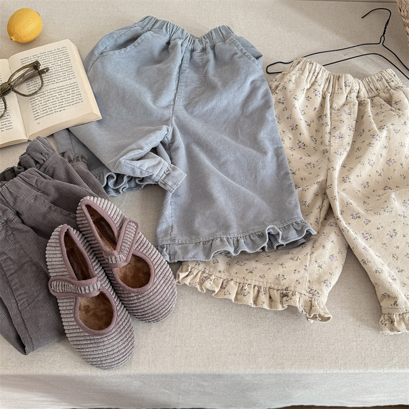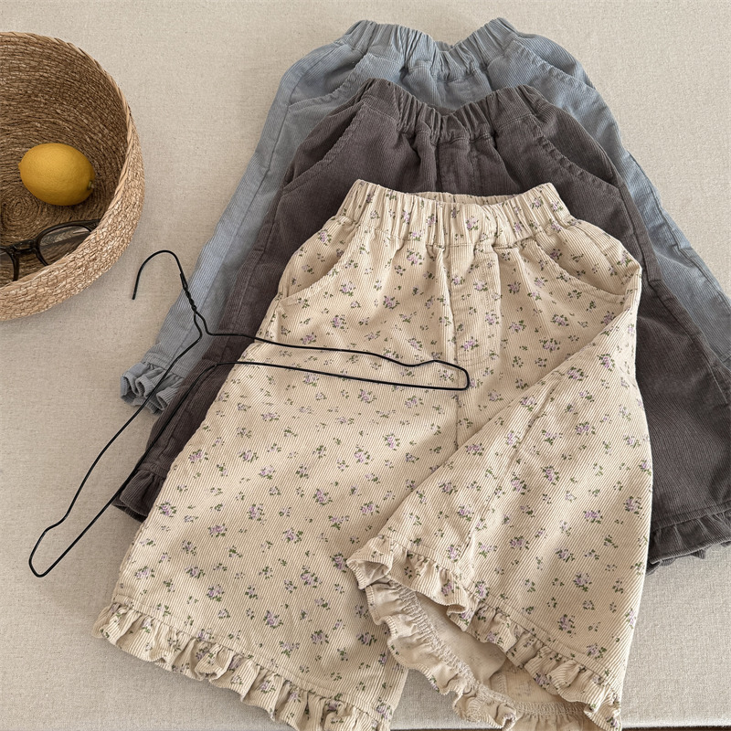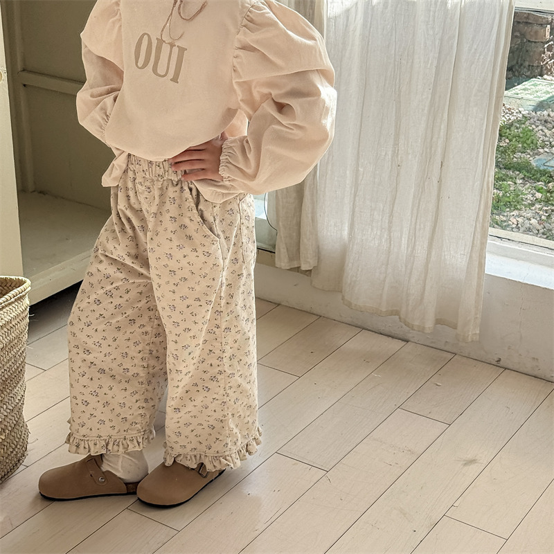 キッズパンツ フラワープリント裾フリルワイドルーズロングパンツ【mh0008980】