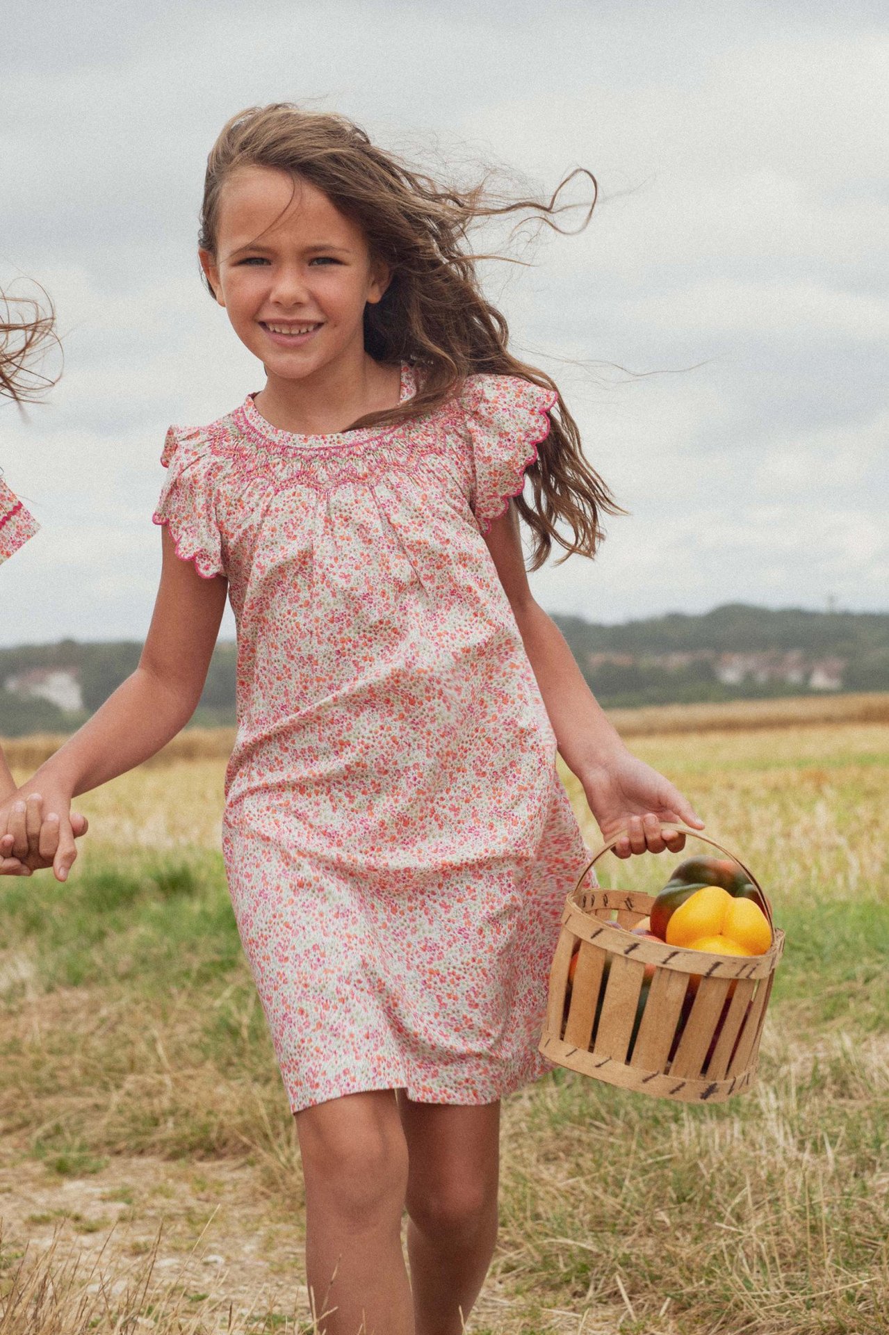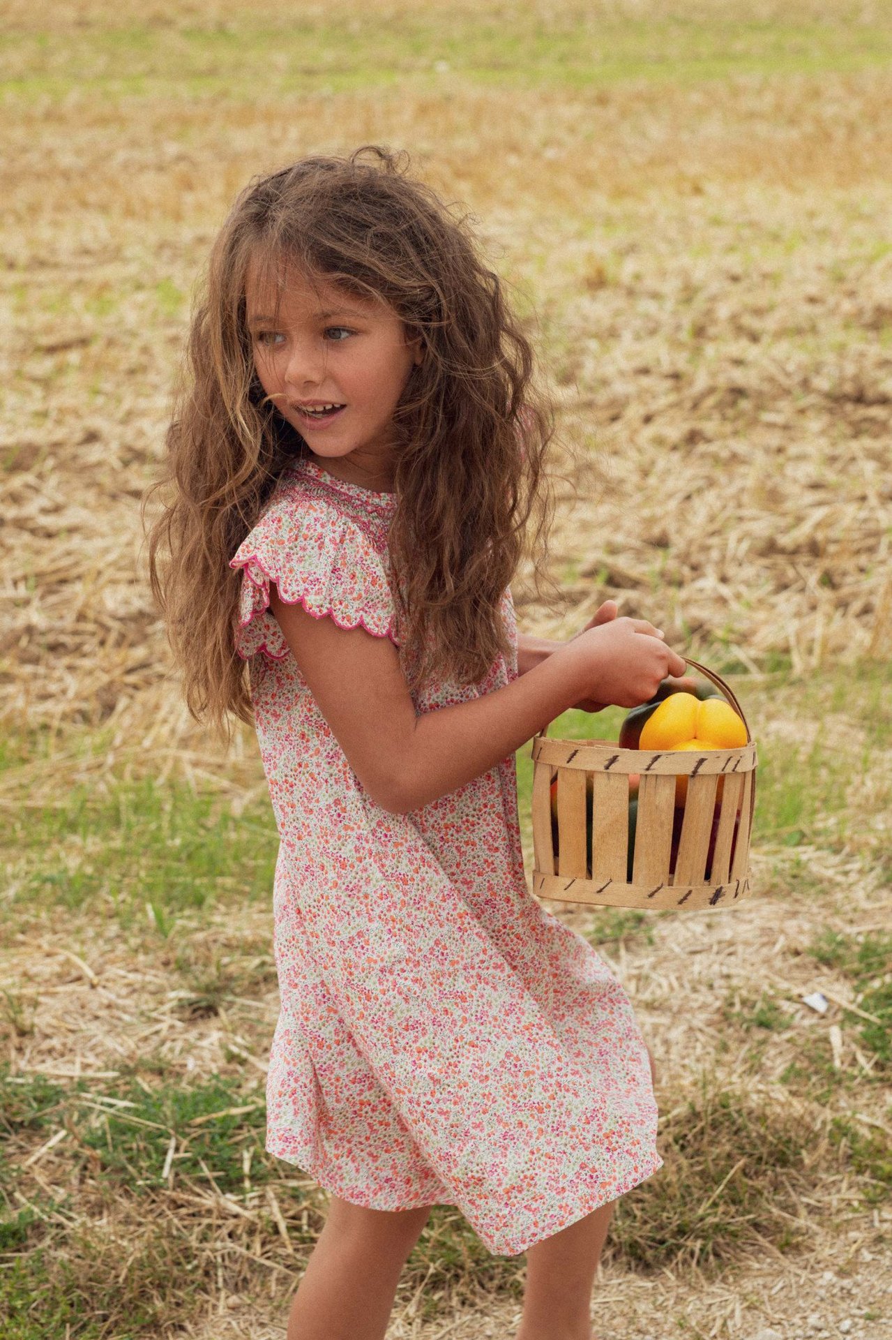 鮮やかな赤色のフラワープリントが特徴のノースリーブワンピースです。軽やかで柔らかな素材を使用しており、夏の暑い日でも快適に着用できます。フリルスリーブのデザインが可愛らしさを引き立て、パステル調の花柄が柔らかな印象を与えます。ウエスト部分にはやさしいフィット感があり、ふんわりと広がるスカートが動くたびに揺れる美しいシルエットを演出。特別なお出かけやパーティーにもぴったりな、女の子のための一着です。