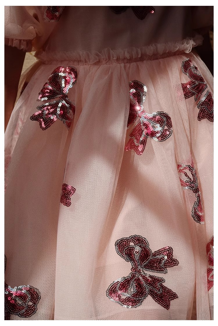 きらめくスパンコールリボンやレインボーとふんわり広がるチュールが目を引く、華やかな半袖ドレスワンピースです。プリンセスのようなシルエットで、特別な日の装いにもぴったり。やわらかなチュールと裏地付きのデザインで、肌あたりもやさしく快適です。ウエストのディテールがアクセントになり、写真映えも抜群。お祝いの場やお出かけシーンに活躍する一枚です。