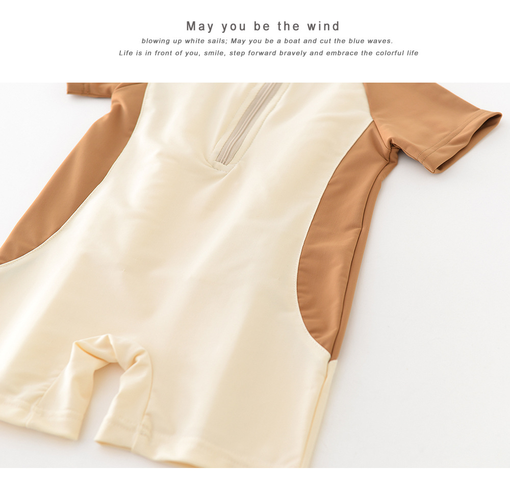 商品説明文とハッシュタグ 愛らしいくまのプリントが楽しい、ボーイズ向けの半袖つなぎスイムウェアです。夏のプールやビーチで、お子様の可愛らしさを演出します。フロントはジップアップ式で、着脱が簡単。半袖デザインなので、日焼け対策としても安心です。ベビーから幼児までのお子様に適した、肌触りの良い素材を使用しています。くまのイラストとカラーの切り替えデザインが、水遊びの時間をいっそう楽しく彩ります。活発なお子様の動きを妨げない、快適な着心地も魅力です。