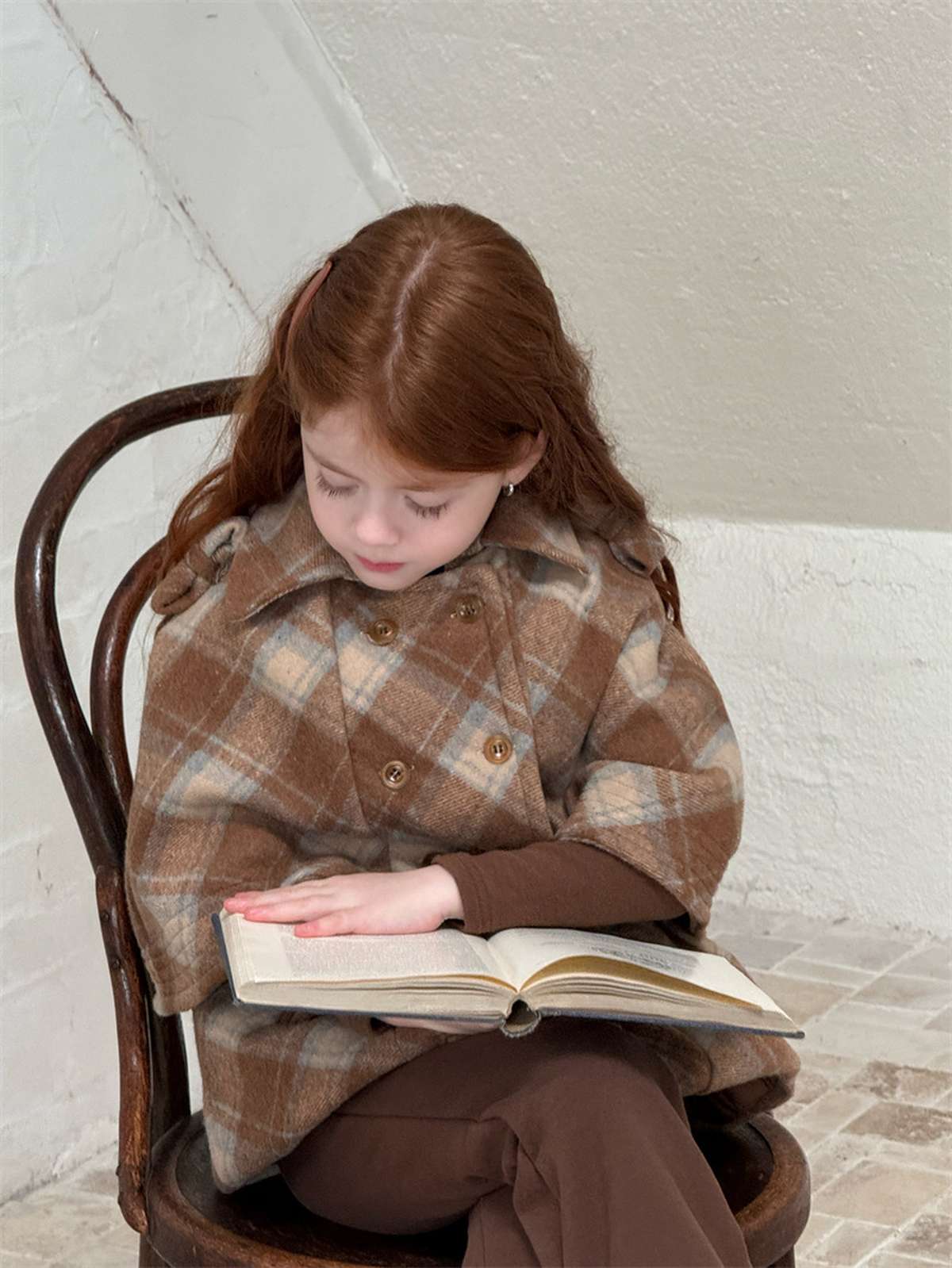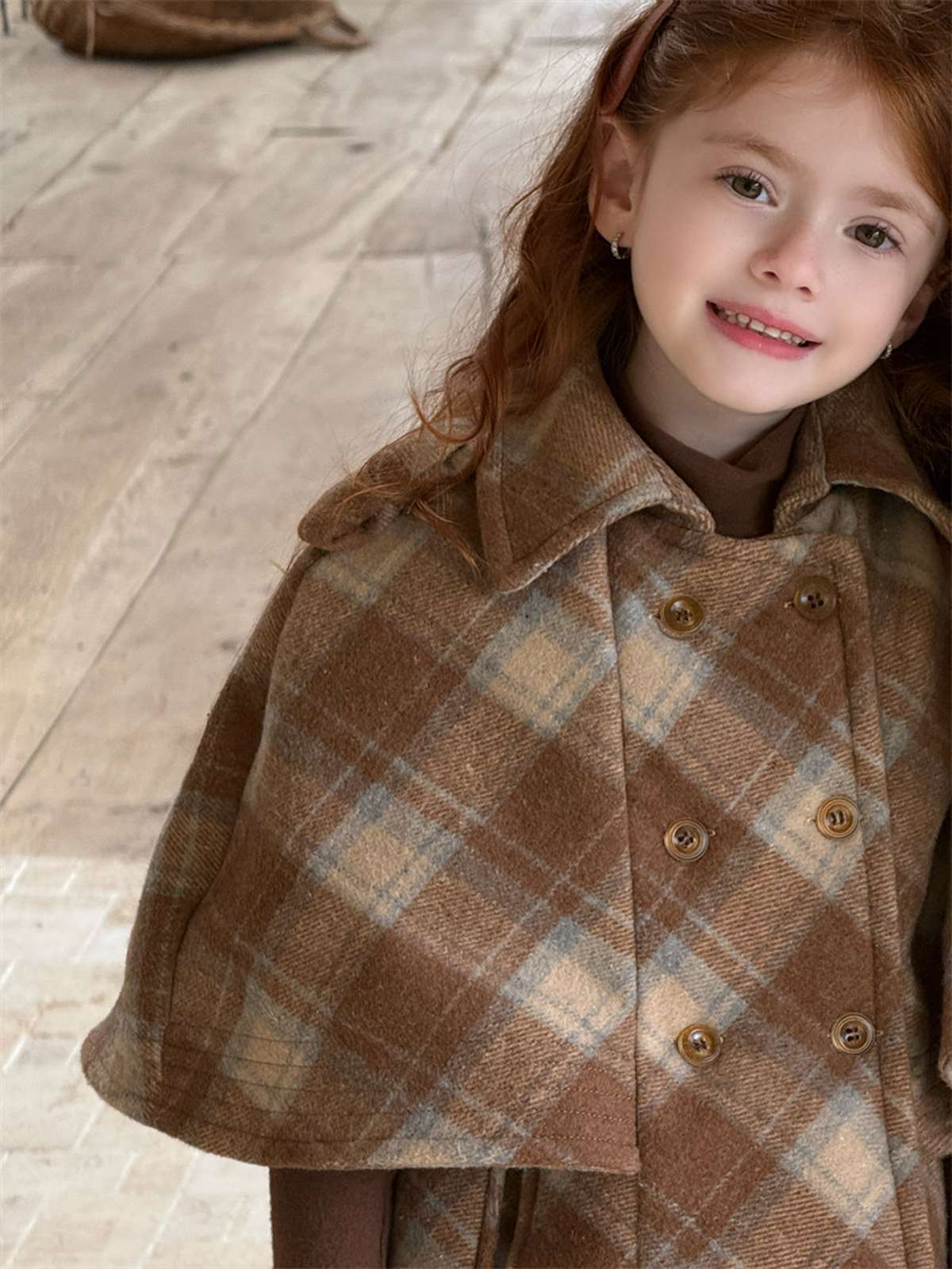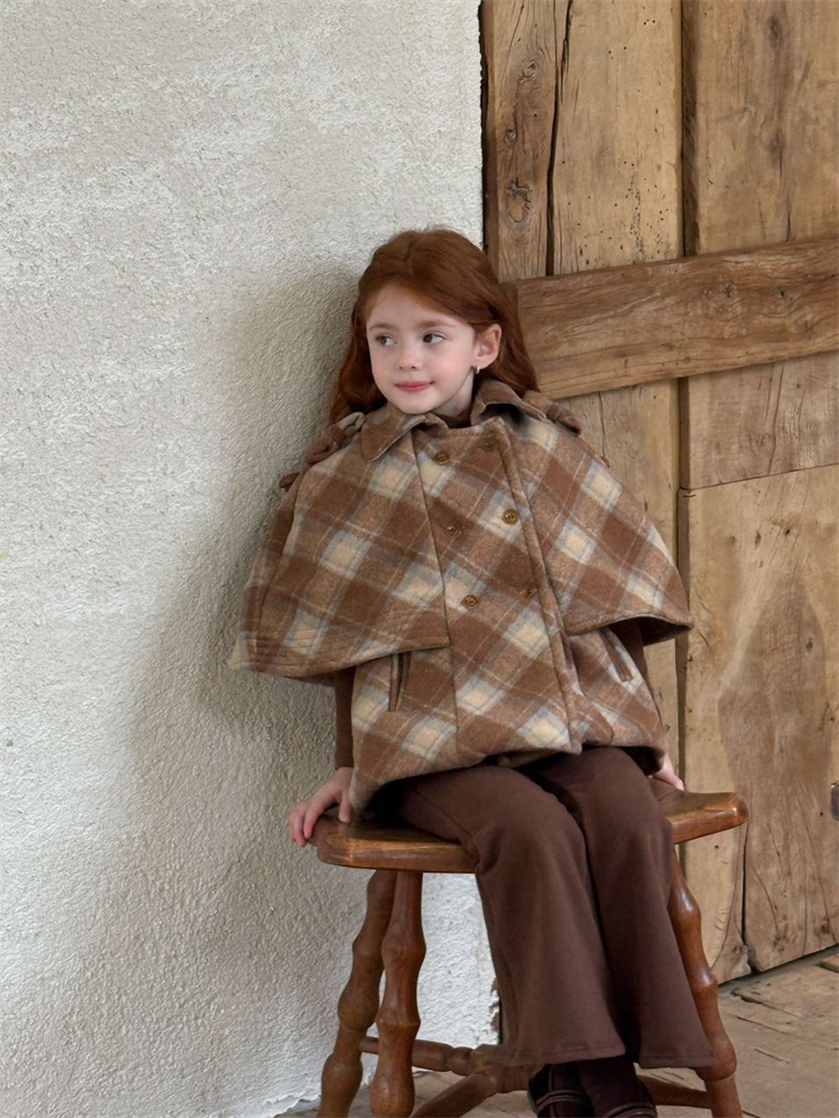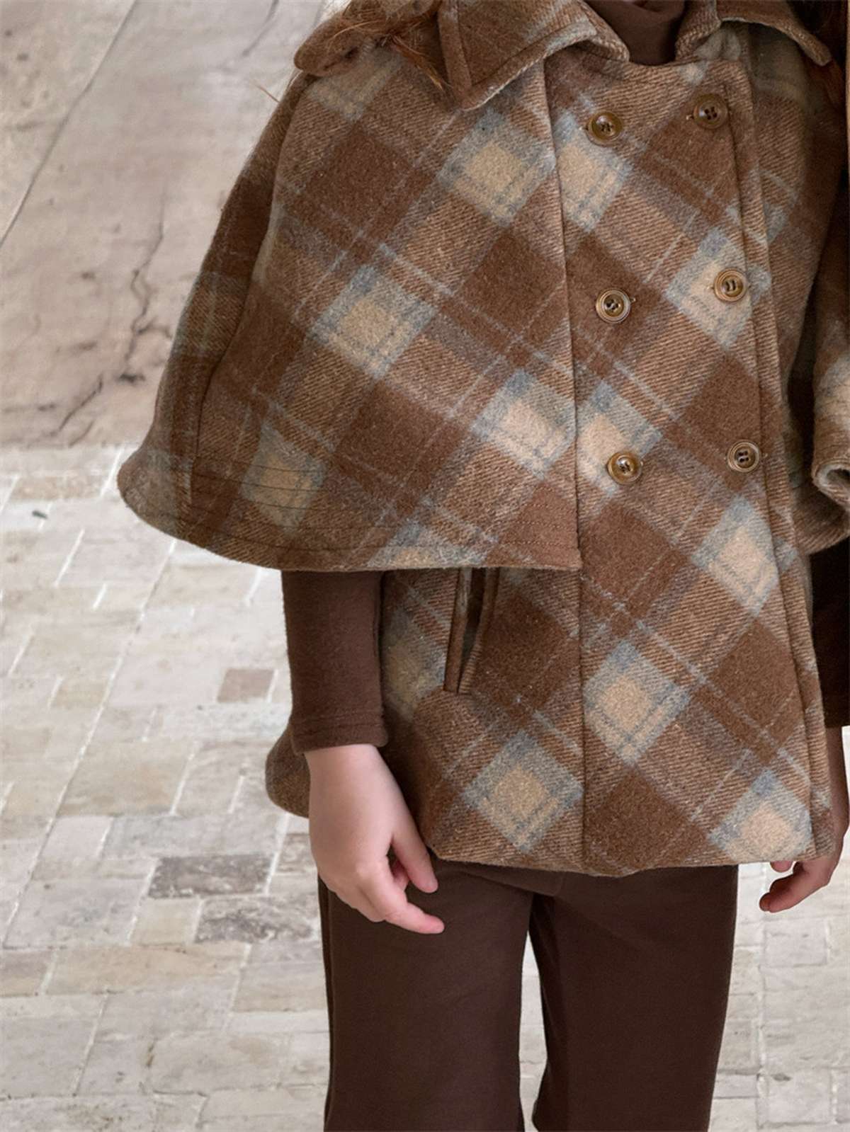 クラシカルなチェック柄が目を引く、マント風のケープデザインが特徴的なウール調アウターです。ダブルブレストの仕立てがフレンチシックなヴィンテージ感を演出し、お子様の着こなしを上品に彩ります。厚手の素材でしっかりと防寒性を備えたこのコートは、普段の子ども服を洗練されたスタイルへと導く、冬のドレスアップに欠かせない一着です。