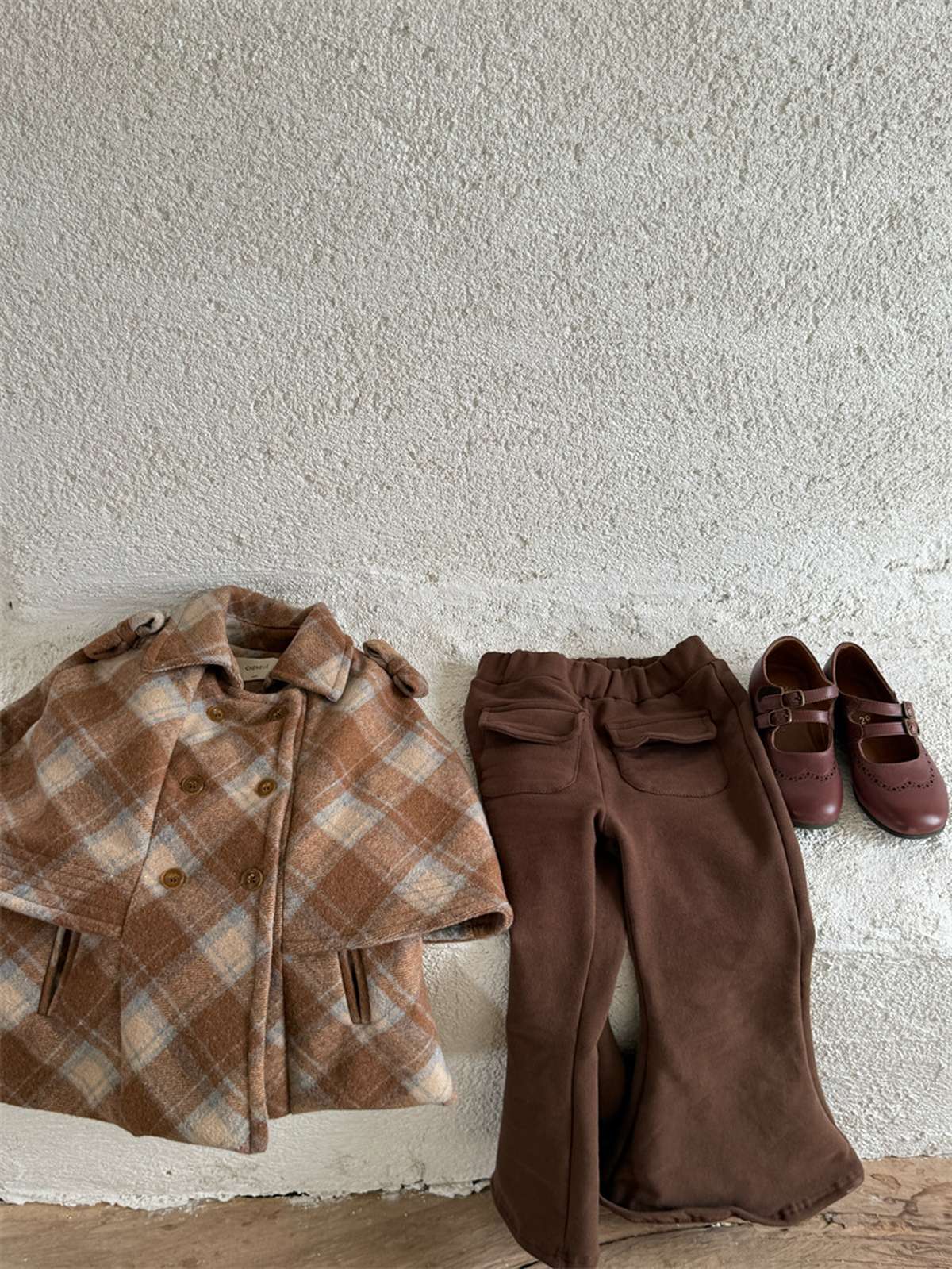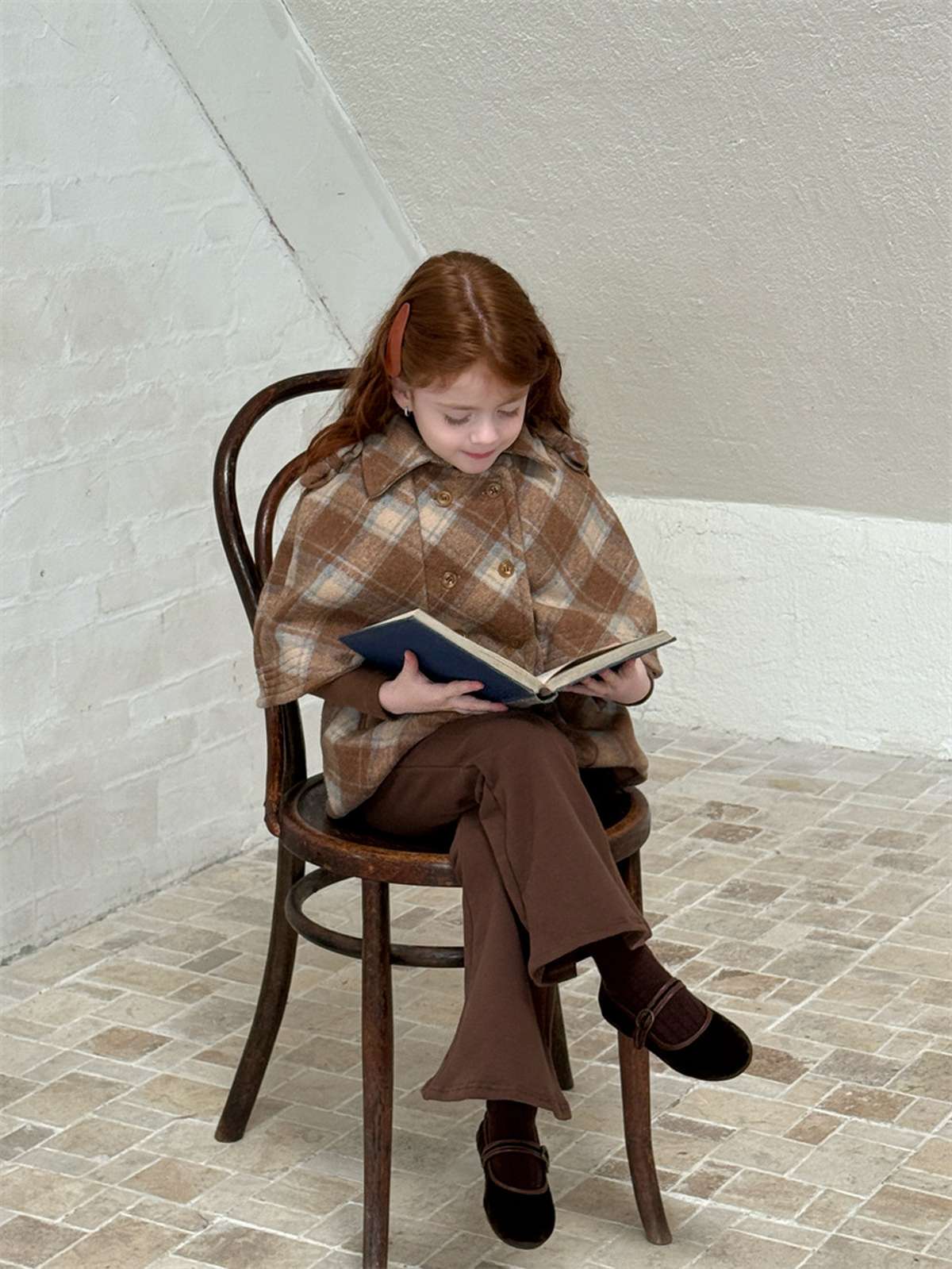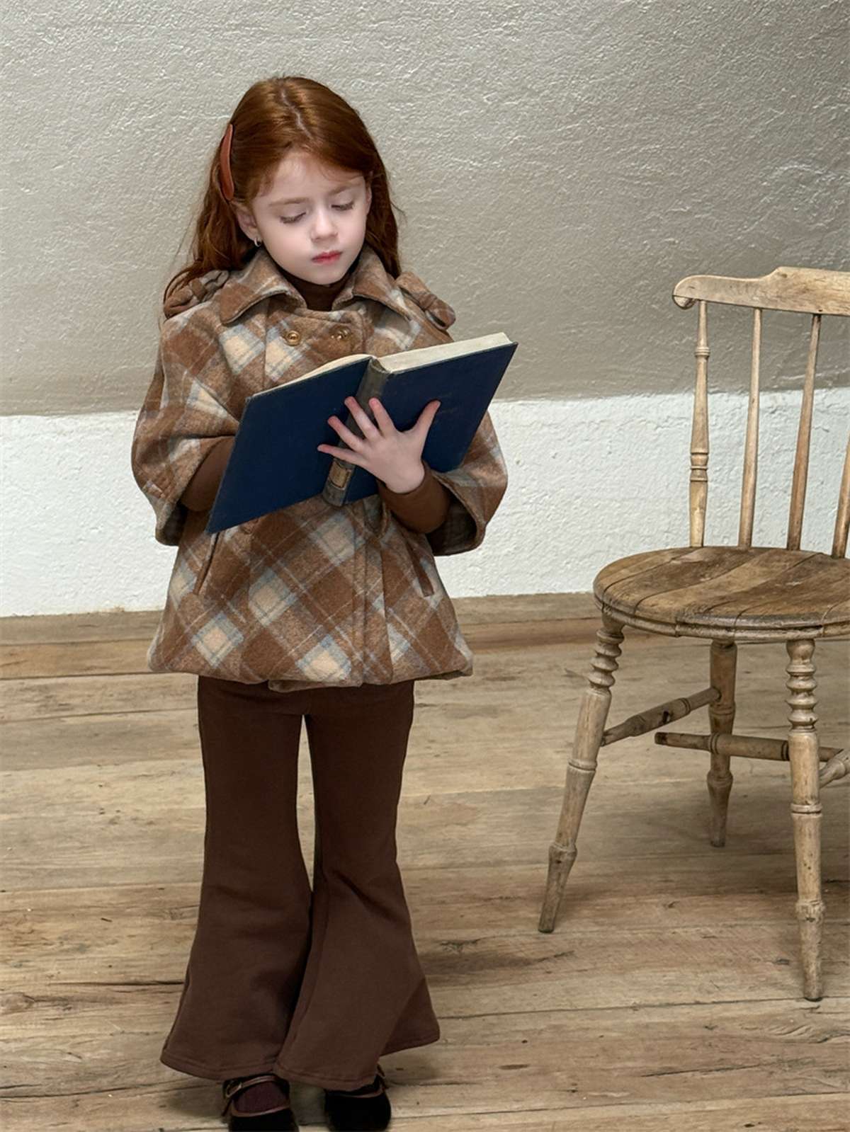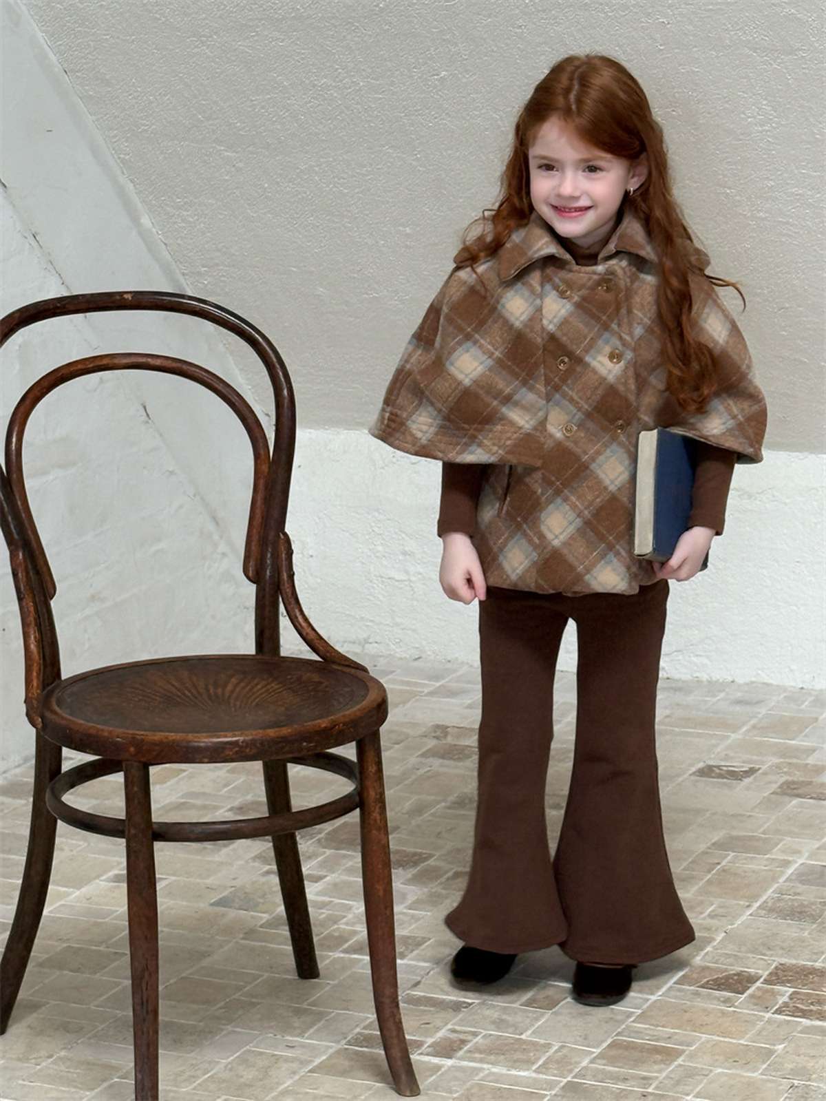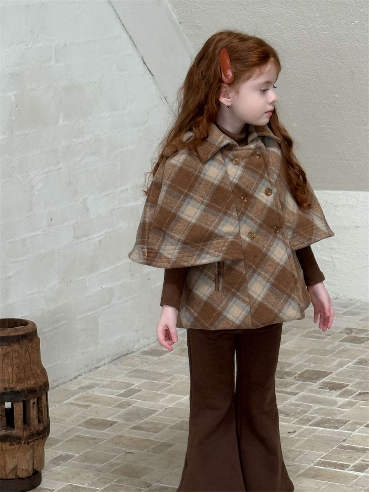 クラシカルなチェック柄が目を引く、マント風のケープデザインが特徴的なウール調アウターです。ダブルブレストの仕立てがフレンチシックなヴィンテージ感を演出し、お子様の着こなしを上品に彩ります。厚手の素材でしっかりと防寒性を備えたこのコートは、普段の子ども服を洗練されたスタイルへと導く、冬のドレスアップに欠かせない一着です。