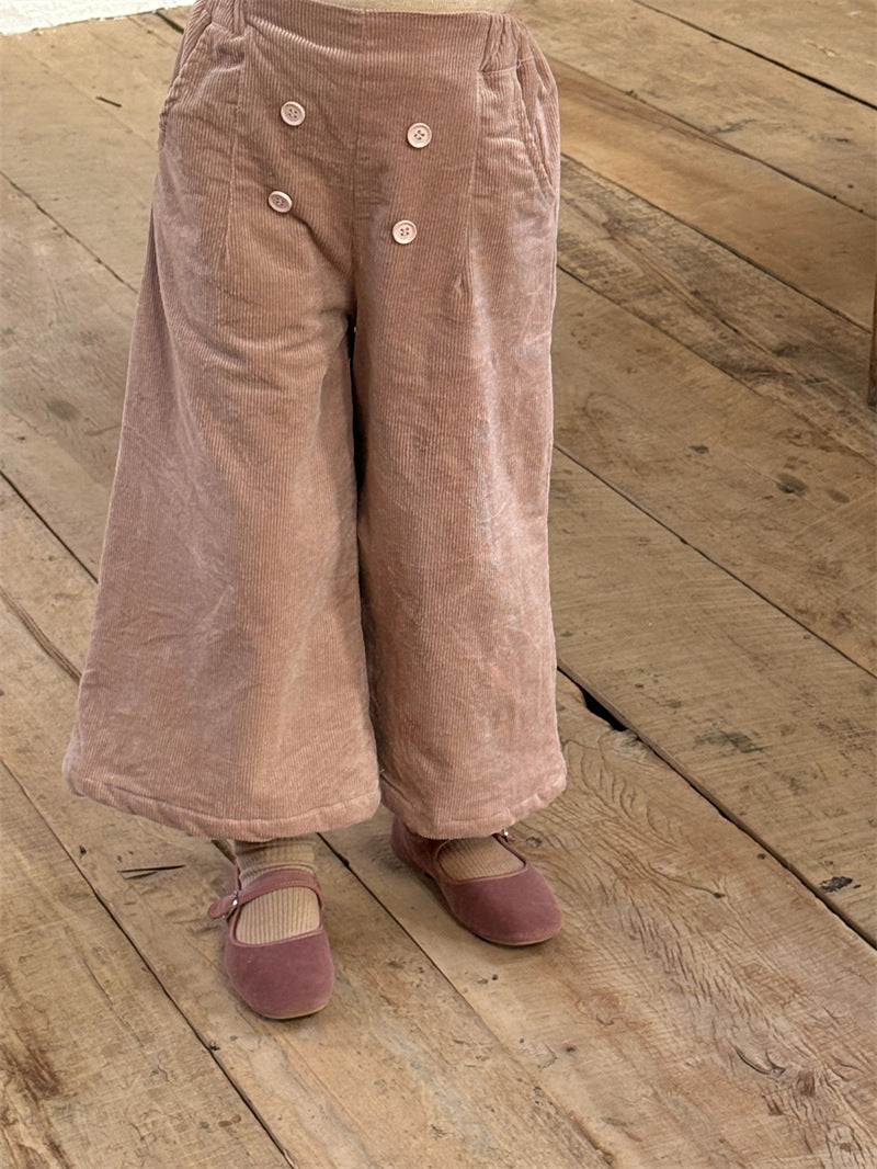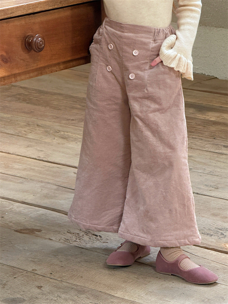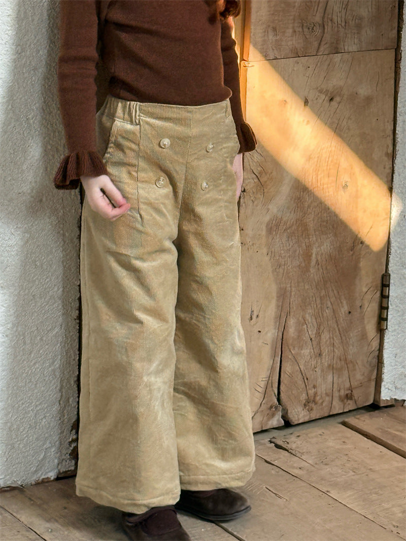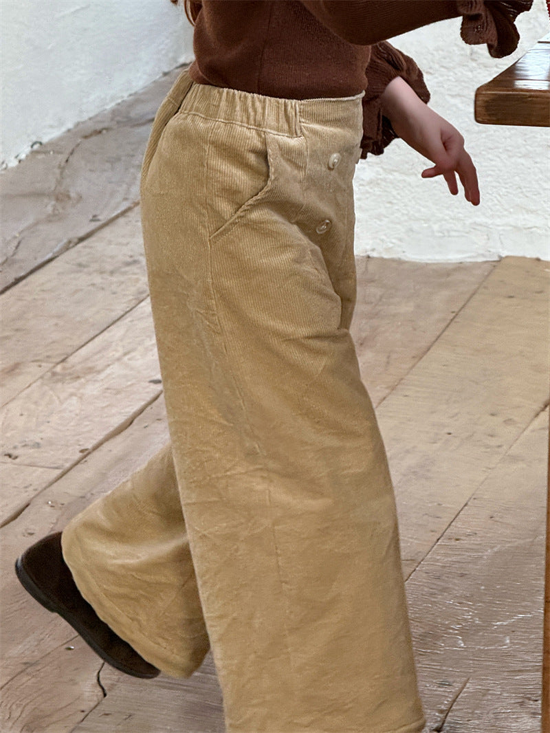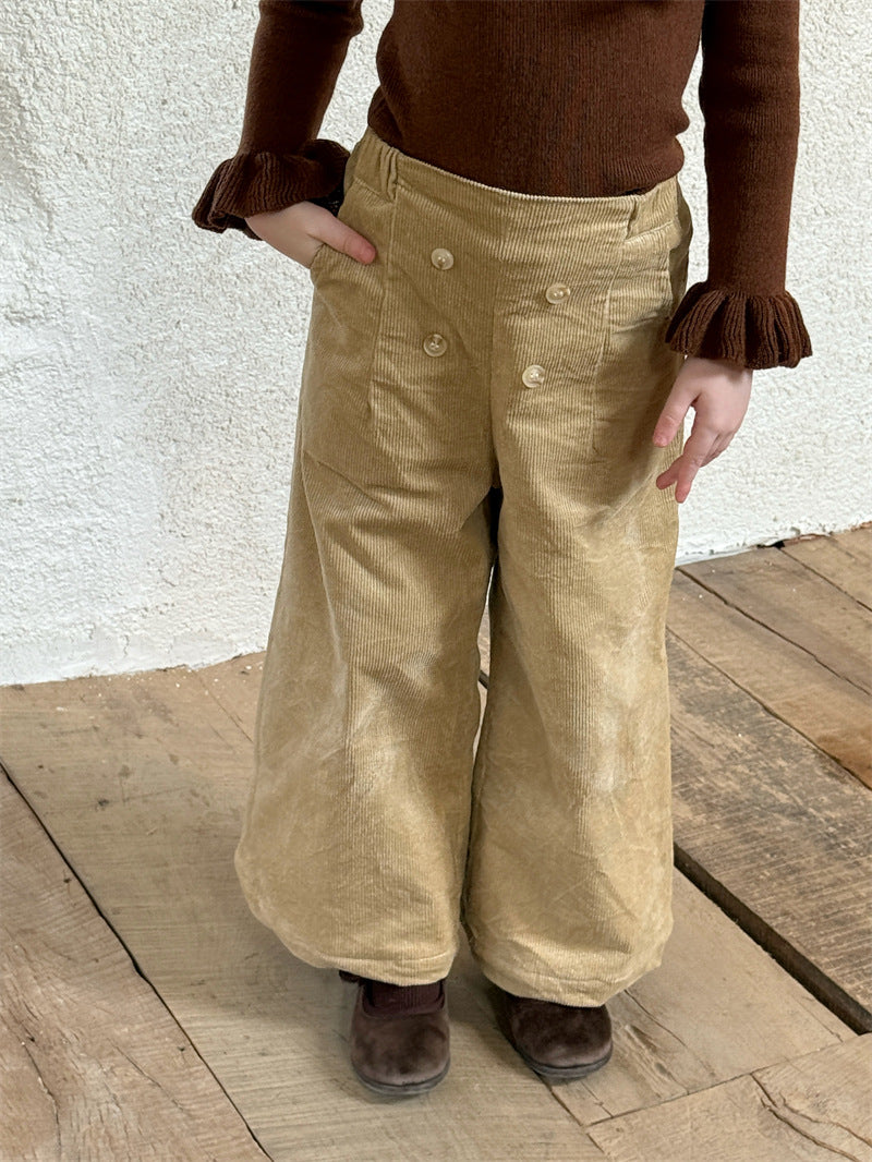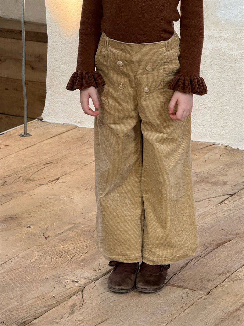 寒い時季のお出かけを暖かくサポートするコーデュロイのストレートスラックス。トレンドのハイウエストとダブルボタンのデザインが視線を上に集め、穿くだけで自然なスタイルアップを叶えます。カジュアルながらも洗練されたムードを纏うこのボトムスは、動き回る子ども服でありながらおしゃれな存在感を放ち、毎日のコーディネートを格上げする一本として活躍します。