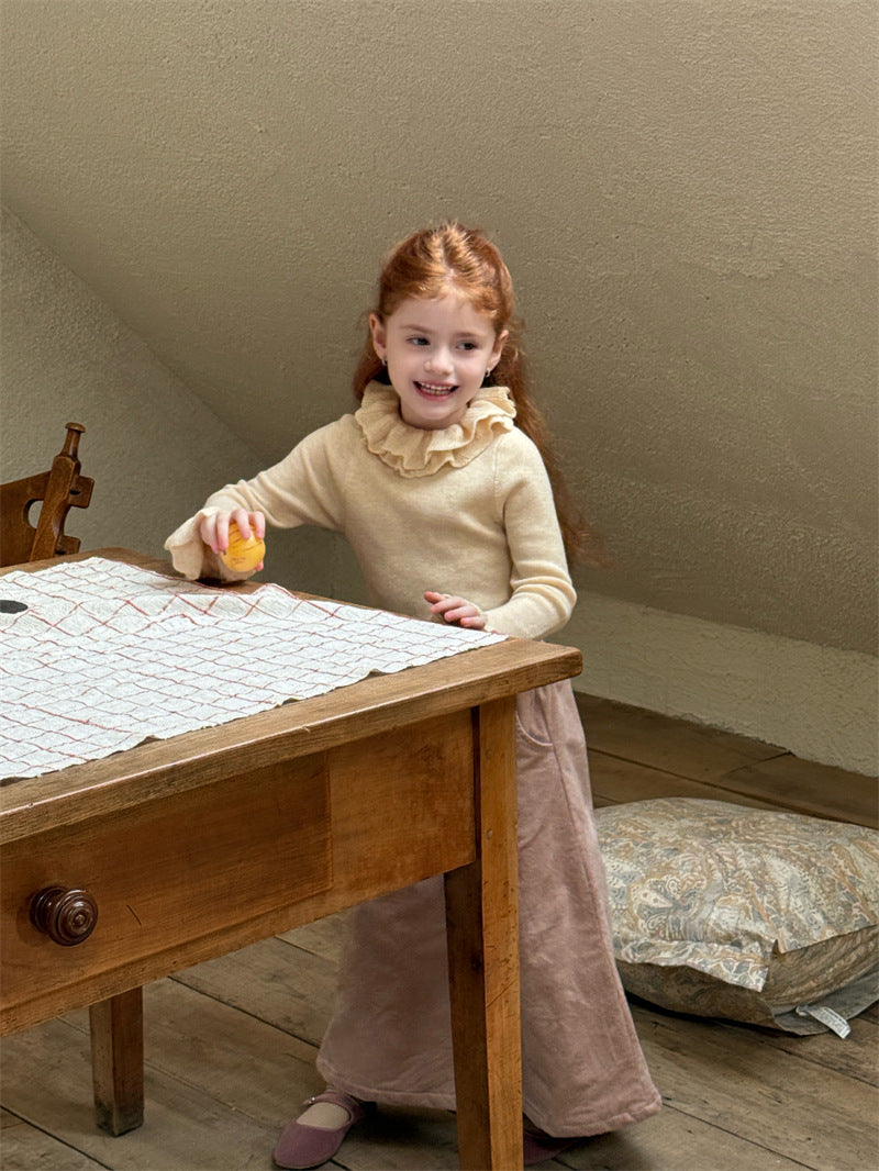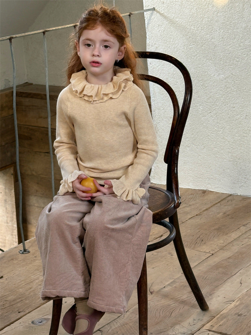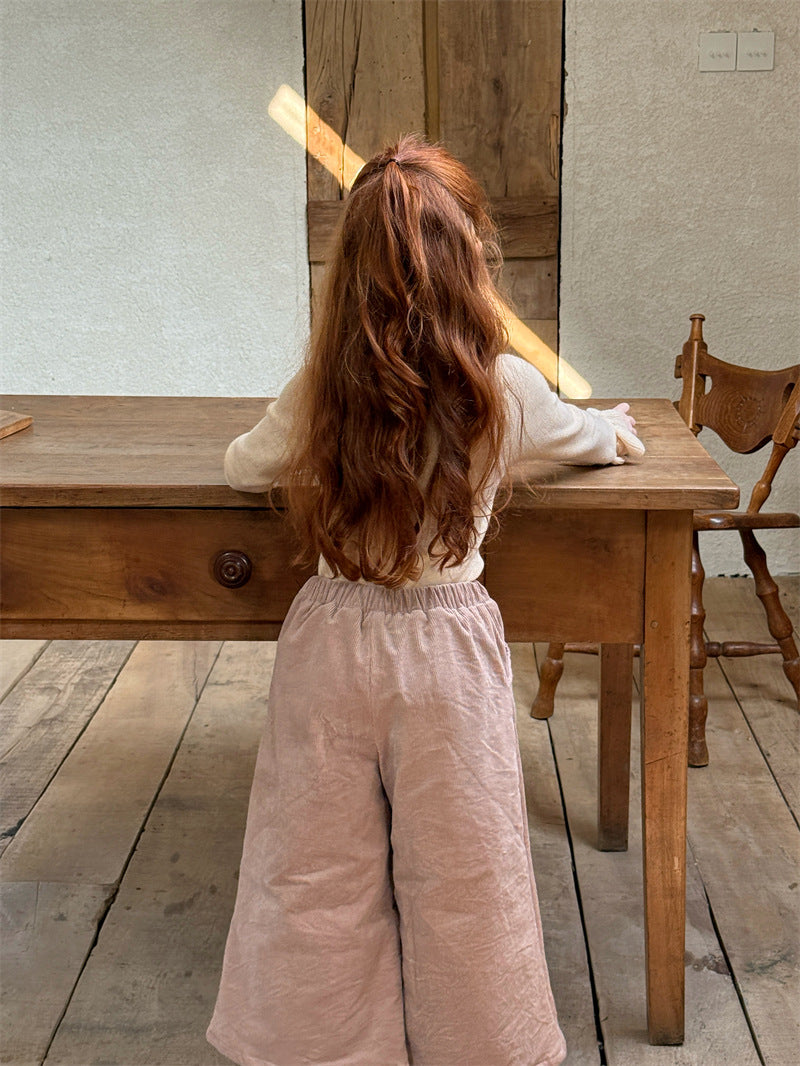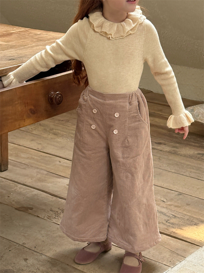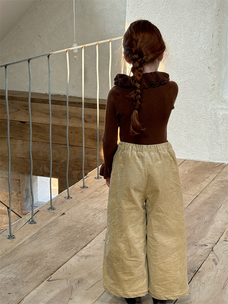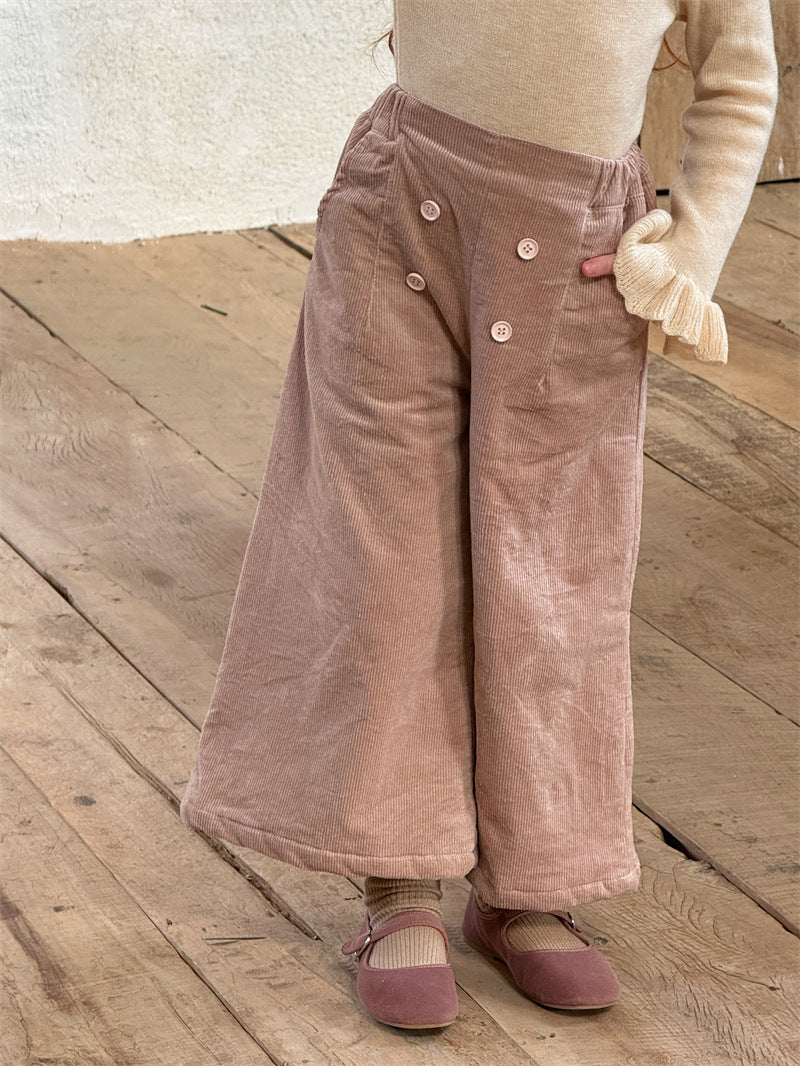 寒い時季のお出かけを暖かくサポートするコーデュロイのストレートスラックス。トレンドのハイウエストとダブルボタンのデザインが視線を上に集め、穿くだけで自然なスタイルアップを叶えます。カジュアルながらも洗練されたムードを纏うこのボトムスは、動き回る子ども服でありながらおしゃれな存在感を放ち、毎日のコーディネートを格上げする一本として活躍します。