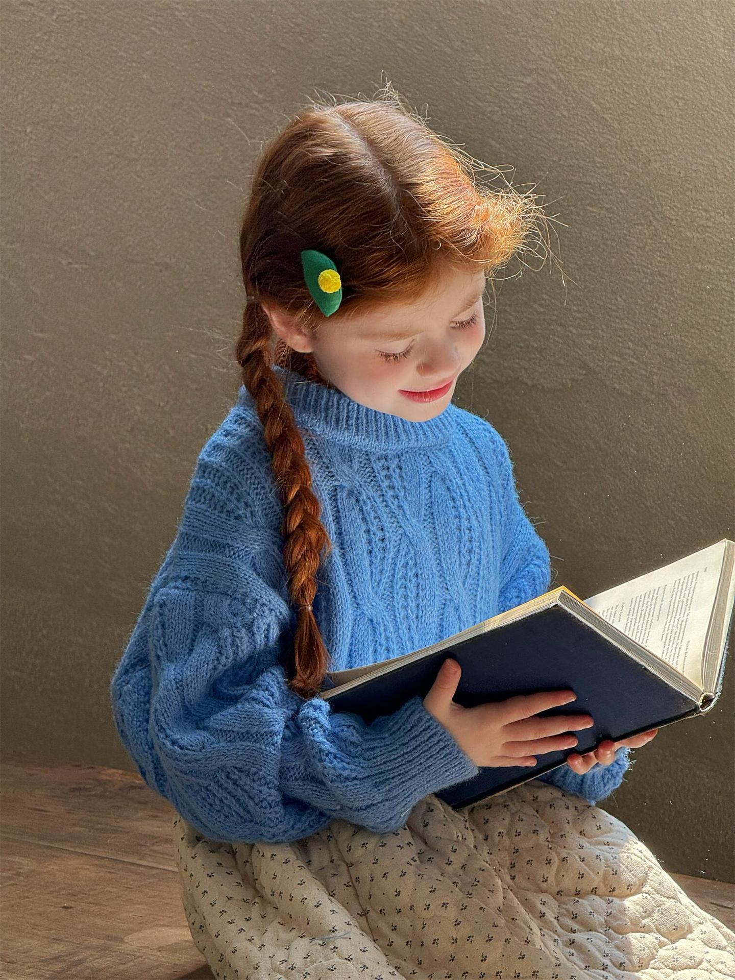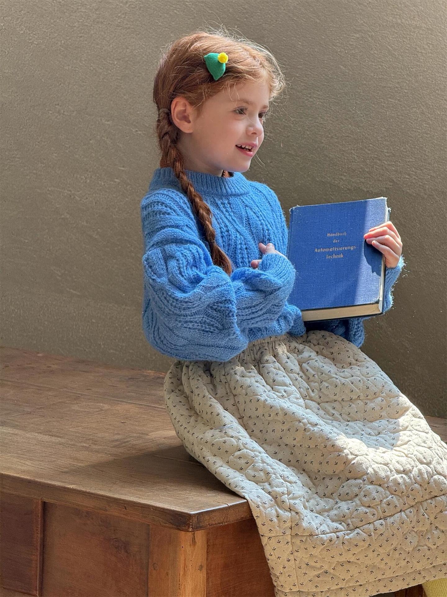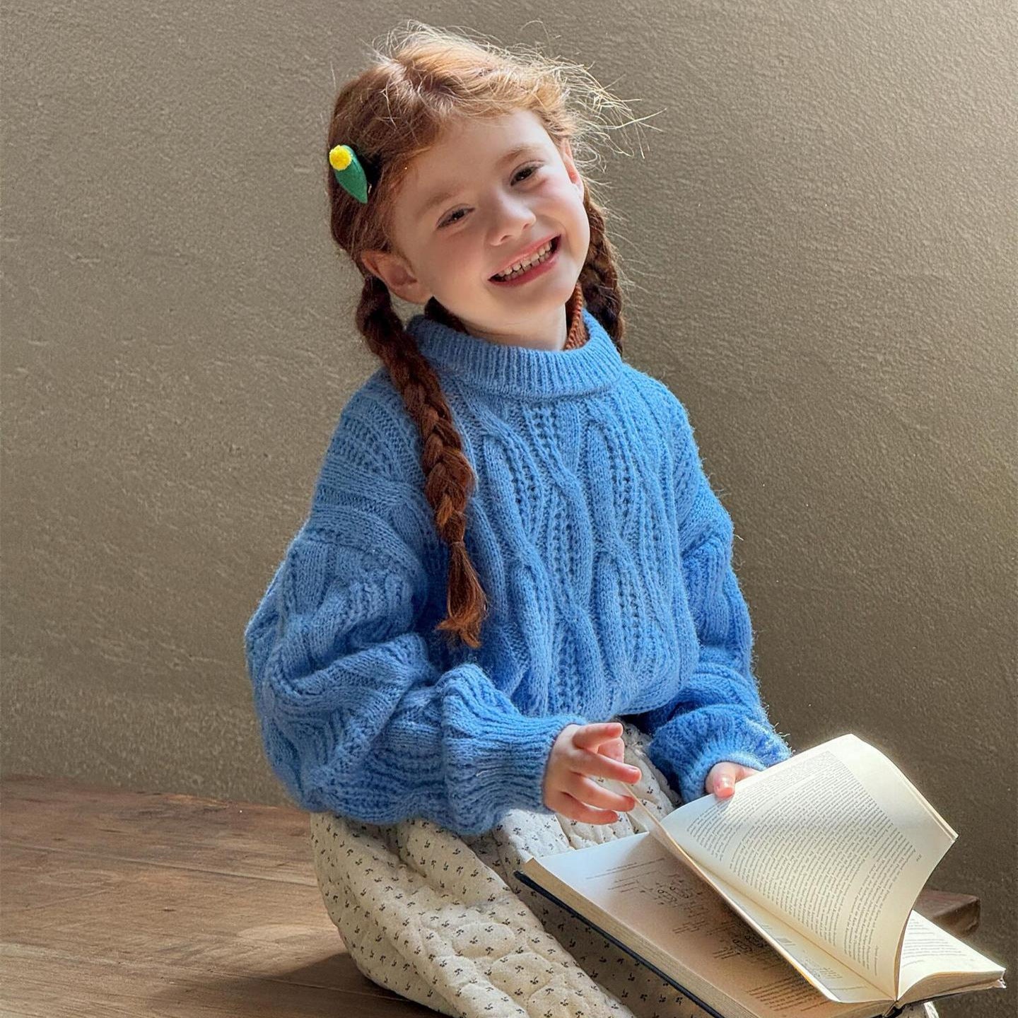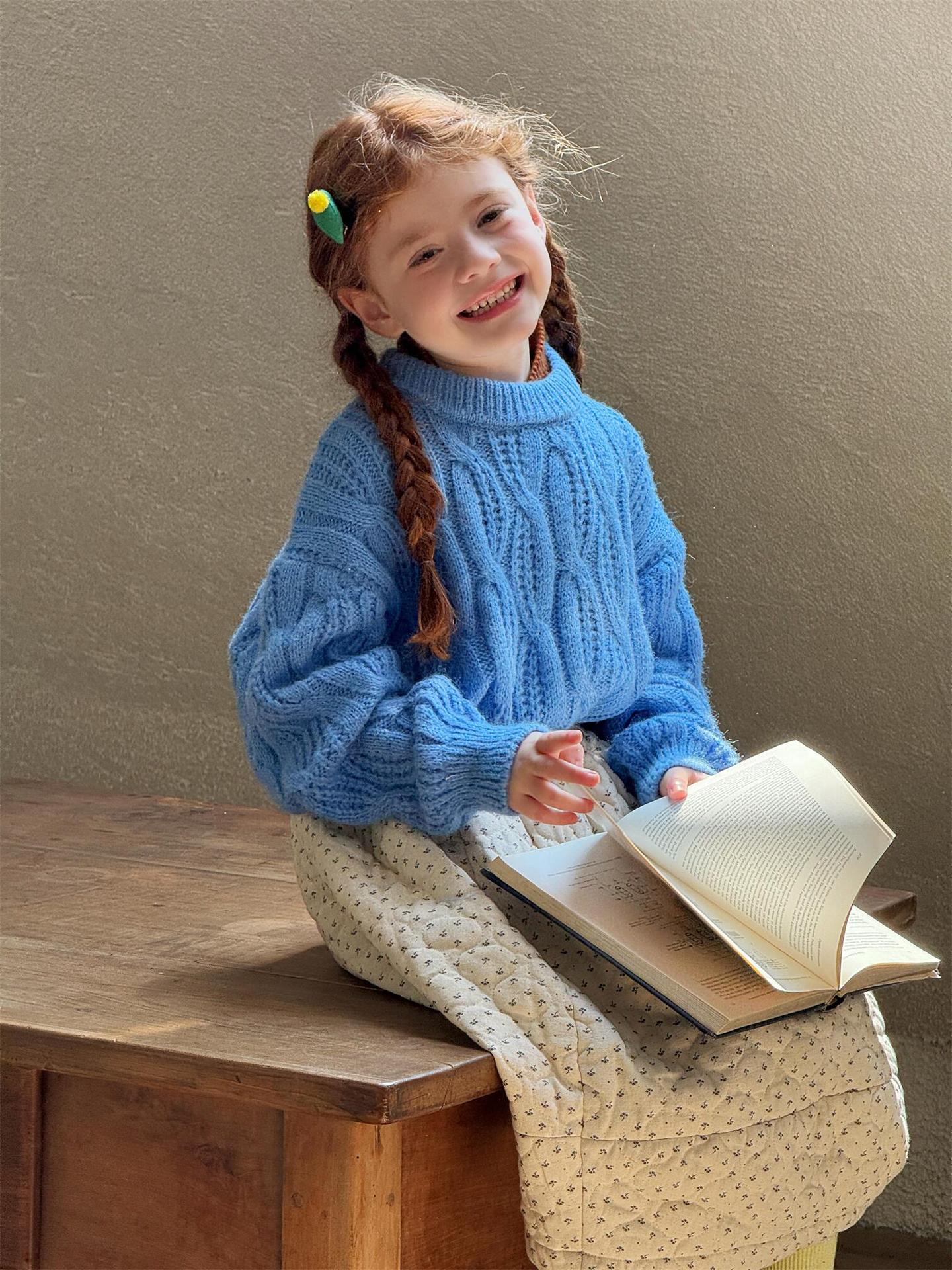 ふっくらとした編み地が心地よいニットセーターです。ゆったりとしたルーズなオーバーシルエットがトレンド感を演出し、リラックスした着心地を提供します。ベーシックなクルーネックデザインで、カジュアルなスタイルにぴったりなプルオーバートップスです。爽やかなブルーの色合いが冬のコーディネートに映える、着回しの効く子ども服です。