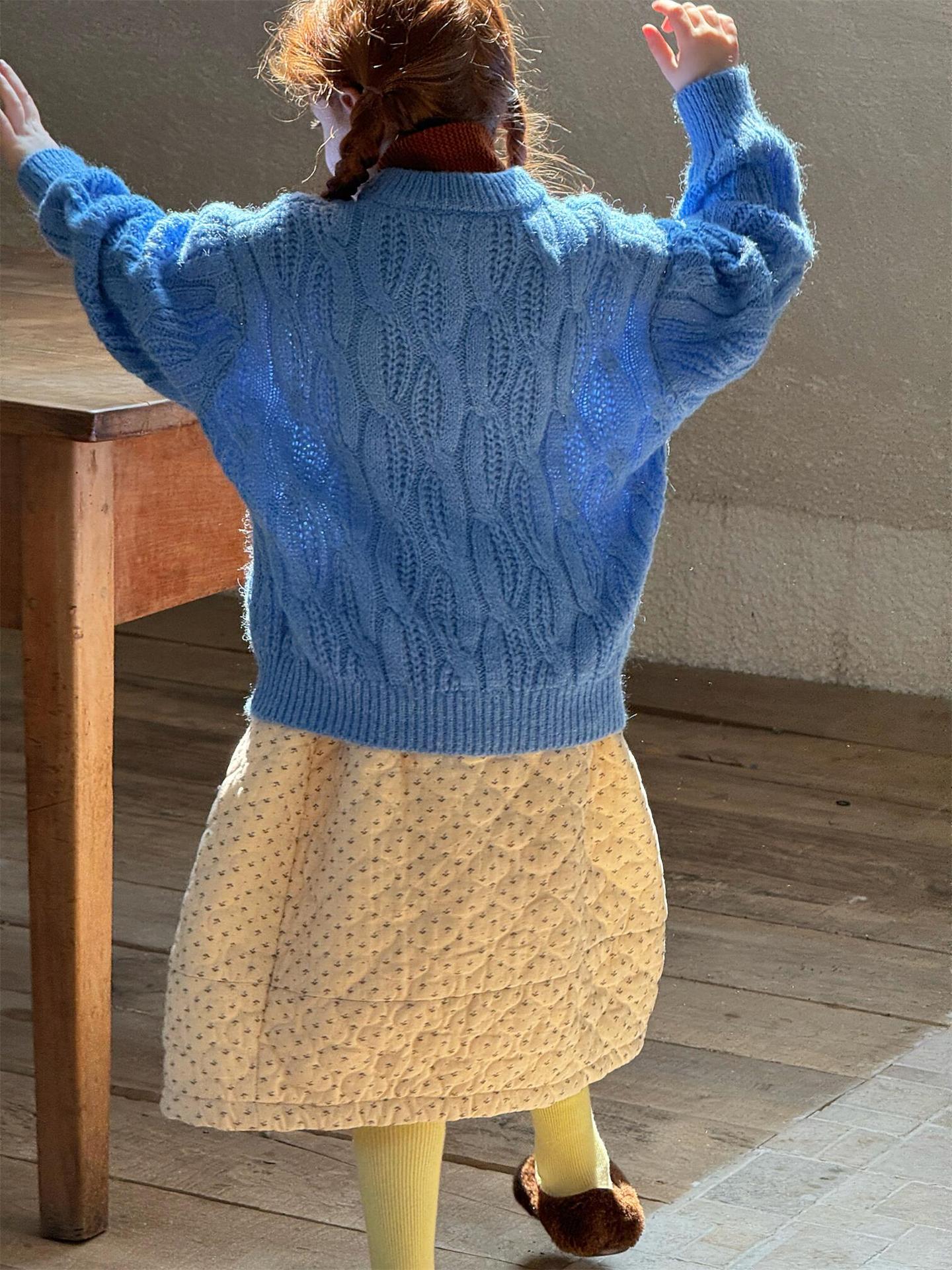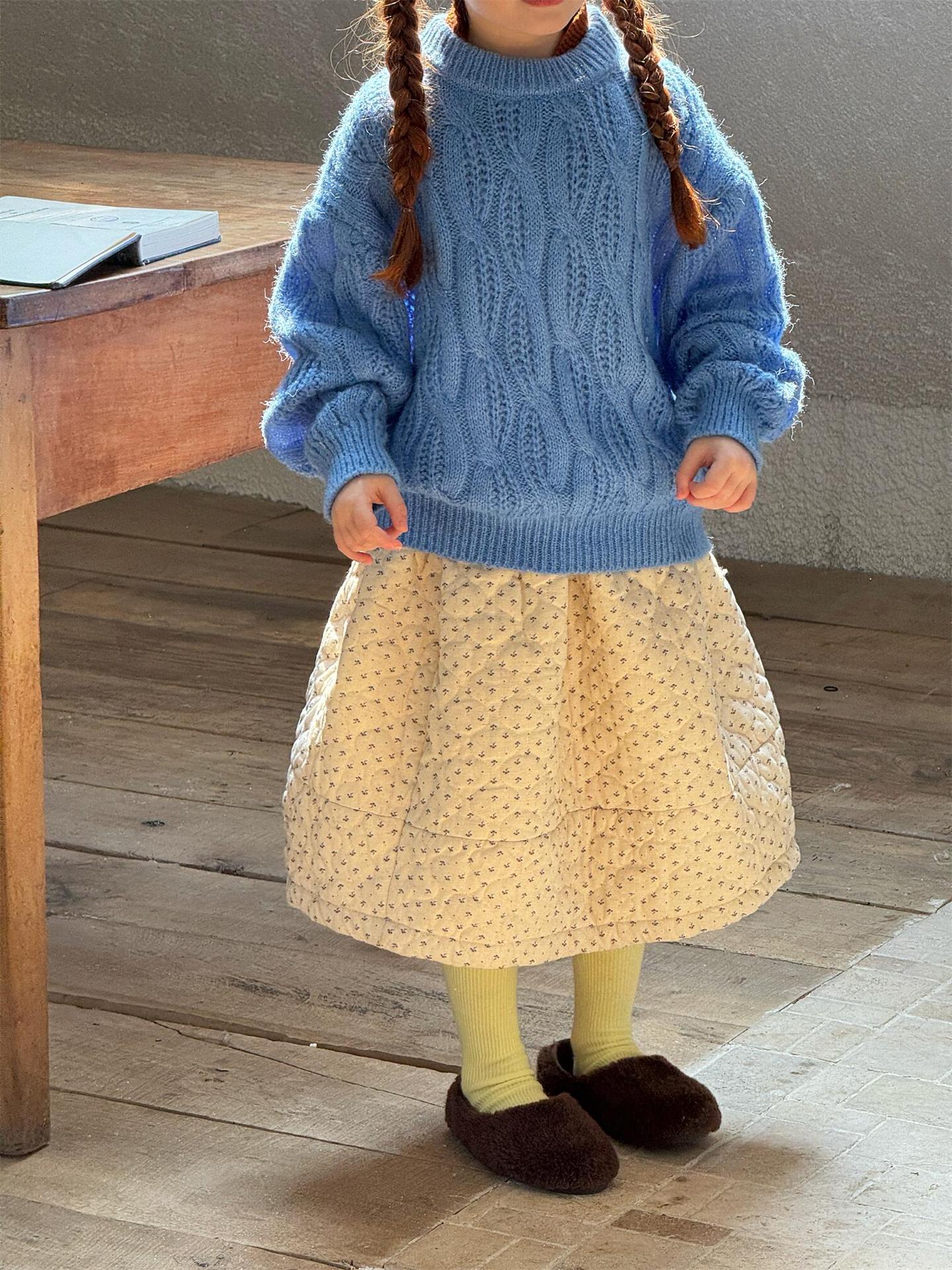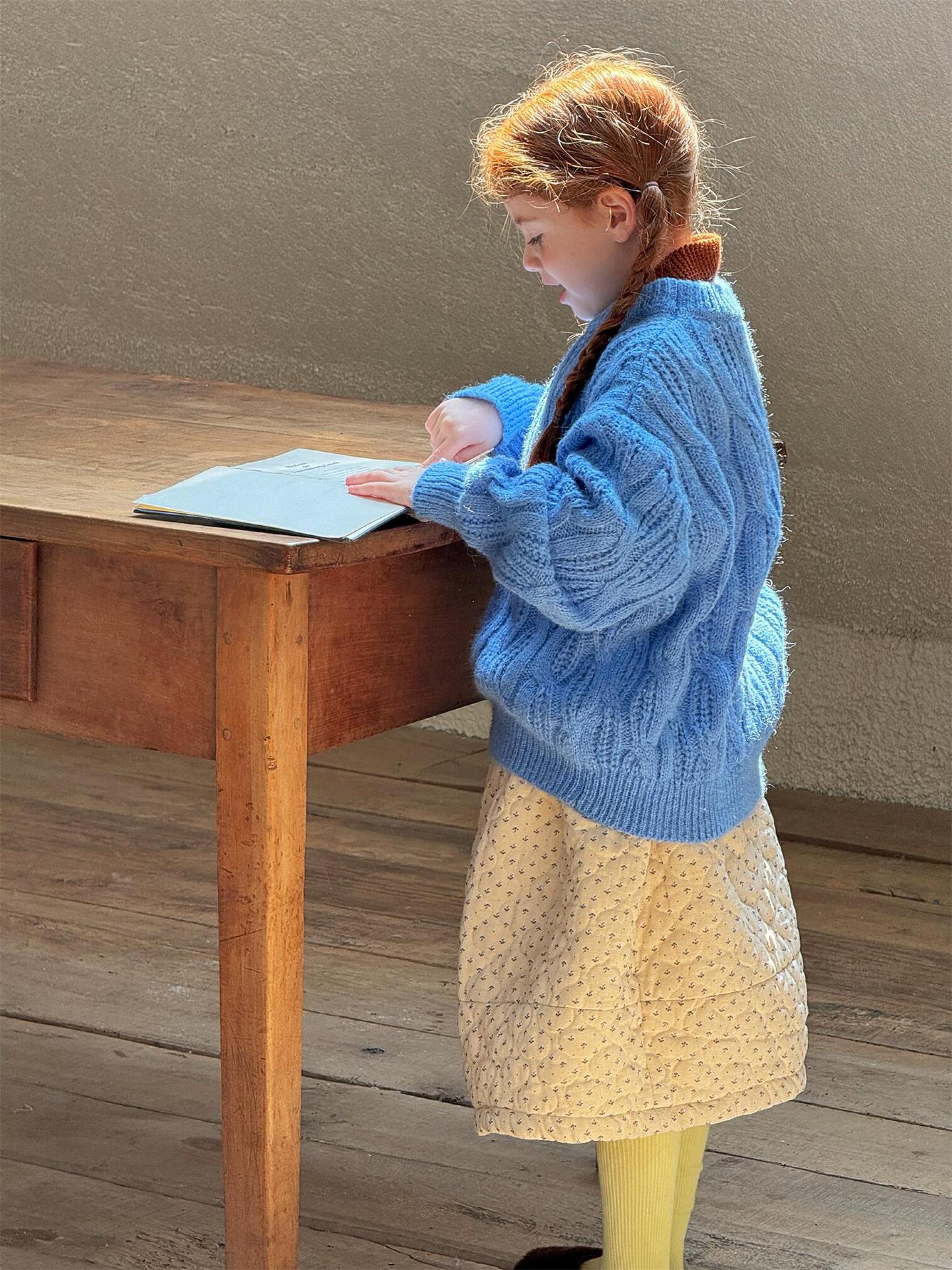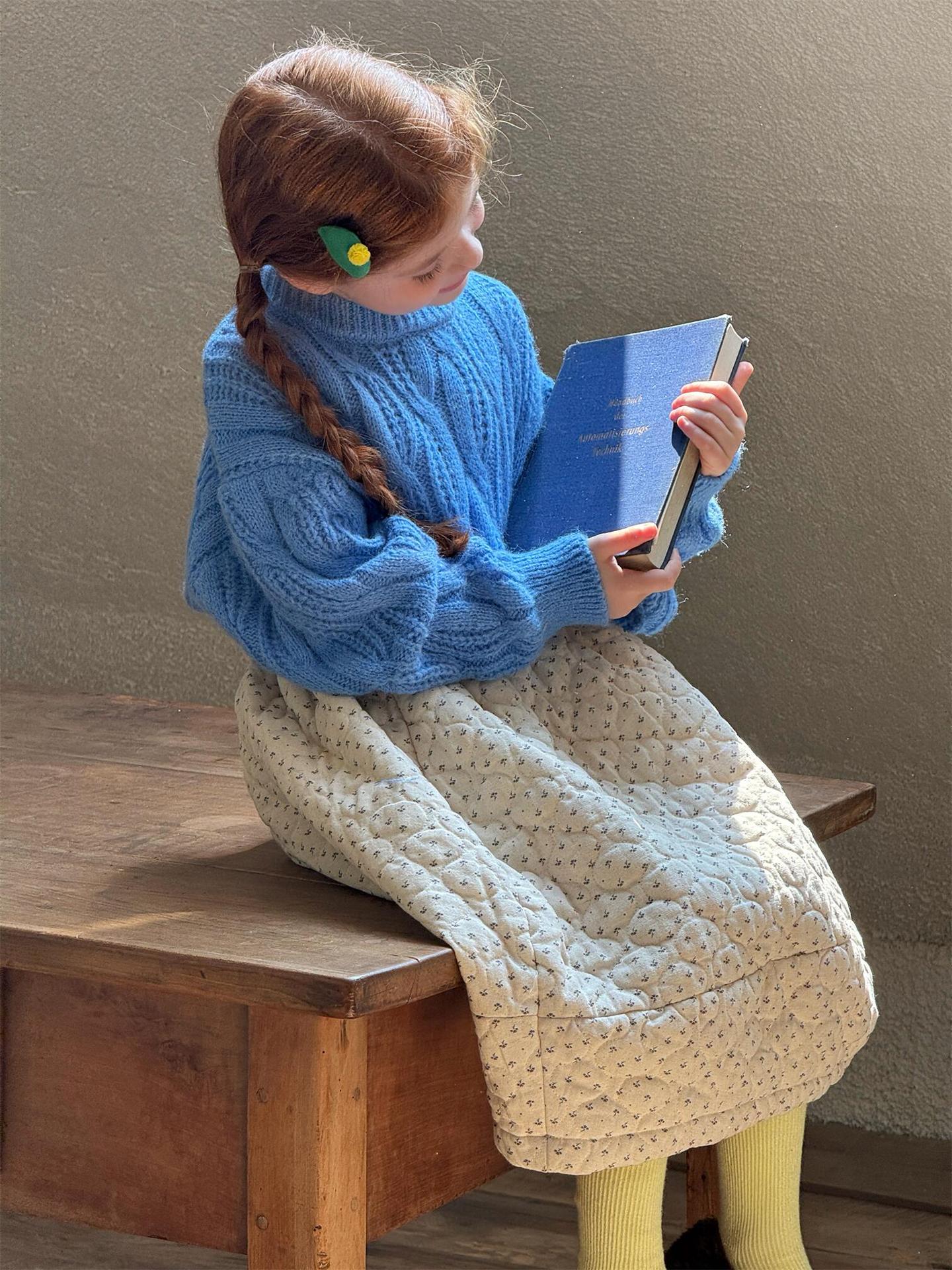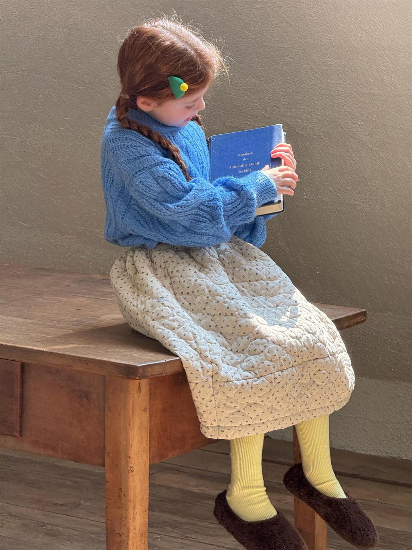 ふっくらとした編み地が心地よいニットセーターです。ゆったりとしたルーズなオーバーシルエットがトレンド感を演出し、リラックスした着心地を提供します。ベーシックなクルーネックデザインで、カジュアルなスタイルにぴったりなプルオーバートップスです。爽やかなブルーの色合いが冬のコーディネートに映える、着回しの効く子ども服です。