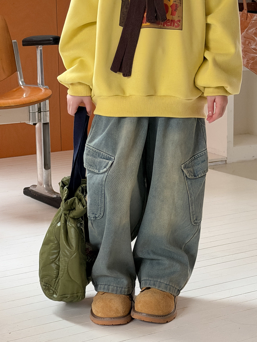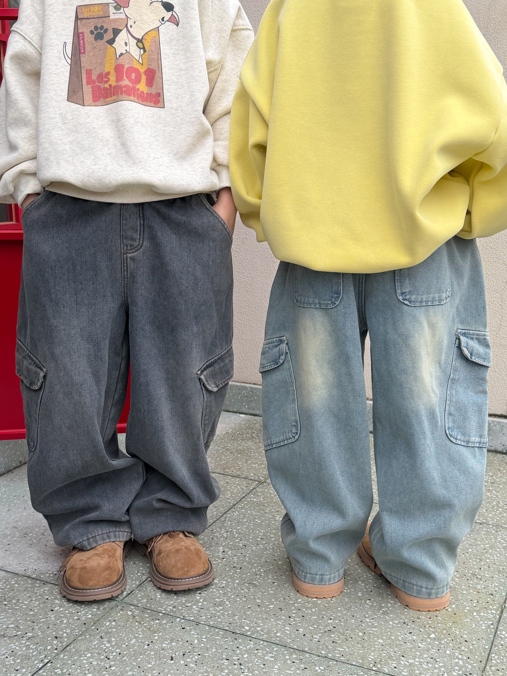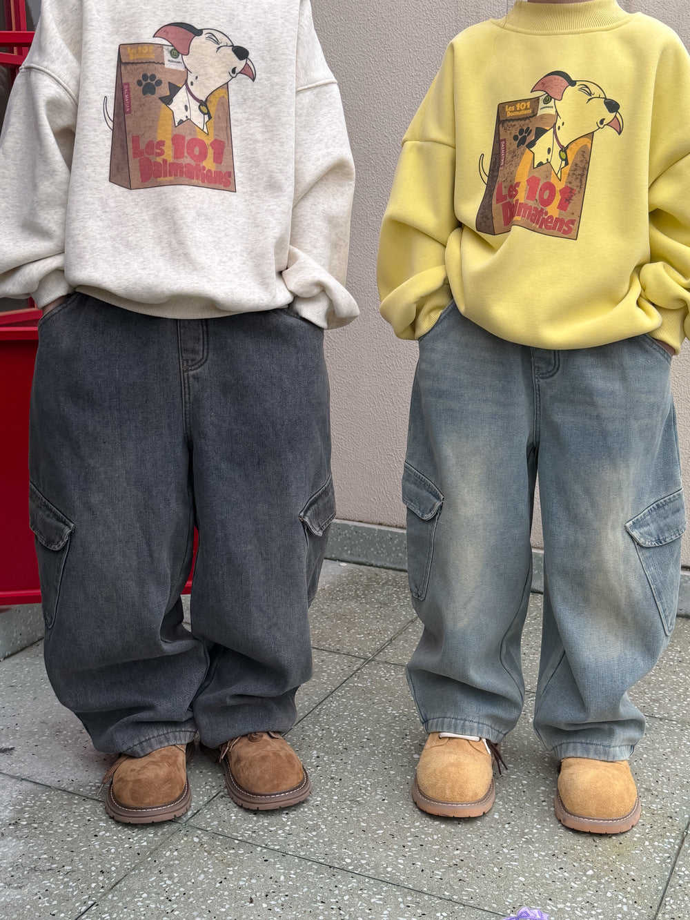 厚手のデニム生地に裏フリースの裏地を施した、保温性の高いカーゴパンツです。太もも部分のサイドポケットがアクセントになったワークテイストなデザインで、ゆとりのあるボーイフレンドストレートのシルエットが動きやすさを確保しています。ウエストは着脱しやすいゴム仕様になっており、スニーカーやブーツを合わせたカジュアルな着こなしから、ジャケットと合わせたストリートスタイルまで幅広く対応します。しっかりとした厚みがありながら野暮ったくならないジーンズは、冬の日常使いや屋外での活動に適した防寒仕様の子供用ロングパンツです。