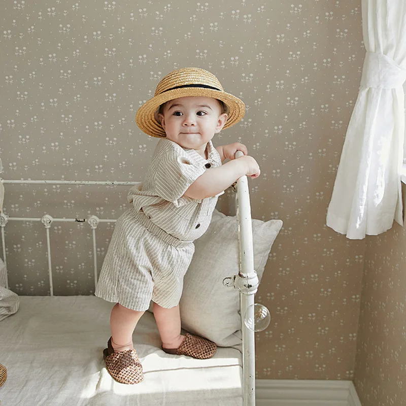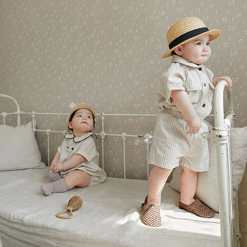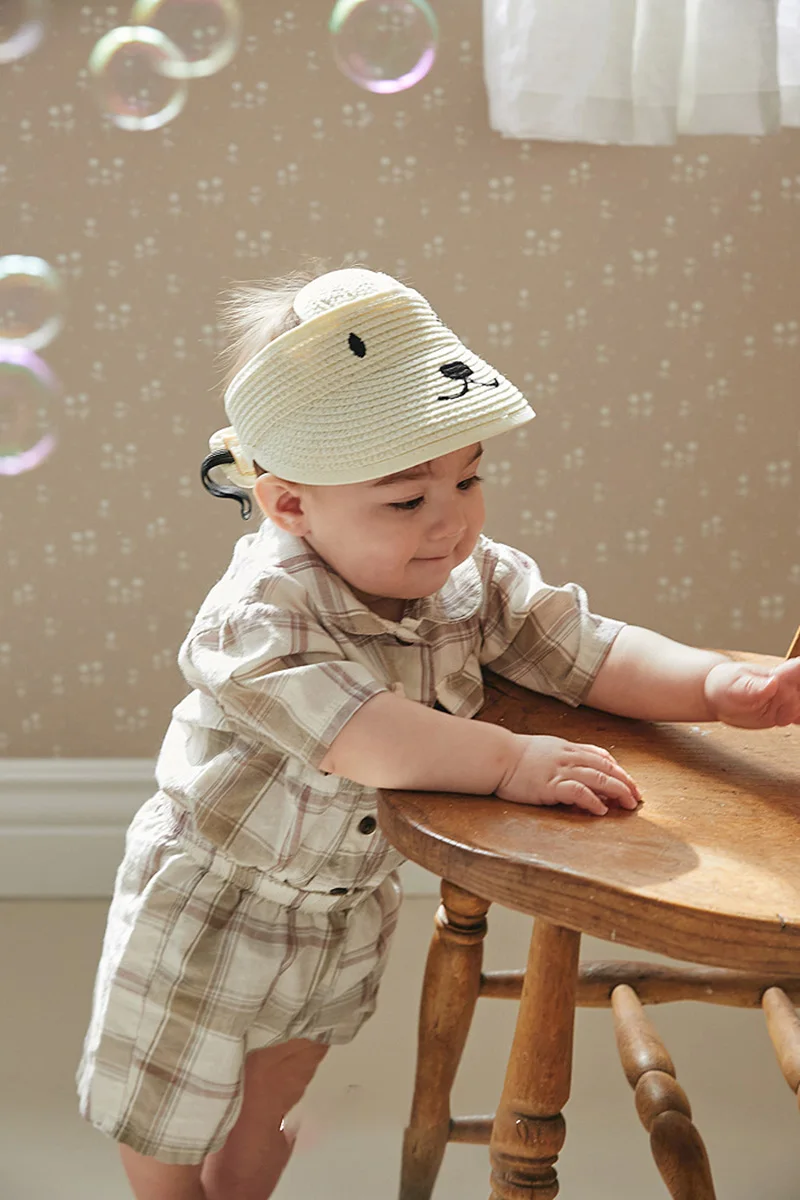ベビー キッズ サマー セットアップ ストライプ チェック 半袖 シャツ ブラウス ショートパンツ ベージュ ユニセックス