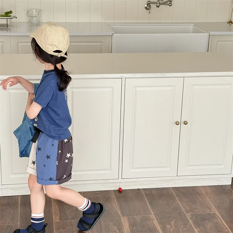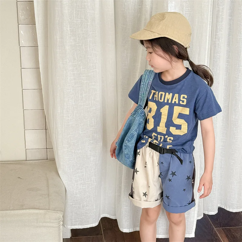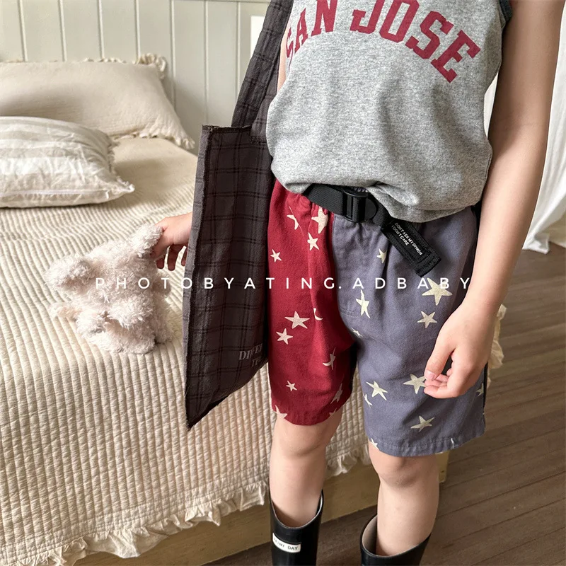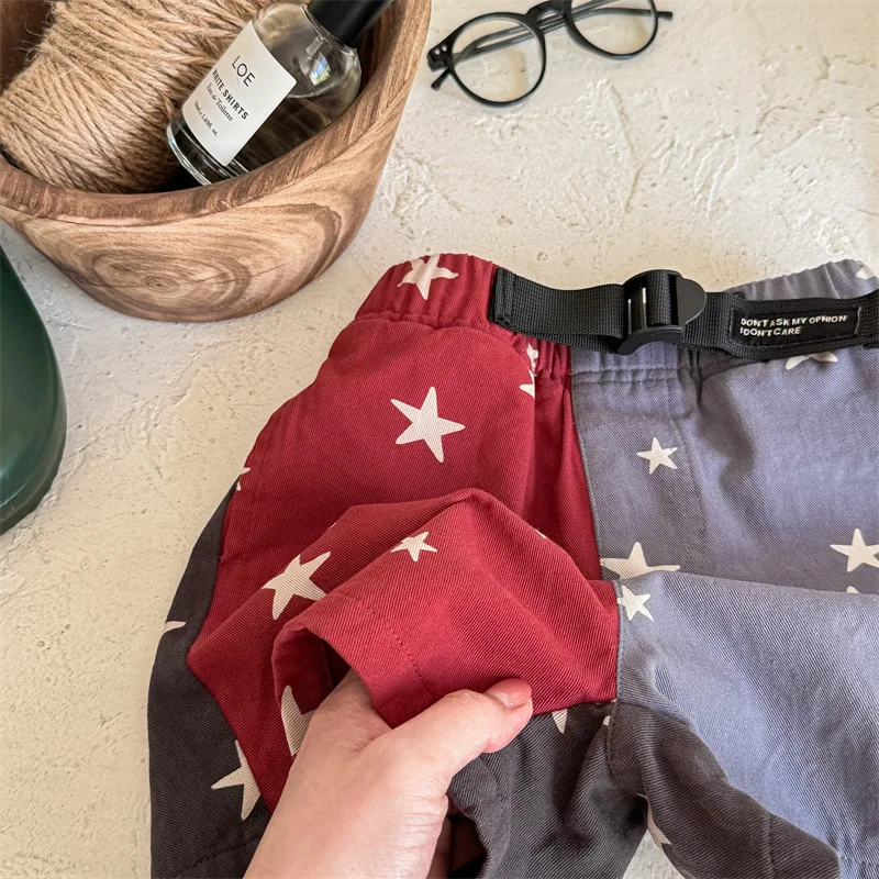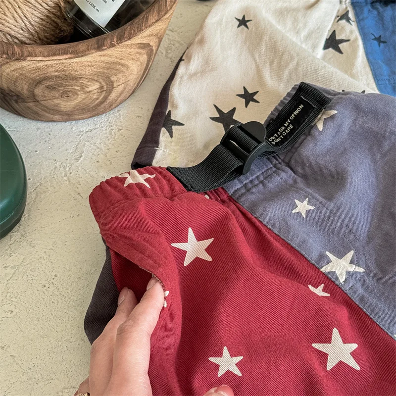夏のおしゃれな子供服に、星スタープリントのキッズパンツが登場しました。2つのカラーバリエーションから選べます。バイカラーのデザインとパッチワークが特徴で、スタイリッシュな印象を与えます。柔らかなコットン素材で作られており、快適な着心地を提供します。キッズパンツは、カジュアルなスタイルにぴったりで、子供の活動的な日常に対応します。星柄のプリントが子供らしさを引き立て、夏のファッションにアクセントを加えます。