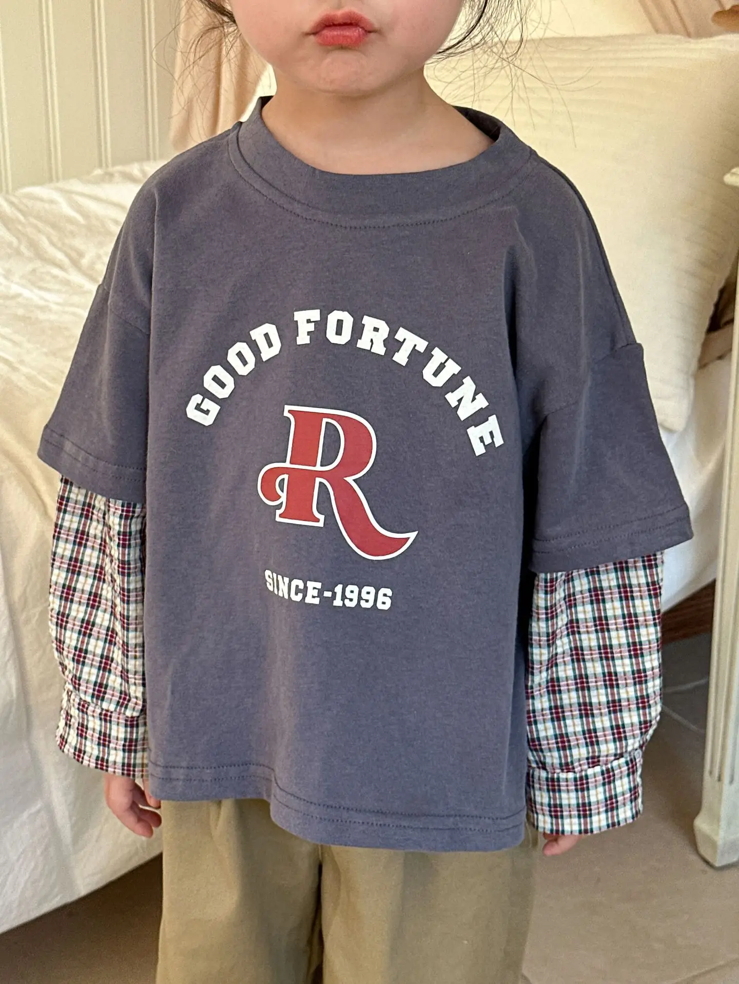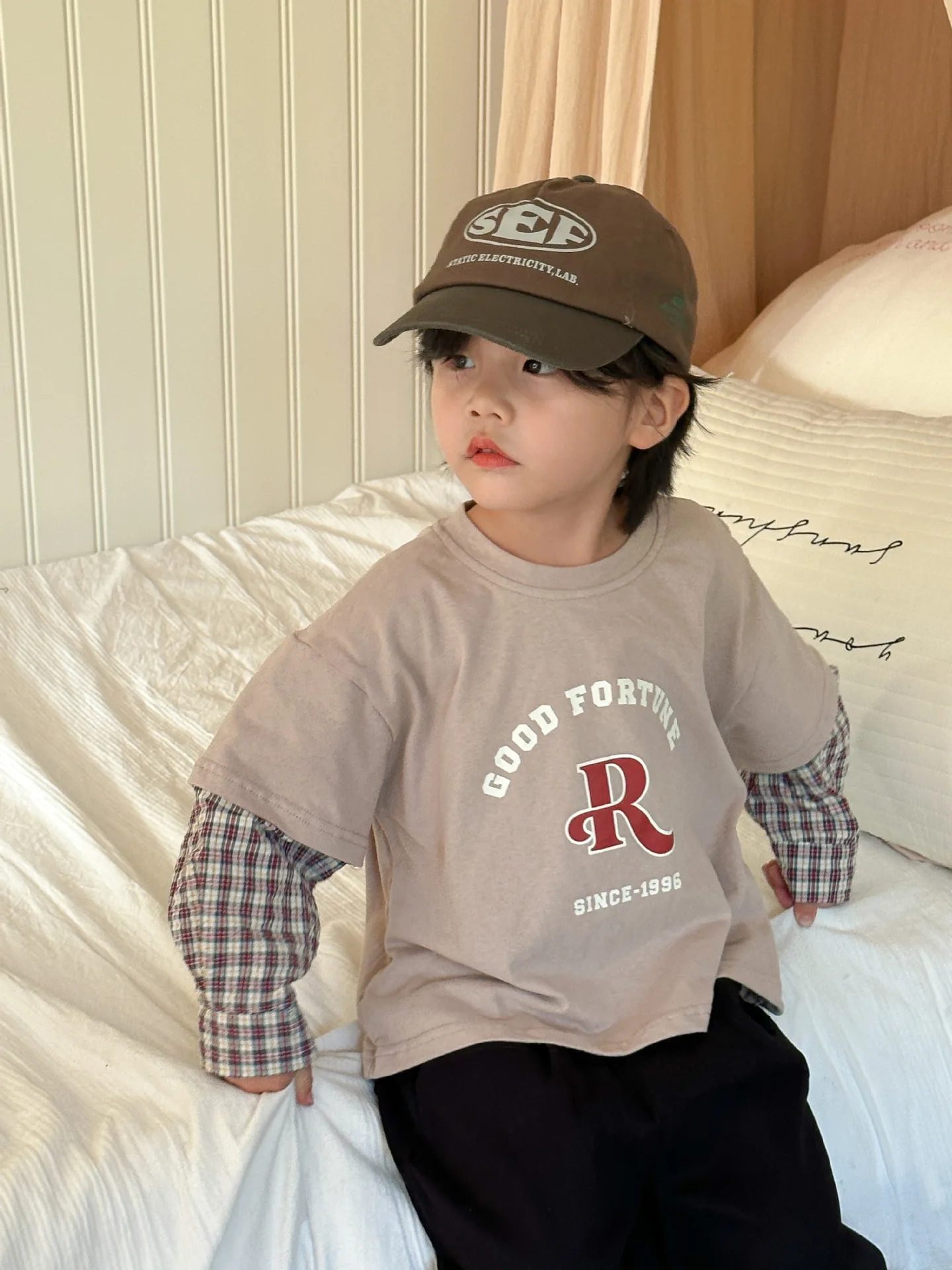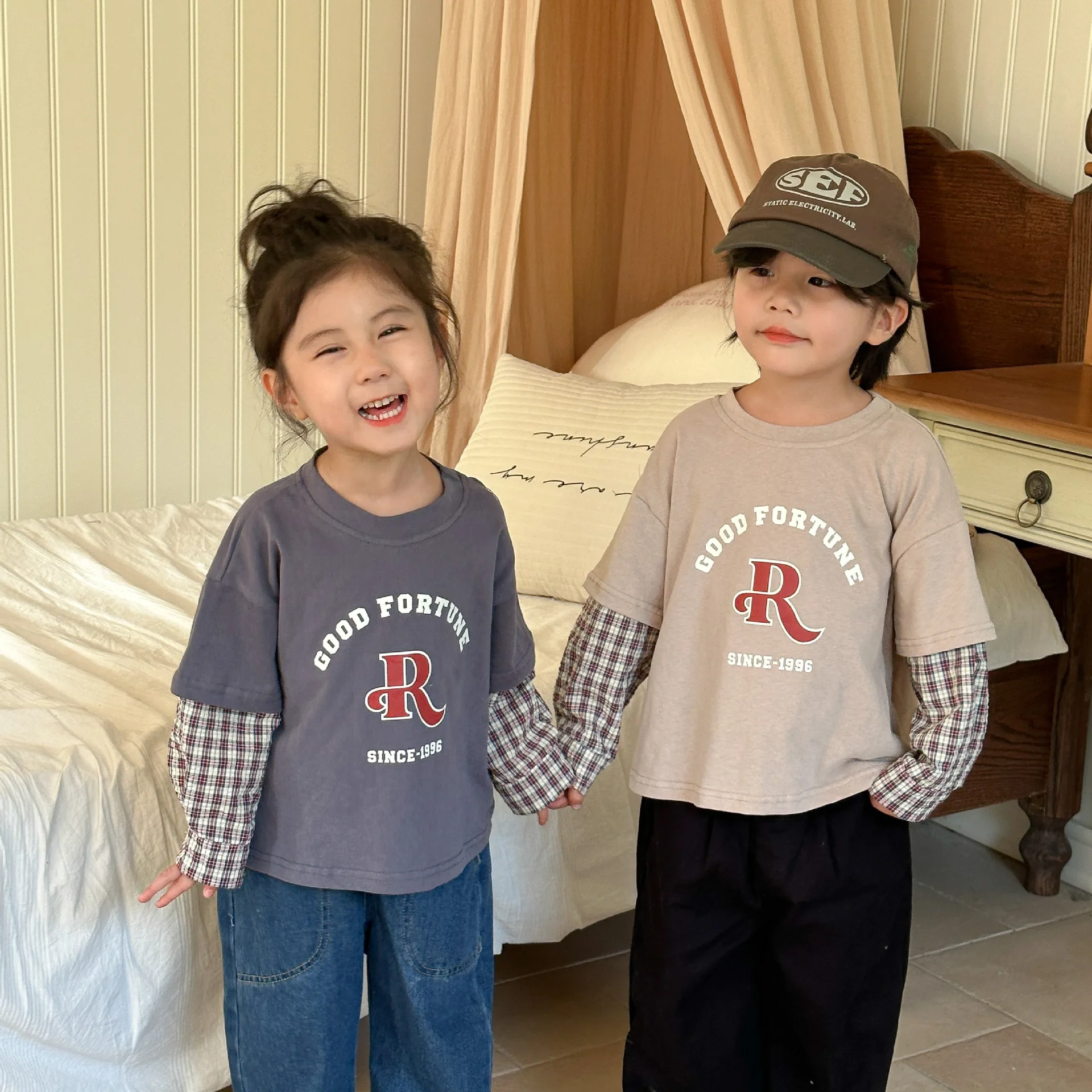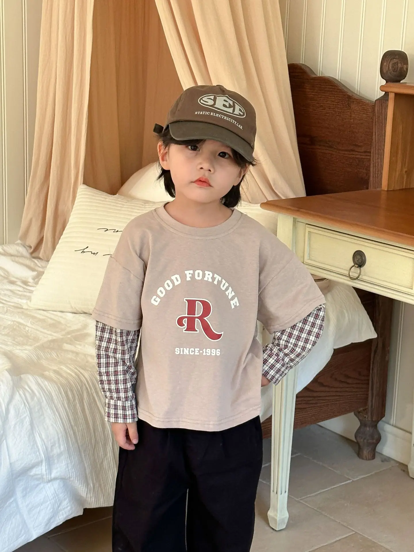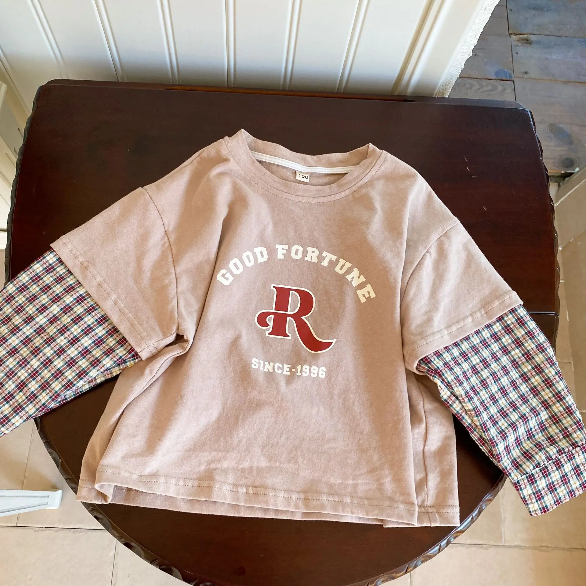 今季のトレンドを取り入れたキッズトップス。袖のパッチワークとレターロゴがアクセントの長袖ドッキングTシャツは、秋の子供服として最適。柔らかい綿素材で作られたカジュアルなトップスは、子供たちのオシャレさを引き立てます。2種類のカラーからお選びいただけます。