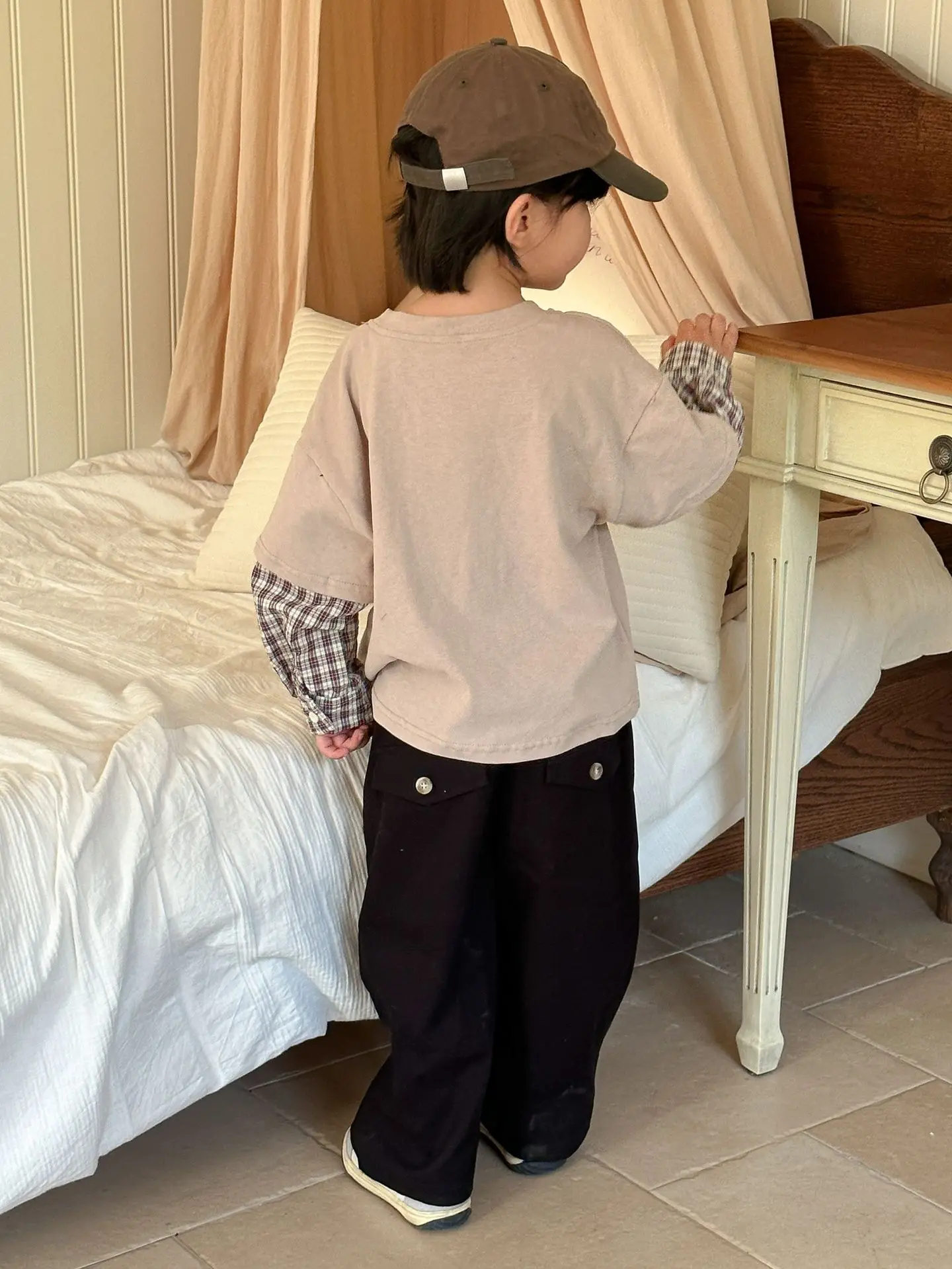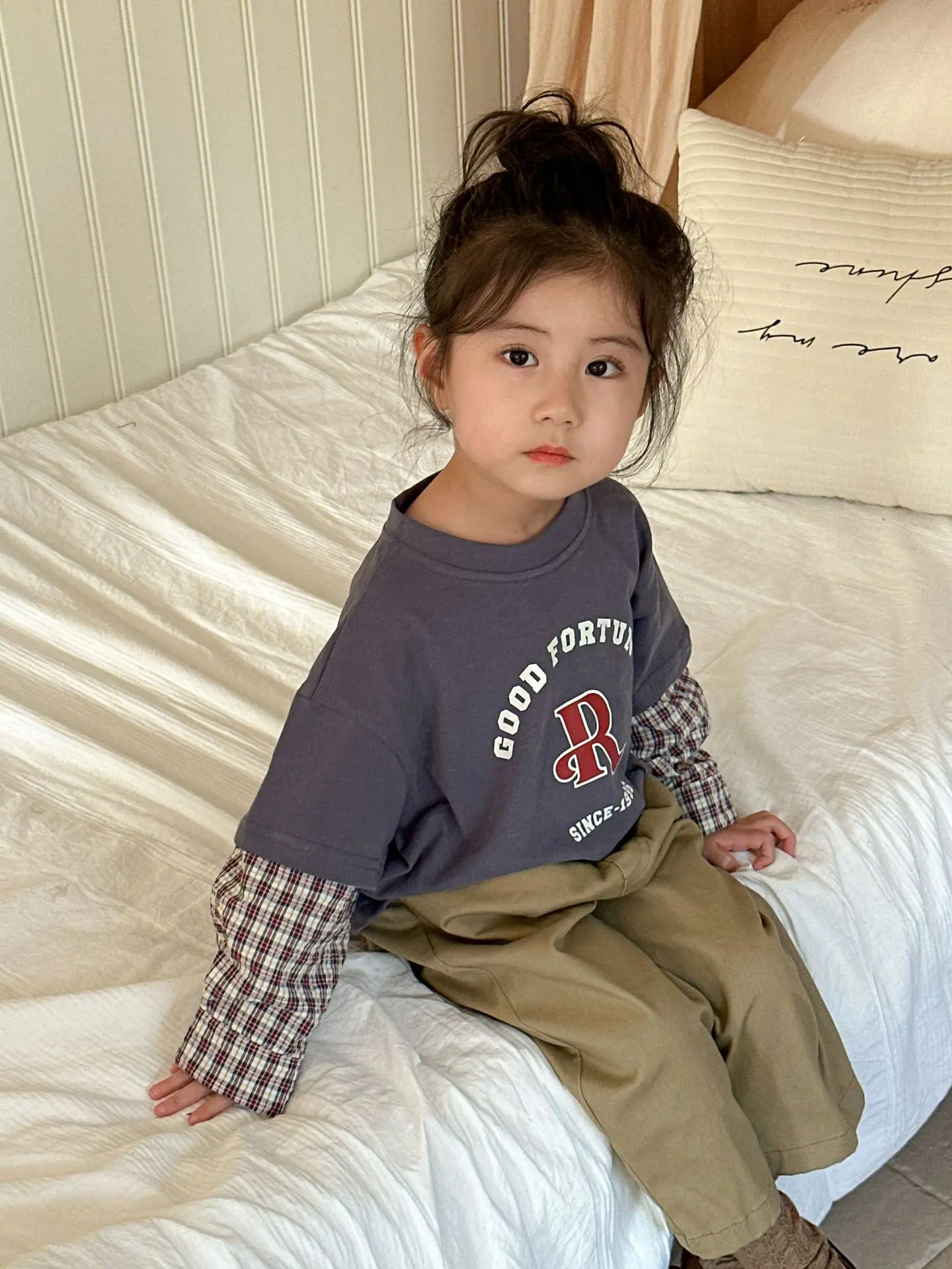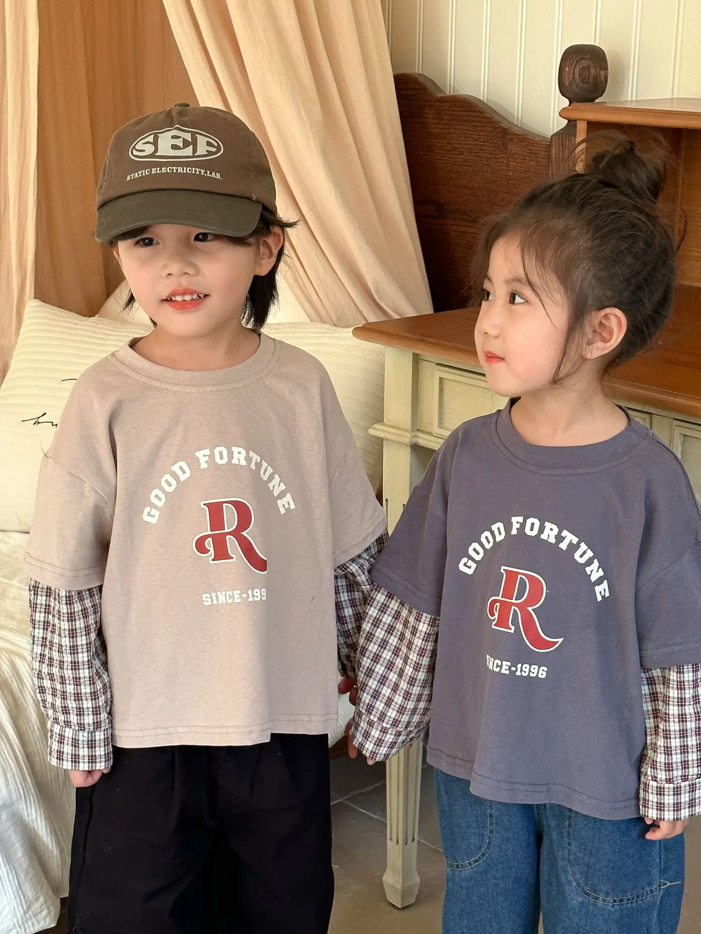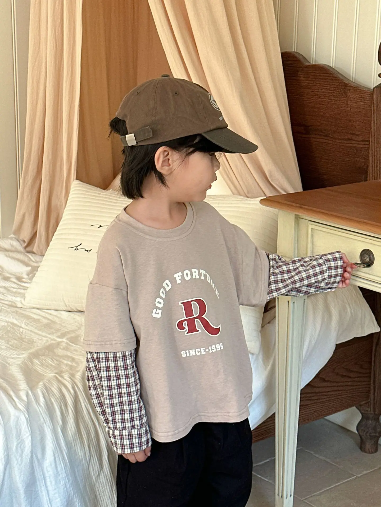 今季のトレンドを取り入れたキッズトップス。袖のパッチワークとレターロゴがアクセントの長袖ドッキングTシャツは、秋の子供服として最適。柔らかい綿素材で作られたカジュアルなトップスは、子供たちのオシャレさを引き立てます。2種類のカラーからお選びいただけます。