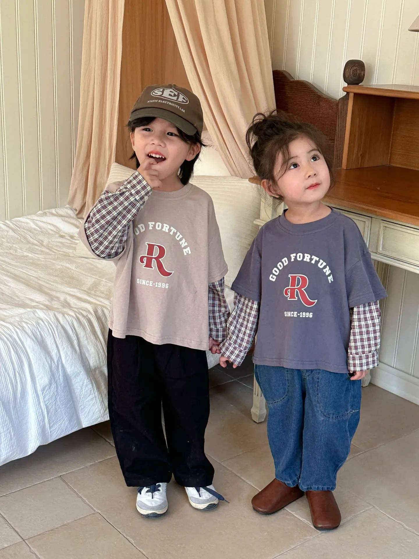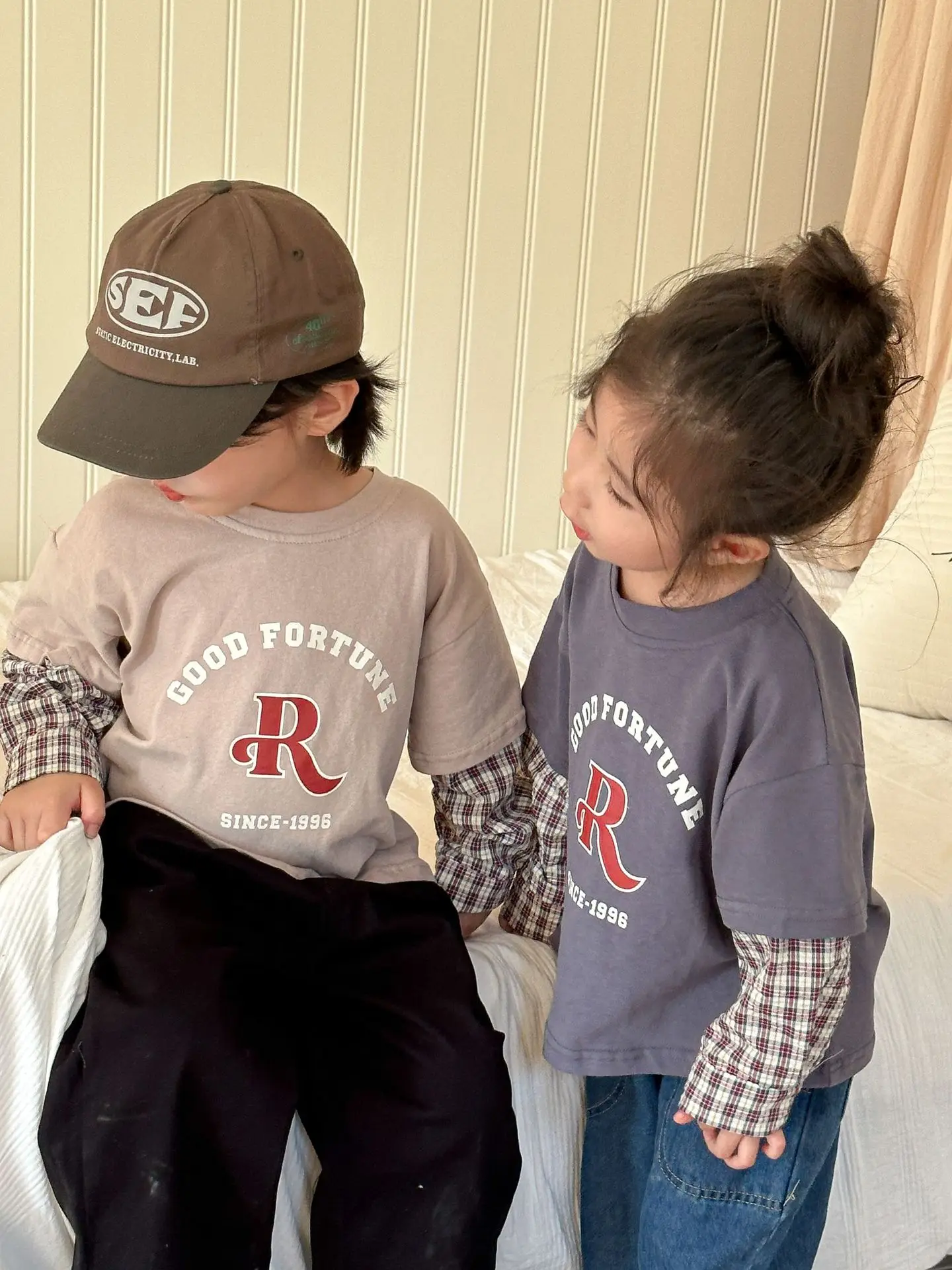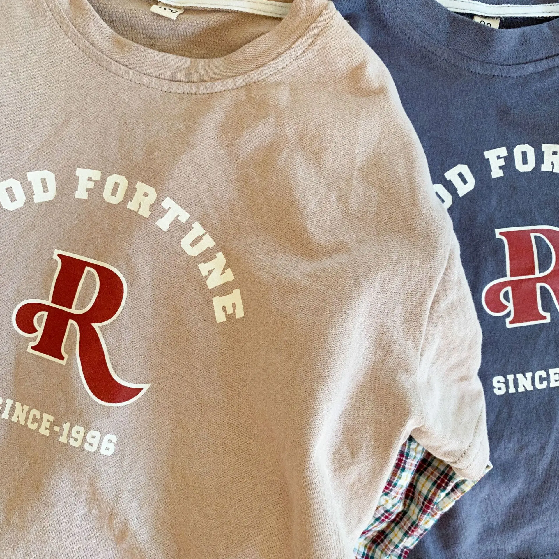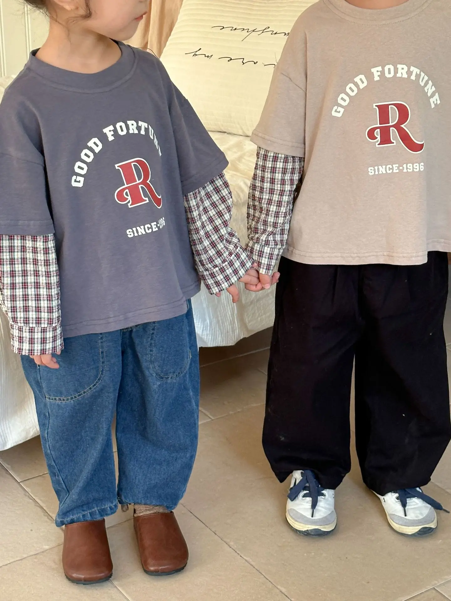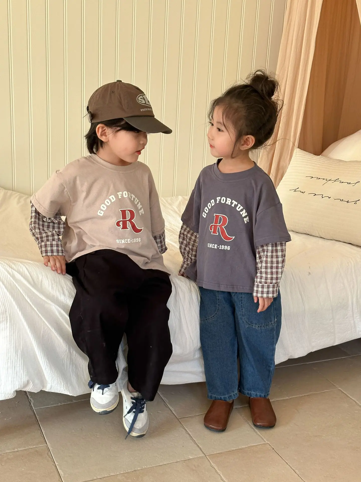 今季のトレンドを取り入れたキッズトップス。袖のパッチワークとレターロゴがアクセントの長袖ドッキングTシャツは、秋の子供服として最適。柔らかい綿素材で作られたカジュアルなトップスは、子供たちのオシャレさを引き立てます。2種類のカラーからお選びいただけます。