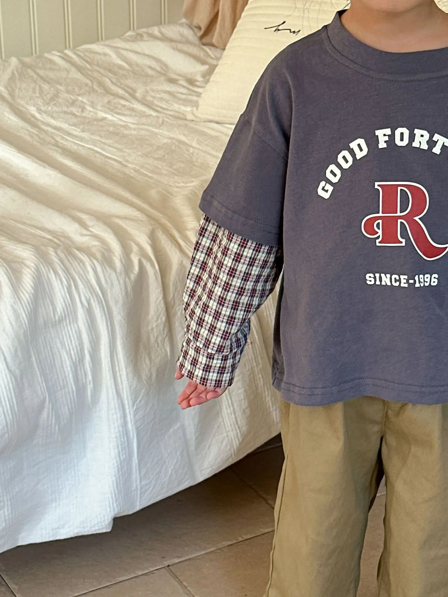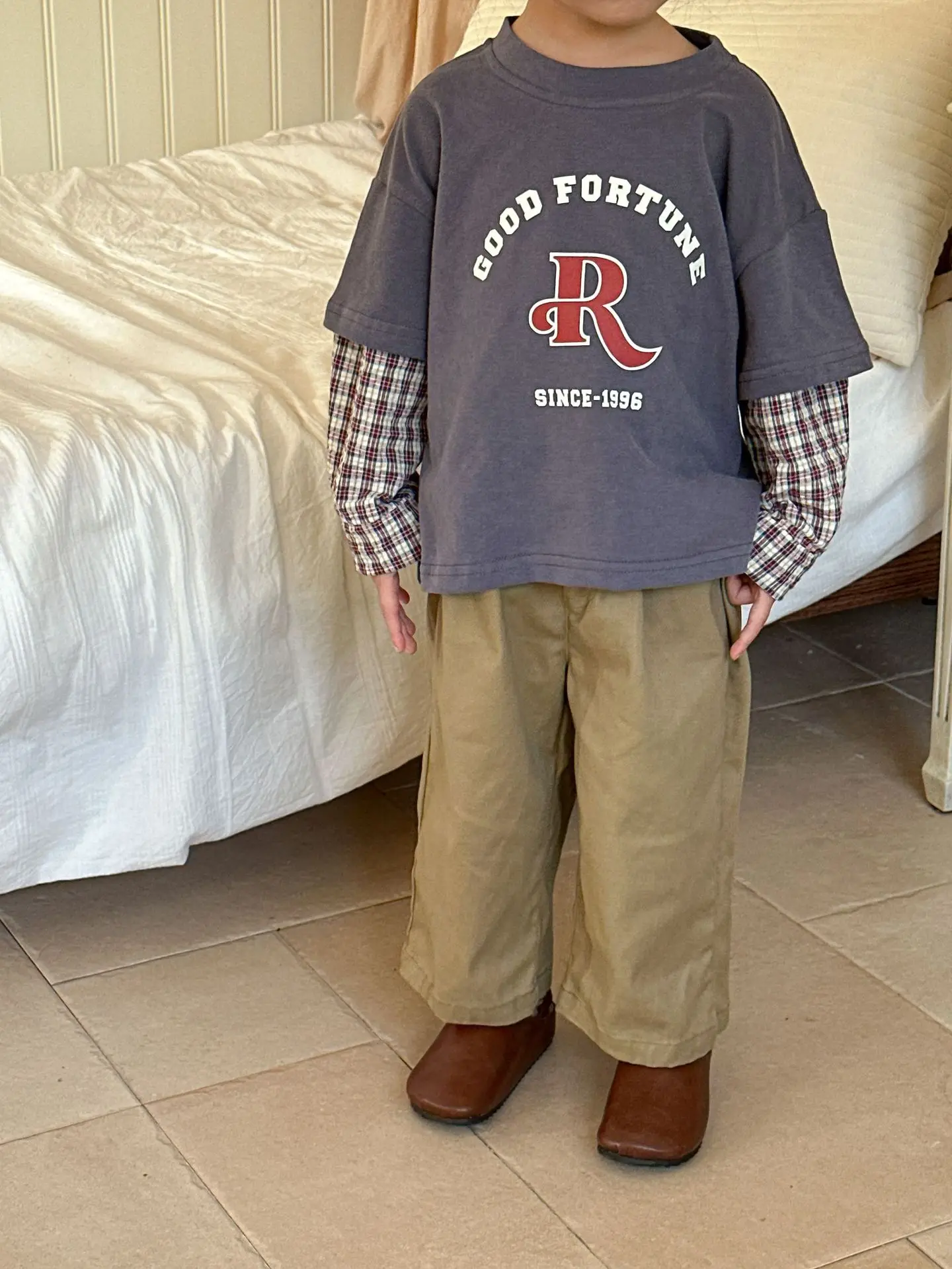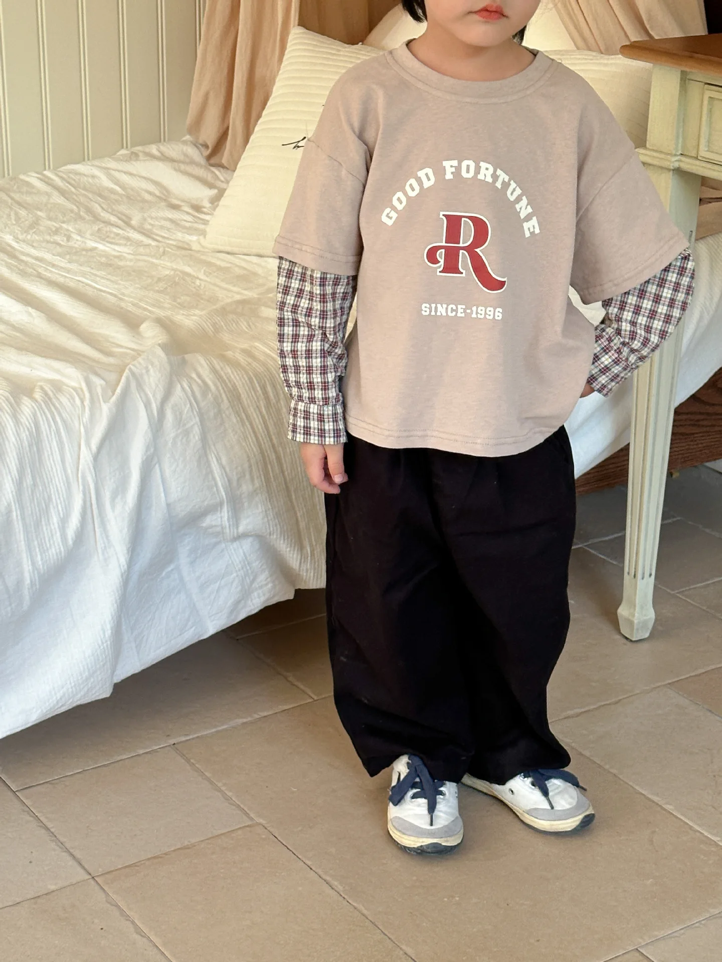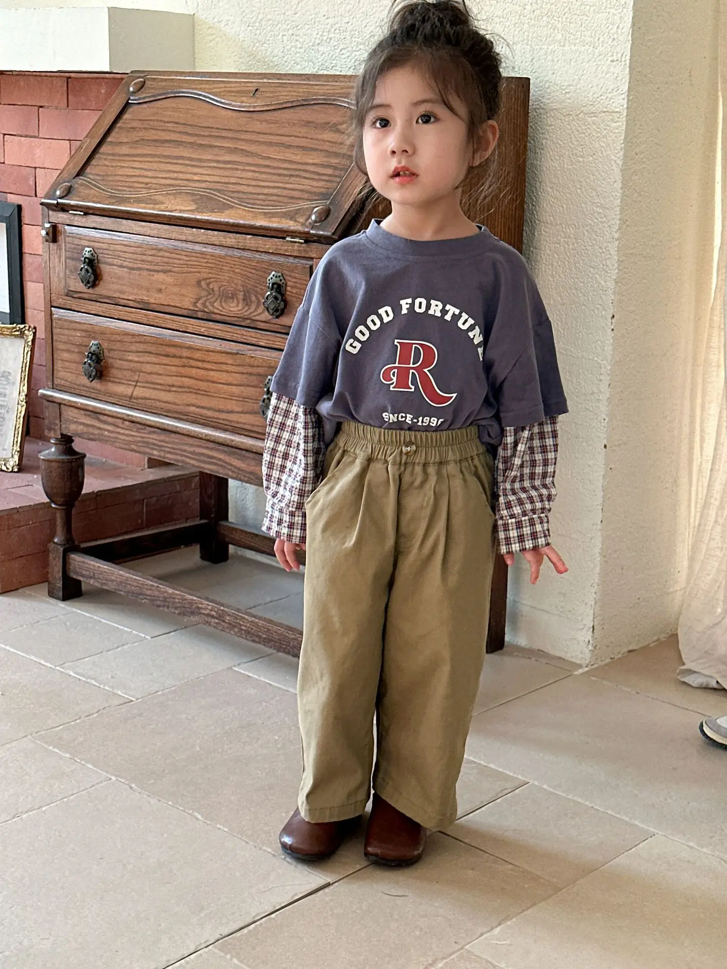 今季のトレンドを取り入れたキッズトップス。袖のパッチワークとレターロゴがアクセントの長袖ドッキングTシャツは、秋の子供服として最適。柔らかい綿素材で作られたカジュアルなトップスは、子供たちのオシャレさを引き立てます。2種類のカラーからお選びいただけます。