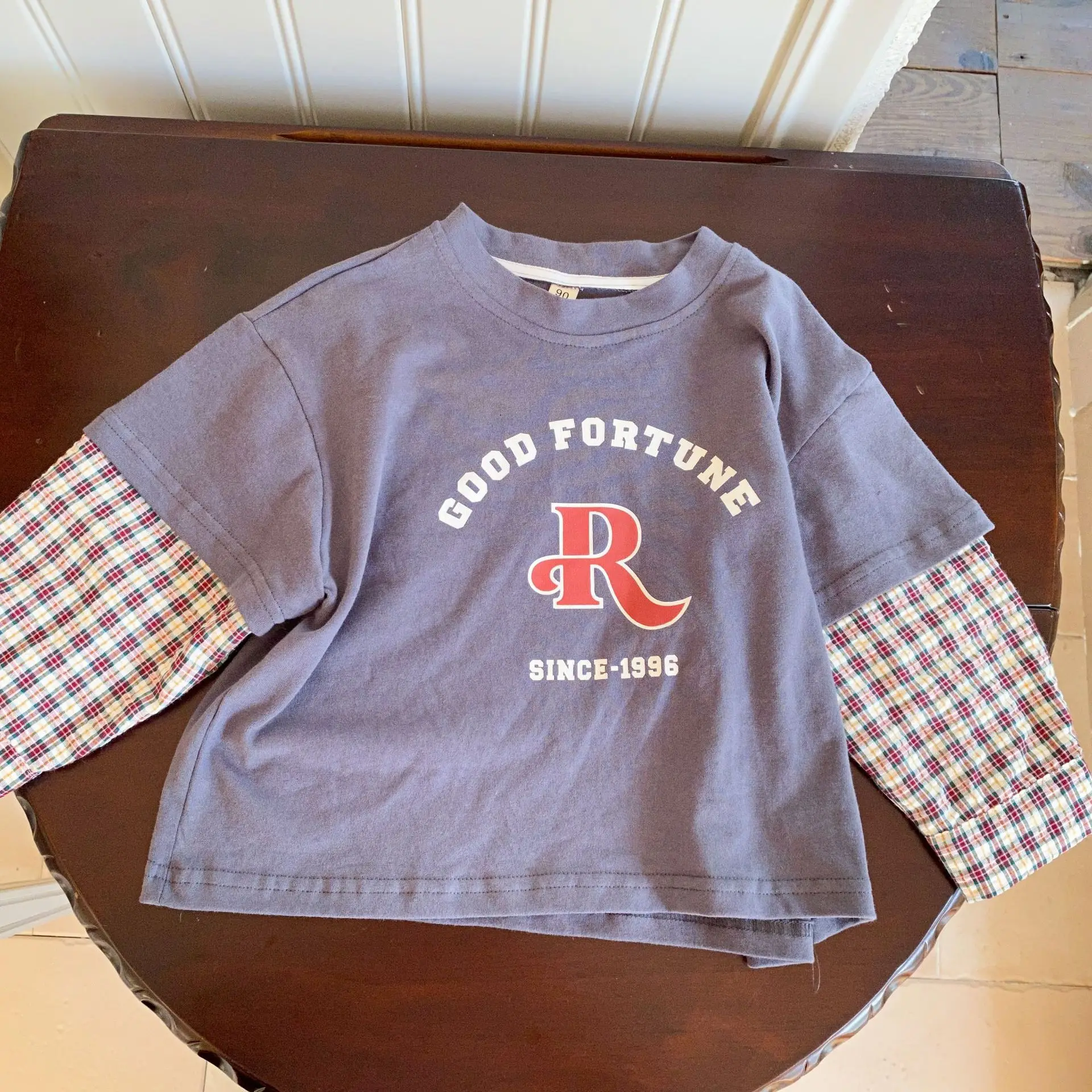キッズトップス 長袖ドッキングTシャツ 袖パッチワーク レターロゴ 2カラー【mh0006428】