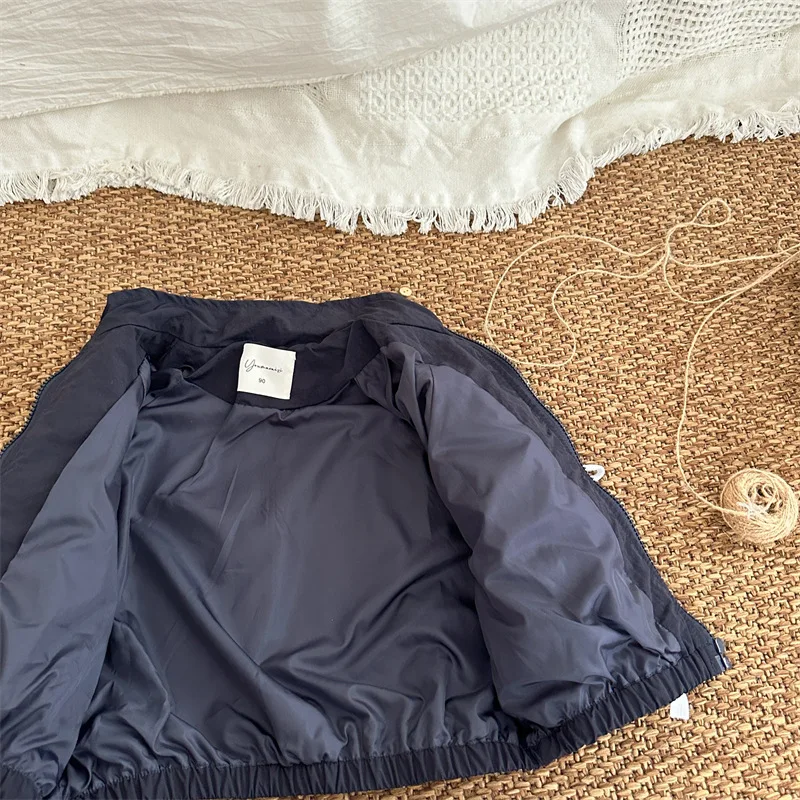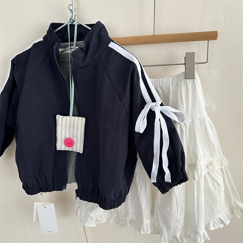 ブラックのスタンドカラーが特徴的なキッズ用ジップアップジャンパージャケットです。サイドに施されたリボンがポイントで、韓国スタイルのカジュアルながらもシックなデザインが魅力。ゆったりとしたシルエットで、秋冬のコーディネートにぴったりです。お子様が快適に過ごせるよう、機能性も考慮された一着です。