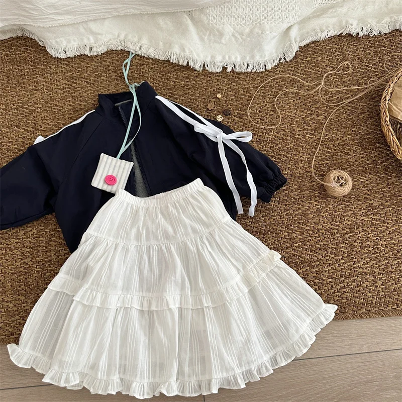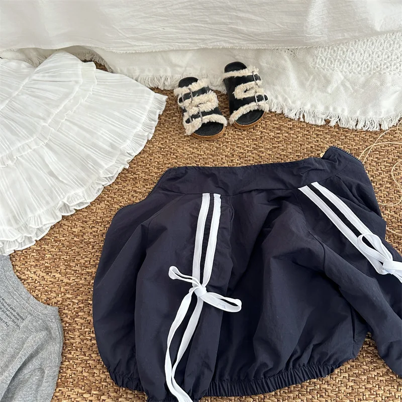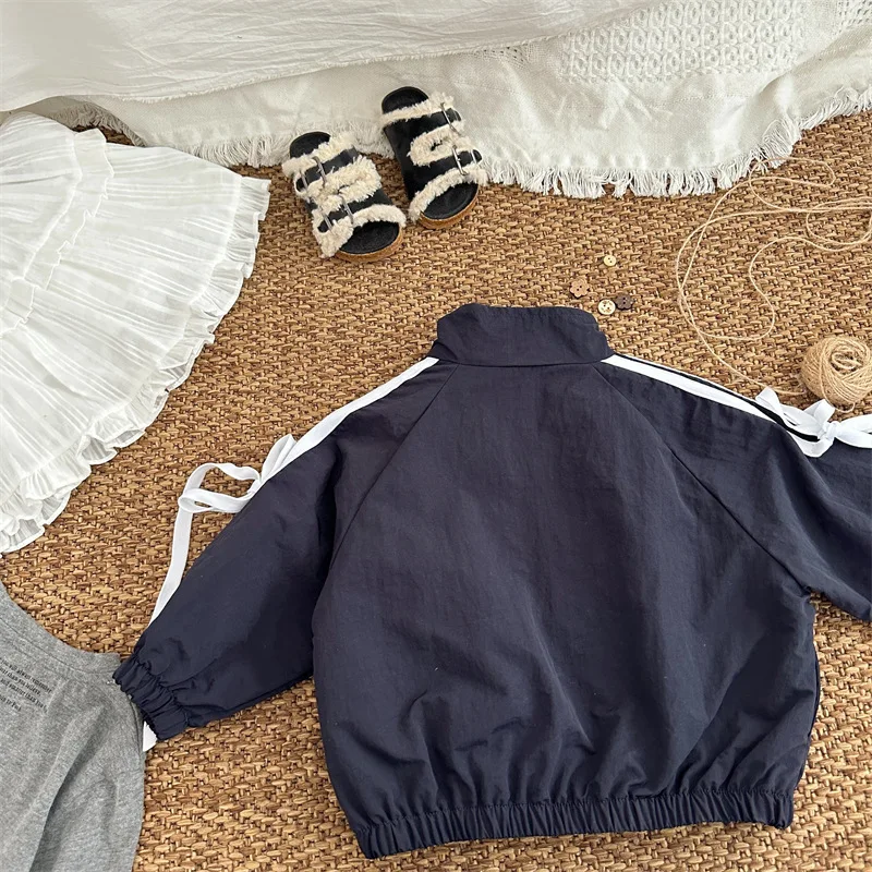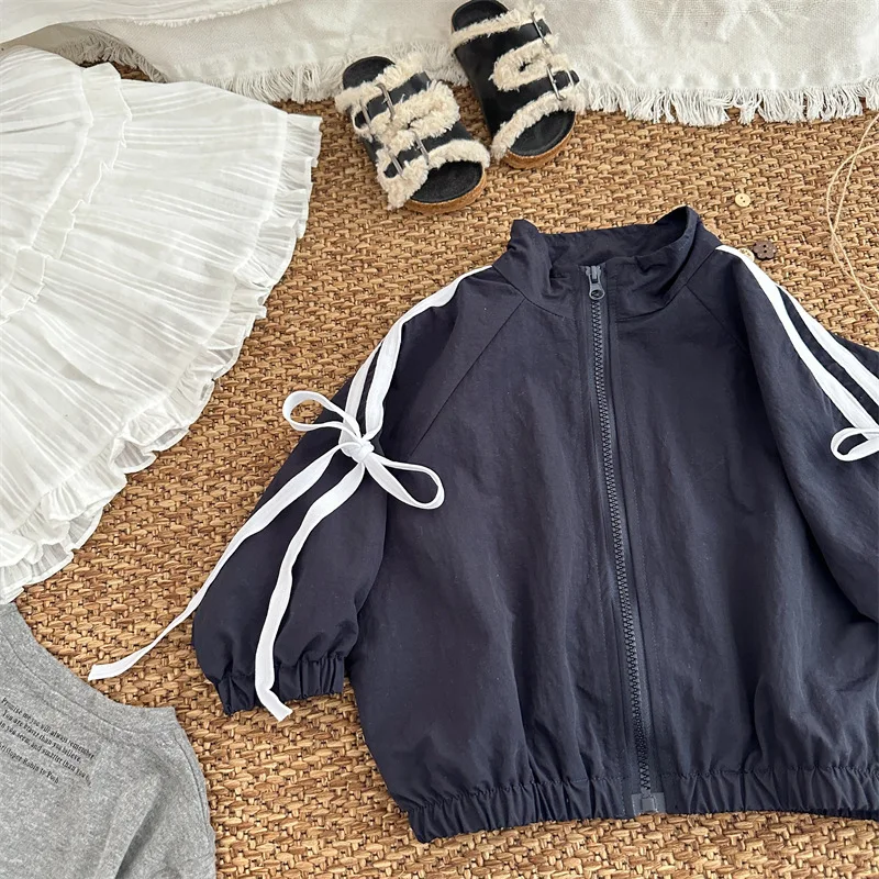 #キッズアウター #ジップアップ #サイドリボン #スタンドカラー #ブラックジャケット #韓国スタイル #秋冬コーデ #子供服 #カジュアルシック