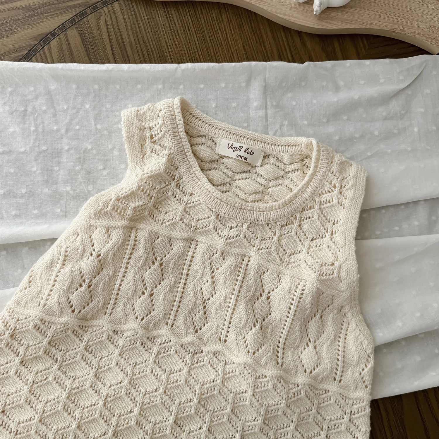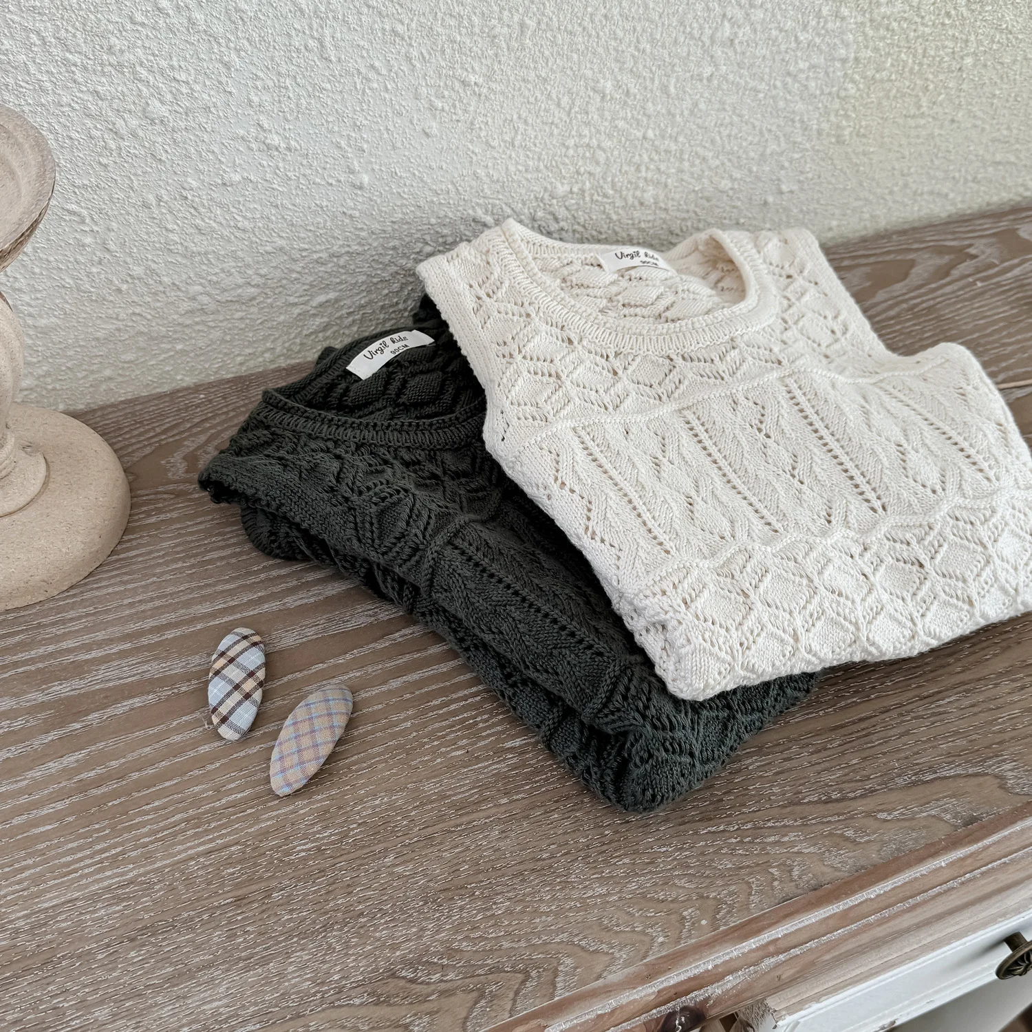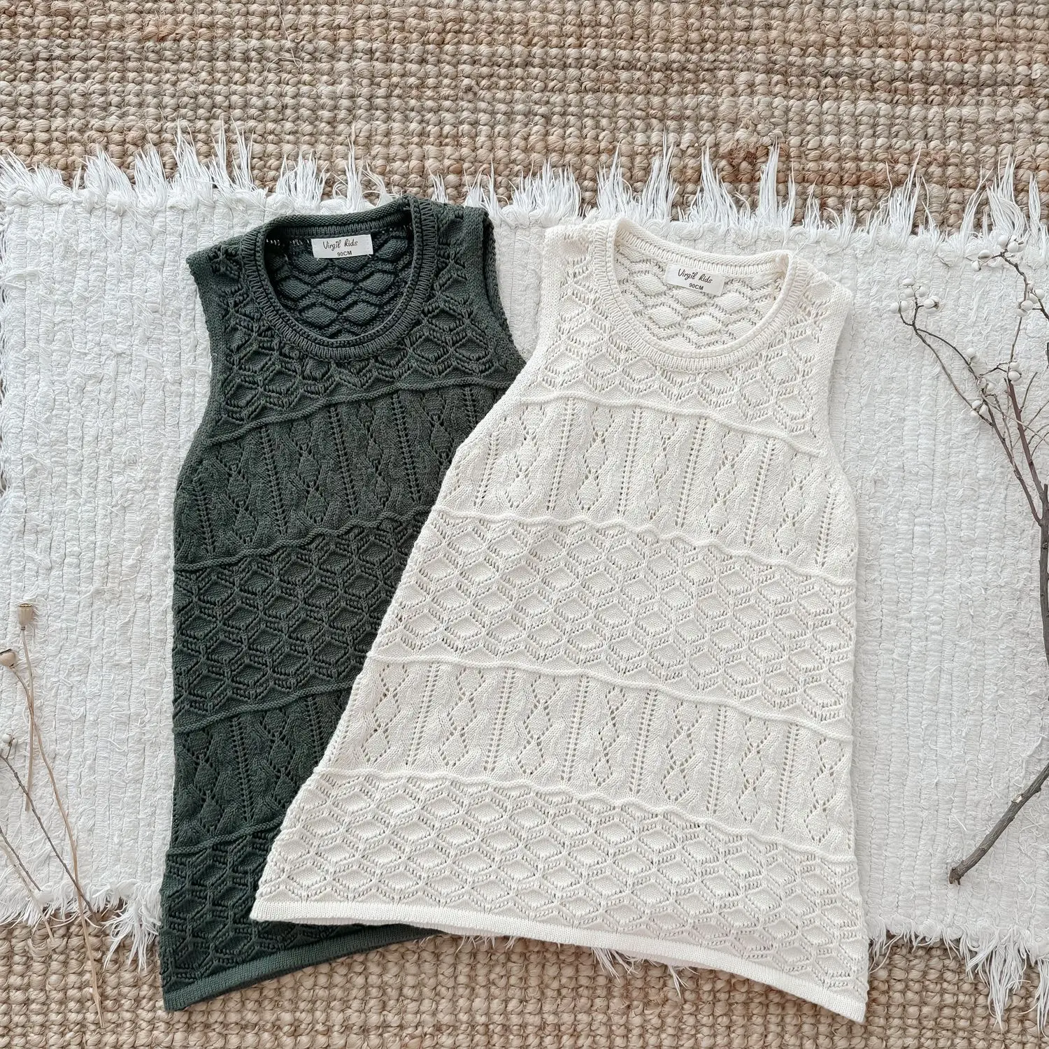 秋のコーディネートにぴったりなレースニットの透け感が美しいノースリーブオーバーワンピースです。韓国スタイルのデザインで、軽やかな透け感と華やかなレースが特徴。カジュアルながらもエレガントさを演出し、おしゃれなお子様のレイヤードスタイルにぴったりの一着です。秋のファッションに華やかさをプラスするアイテムです。