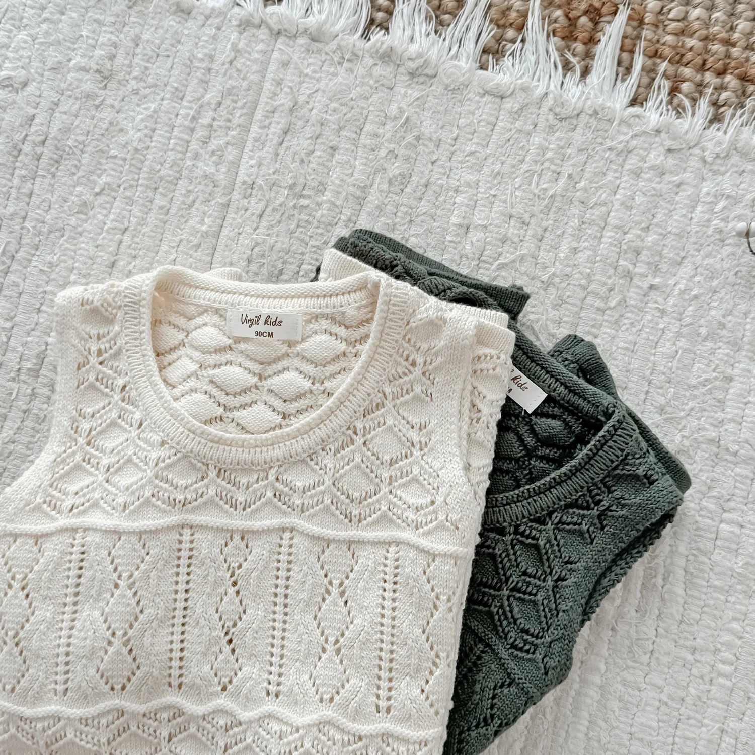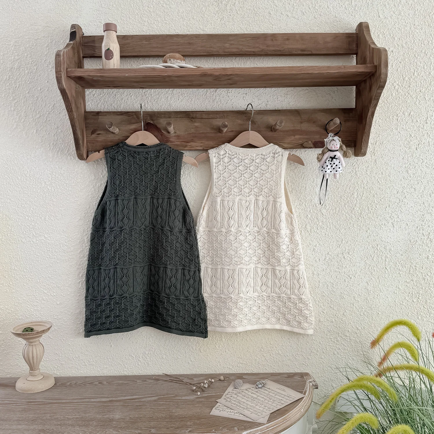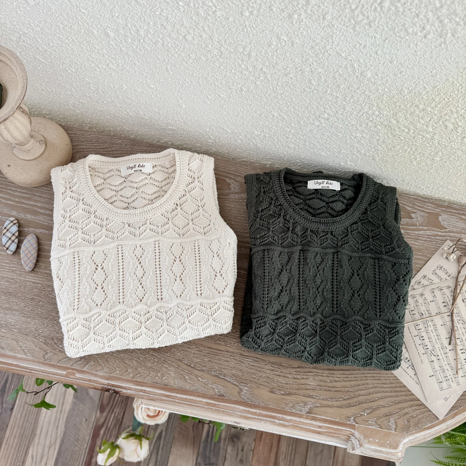 秋のコーディネートにぴったりなレースニットの透け感が美しいノースリーブオーバーワンピースです。韓国スタイルのデザインで、軽やかな透け感と華やかなレースが特徴。カジュアルながらもエレガントさを演出し、おしゃれなお子様のレイヤードスタイルにぴったりの一着です。秋のファッションに華やかさをプラスするアイテムです。