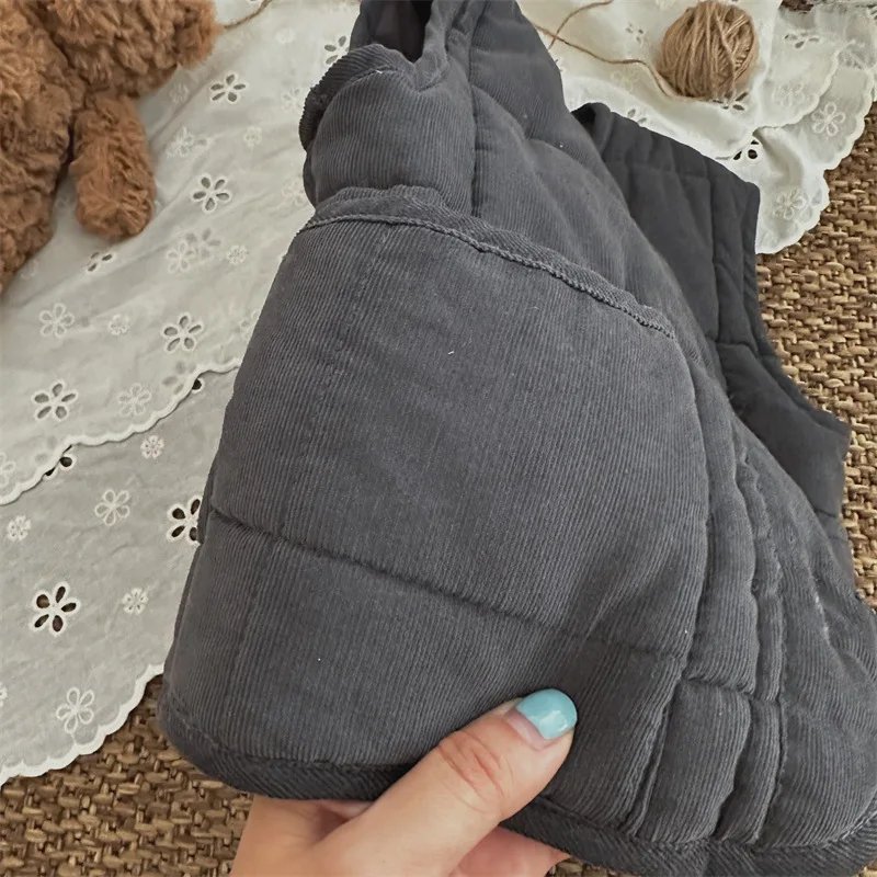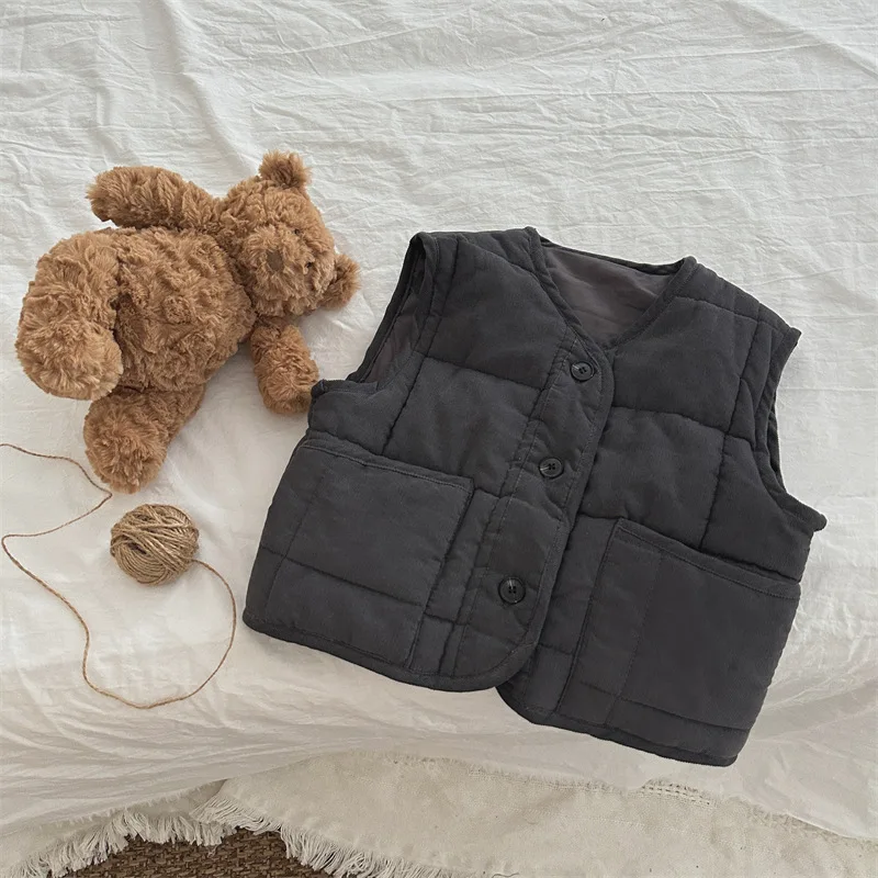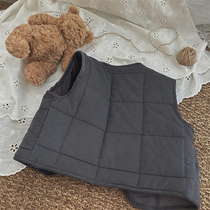 秋冬にぴったりな中綿キルティングのレトロベストコート。ダークグレーの落ち着いたカラーが、どんなコーディネートにも合わせやすいアイテムです。ポケット付きで実用性もあり、保温性の高いコットンパッド入りで寒い季節でも暖かく過ごせます。ユニセックスデザインで、男の子にも女の子にもおすすめです。