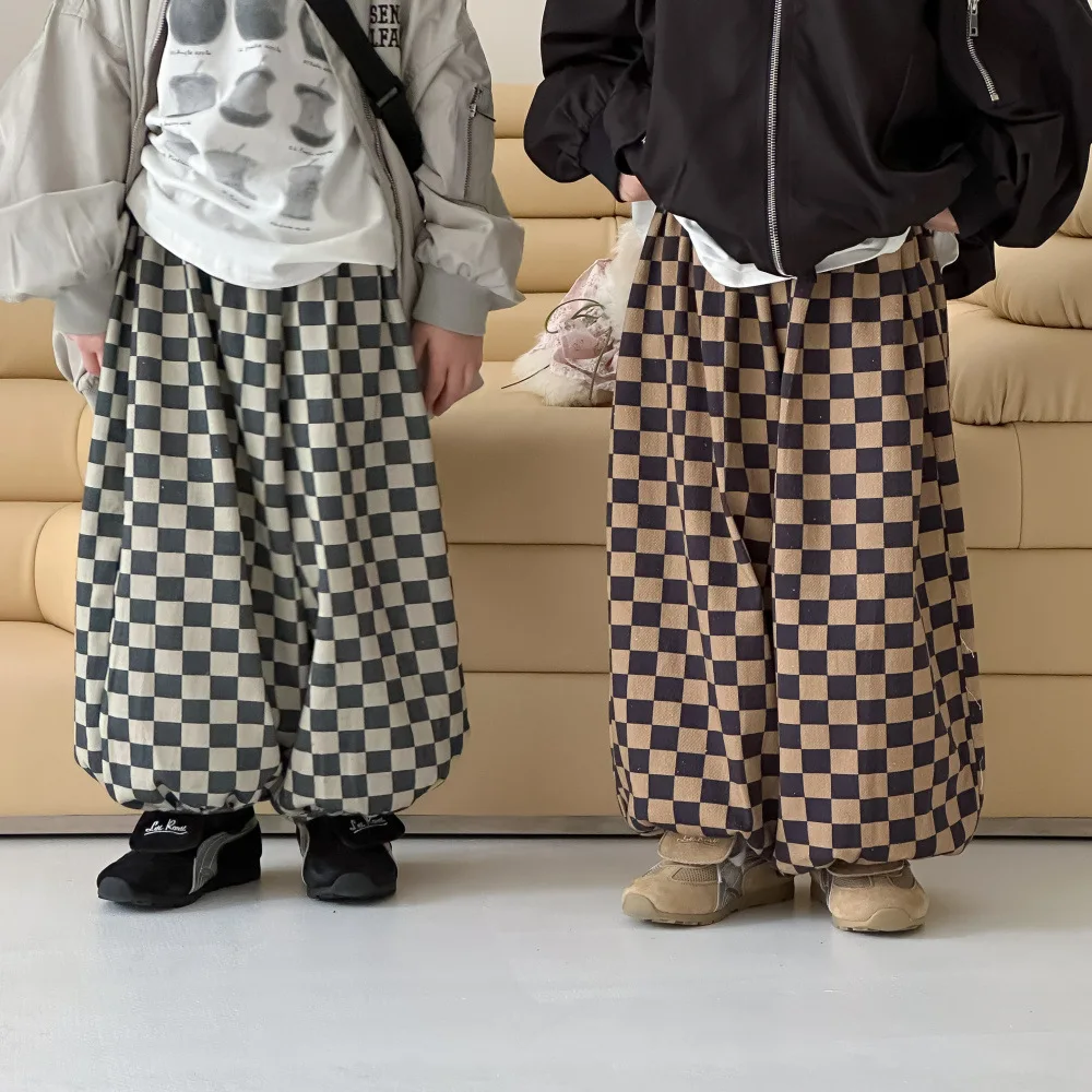 チェッカーチェック柄がポイントのキッズパンツは、ルーズなシルエットで快適さとスタイルを両立。カジュアルかつトレンド感のあるデザインは、秋のコーディネートにぴったりです。ウエストはゴム仕様で、動きやすさを追求しつつ、リラックスした着心地を提供します。日常使いからお出かけまで幅広く活躍するアイテムで、トップスを選ばずにおしゃれを楽しめる一枚です。