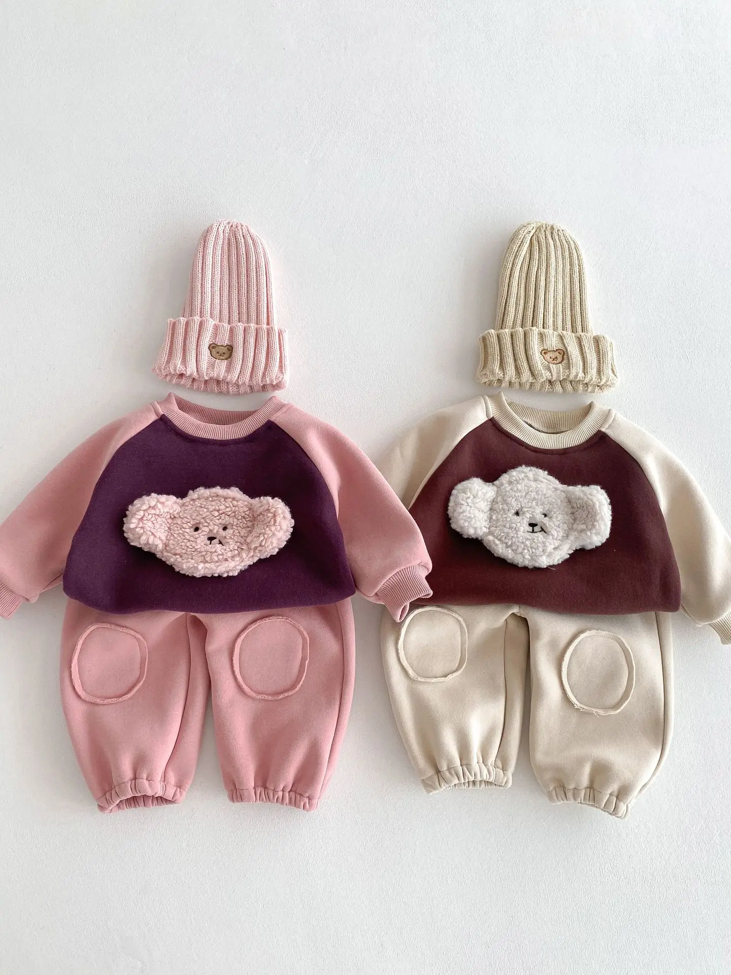 ベビーキッズセットアップ 2点セット ベアくまパッチワーク裏フリース長袖スウェットシャツ+ロングスウェットパンツ【mh0007859】