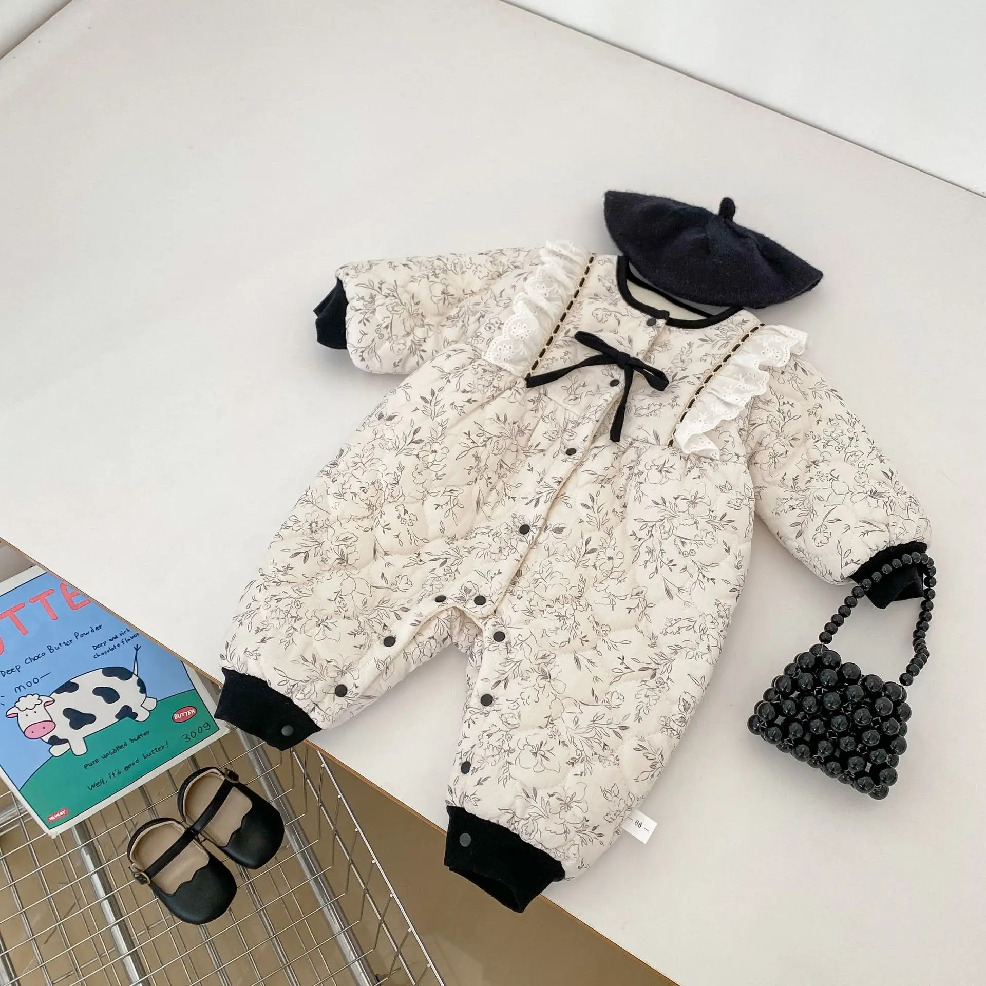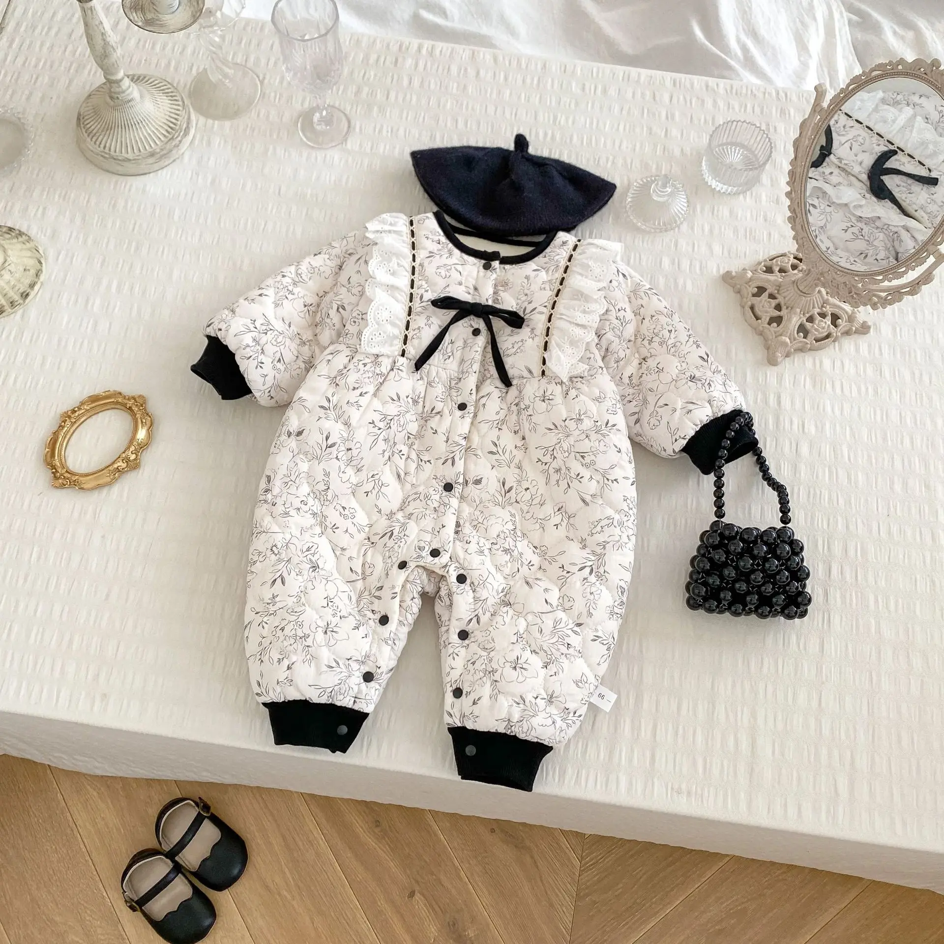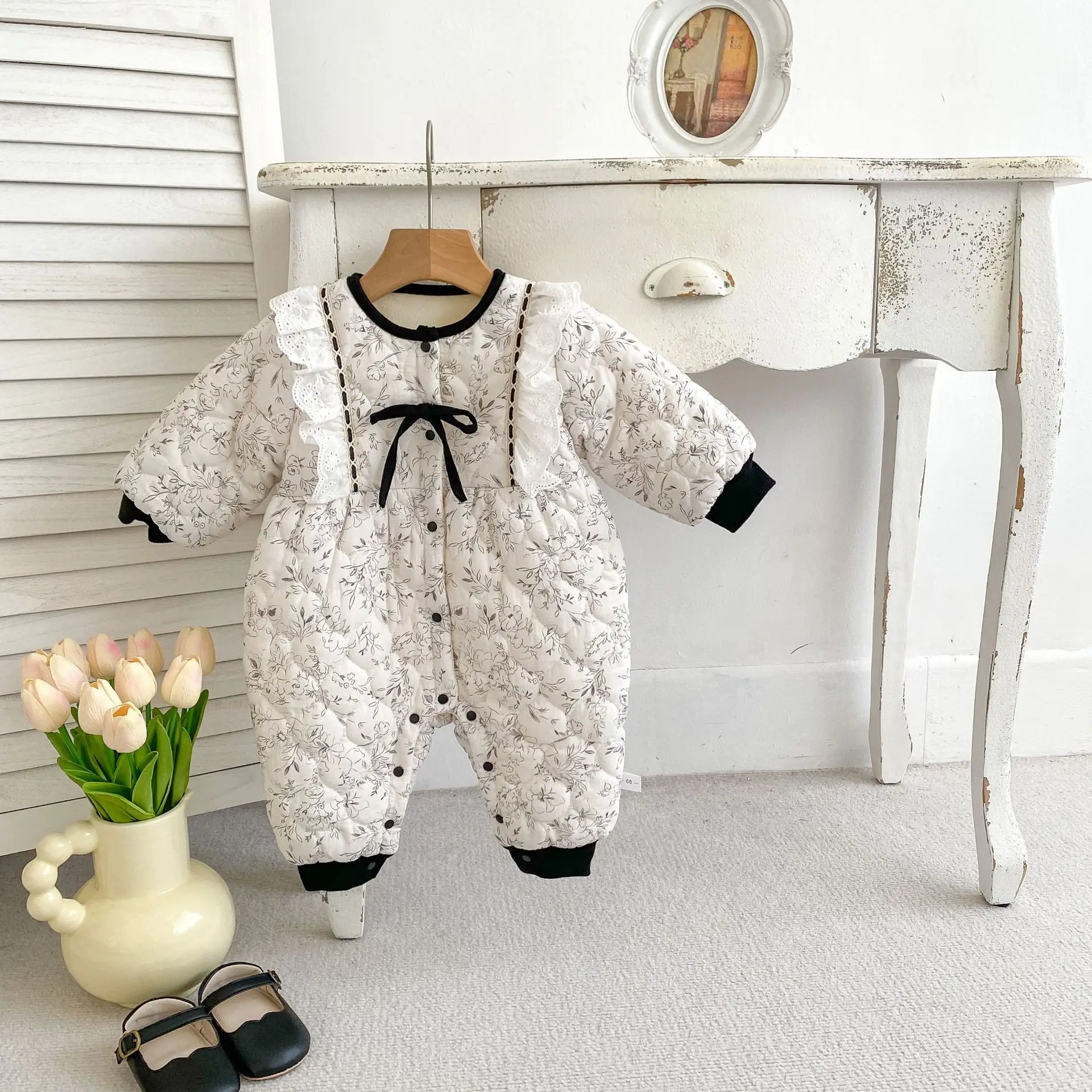 ベビーアウタージャンプスーツ シックフラワーレースフリルリボンキルティング防寒長袖ロンパース【mh0007876】