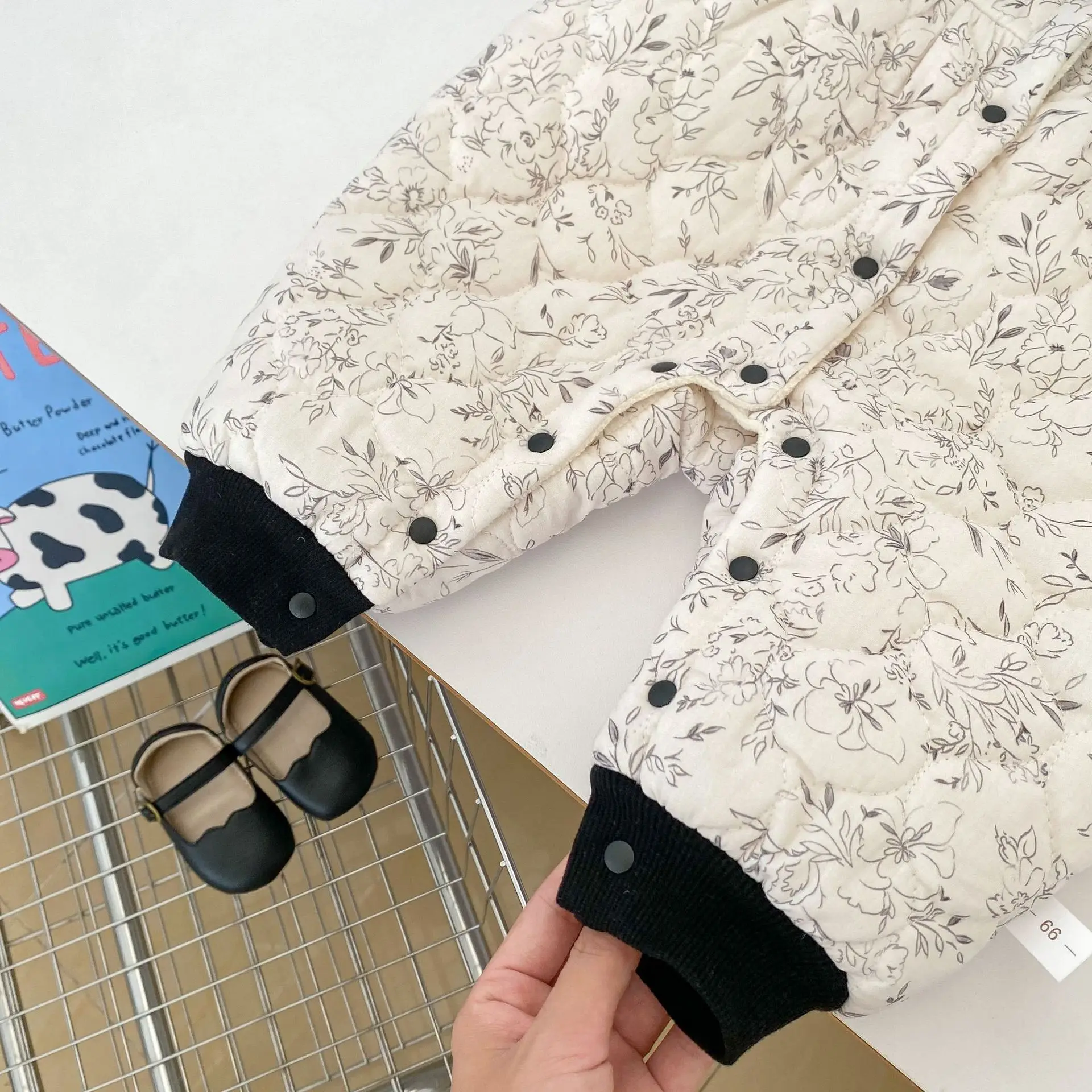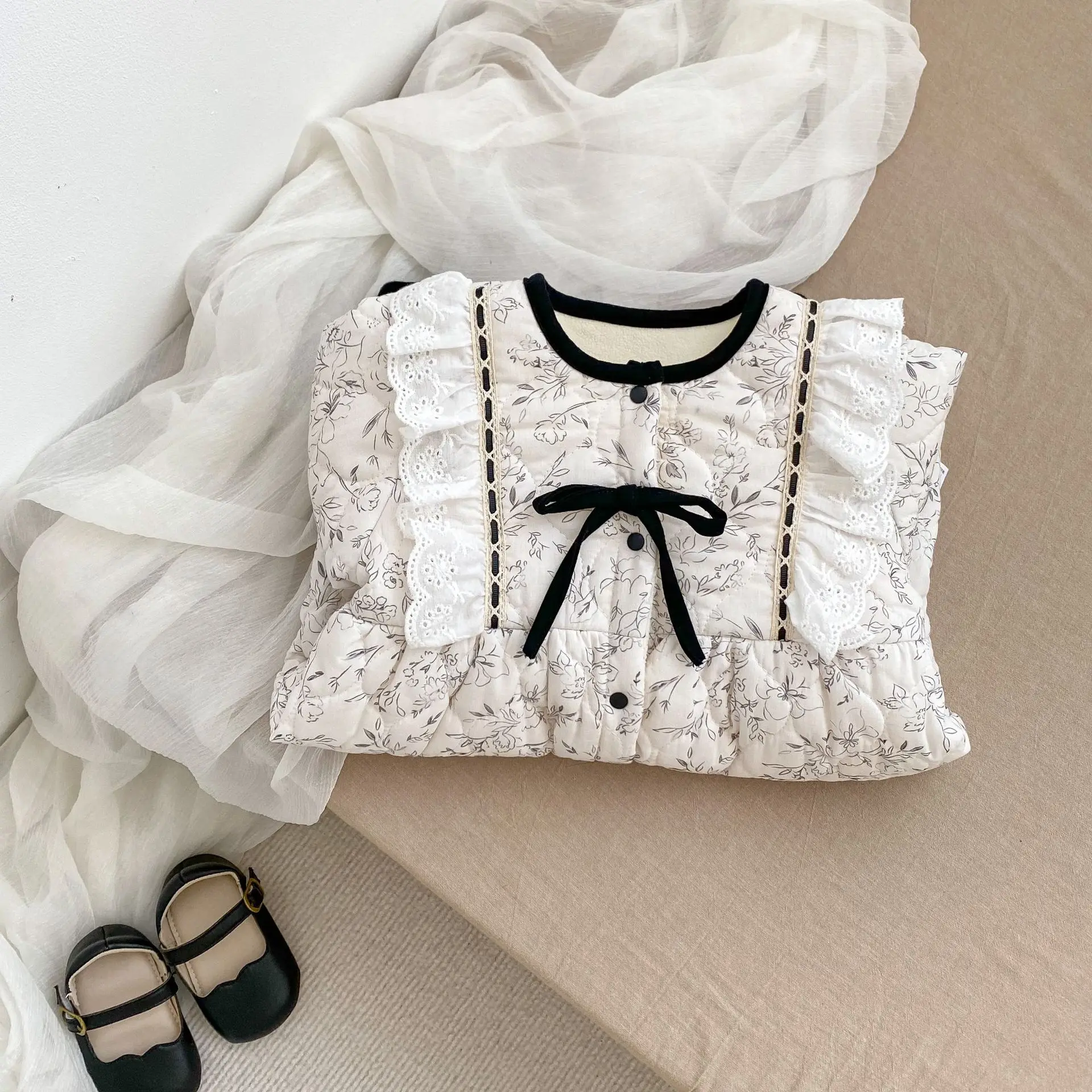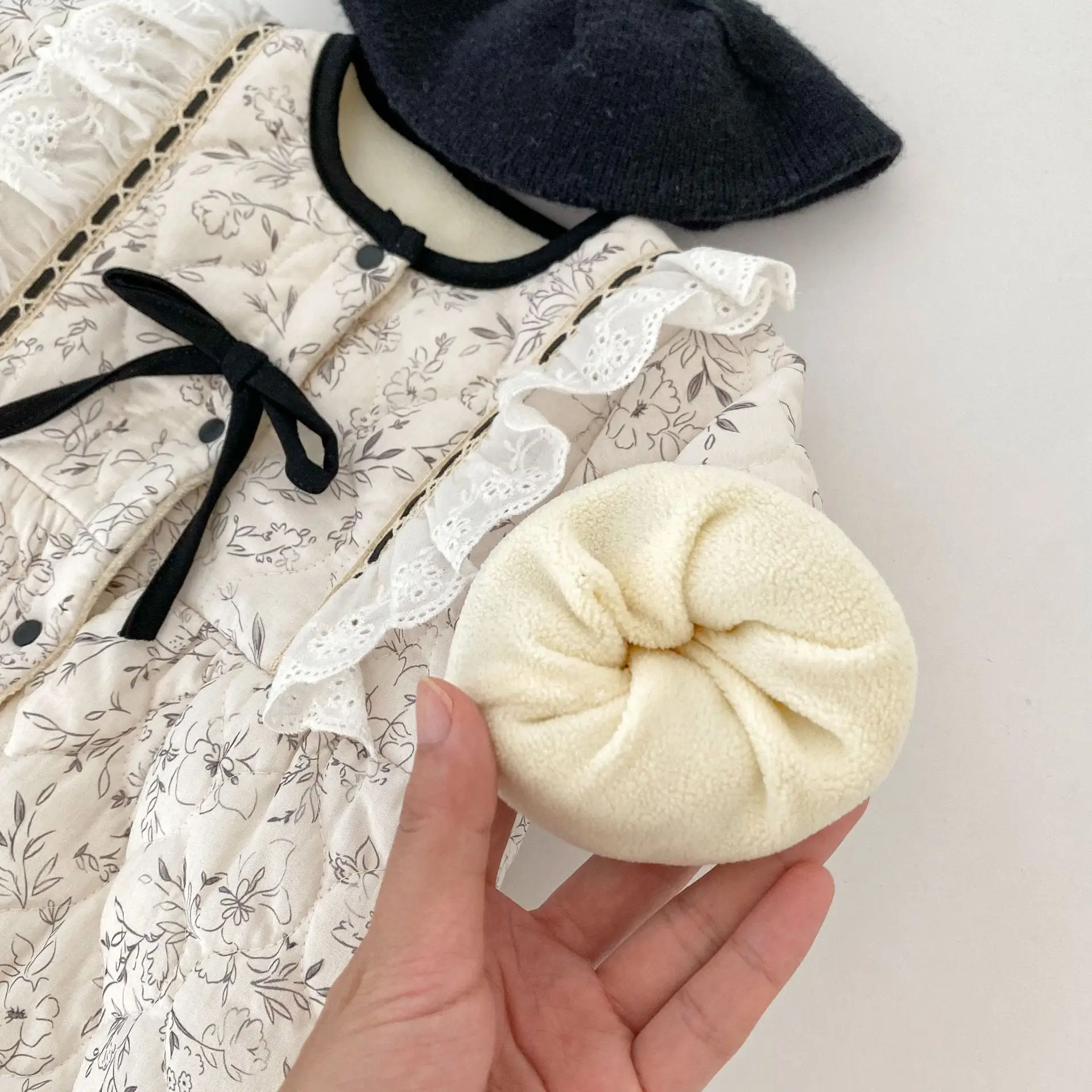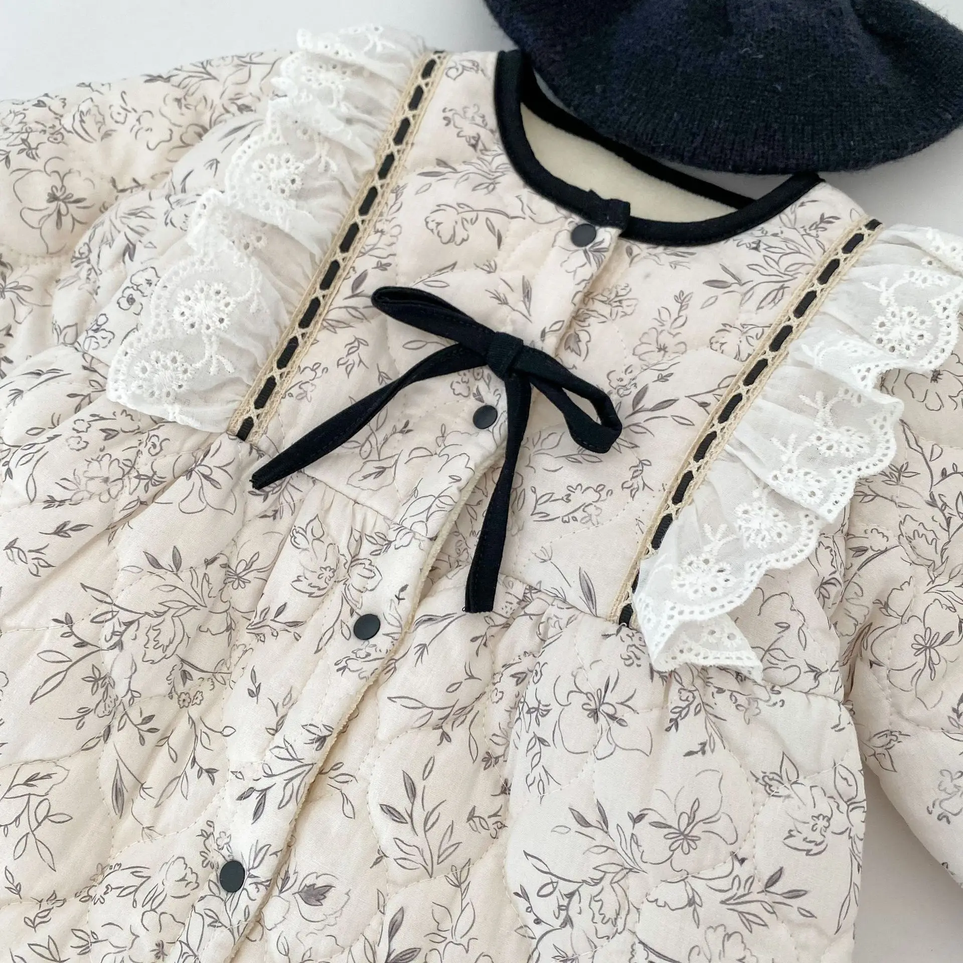 ベビーアウタージャンプスーツ シックフラワーレースフリルリボンキルティング防寒長袖ロンパース【mh0007876】