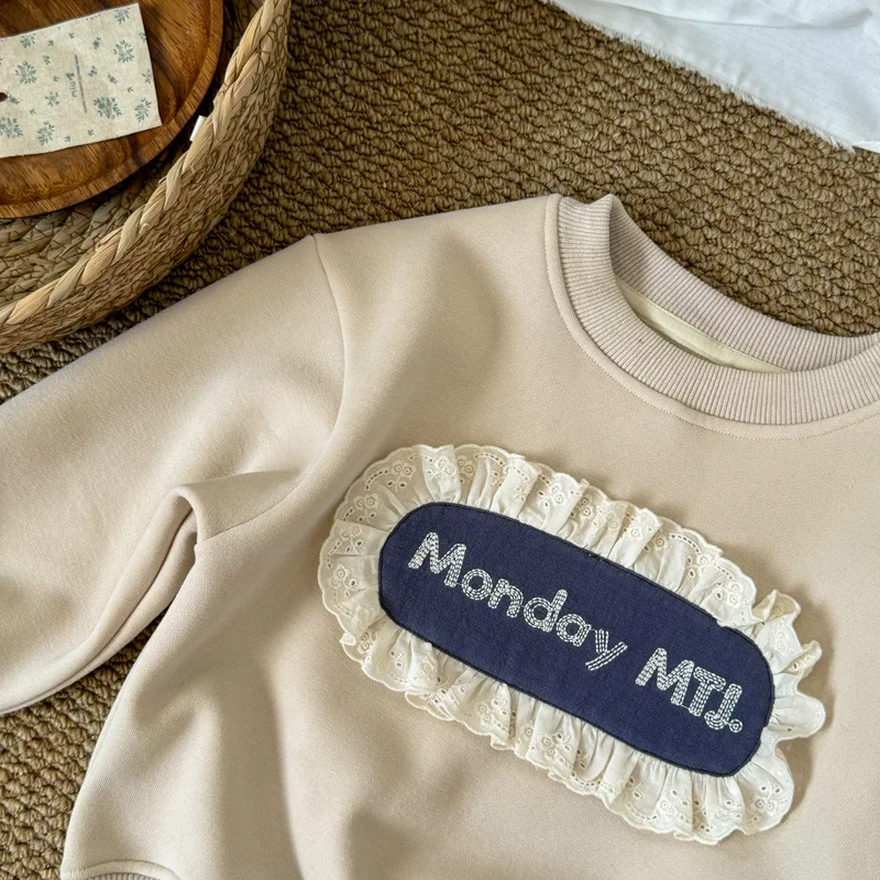 レースフリルが施されたアップリケ付き長袖スウェットシャツと、レースフリルスカートがドッキングされたロングパンツのセットアップは、エレガントで可愛らしいデザインが魅力です。裏フリース仕様で保温性が高く、寒い季節に最適です。トップスの刺繍ディテールが上品なアクセントとなり、ボトムスのスカート風デザインが動きやすさとおしゃれさを両立しています。日常のカジュアルシーンからお出かけまで幅広く活躍するアイテムです。