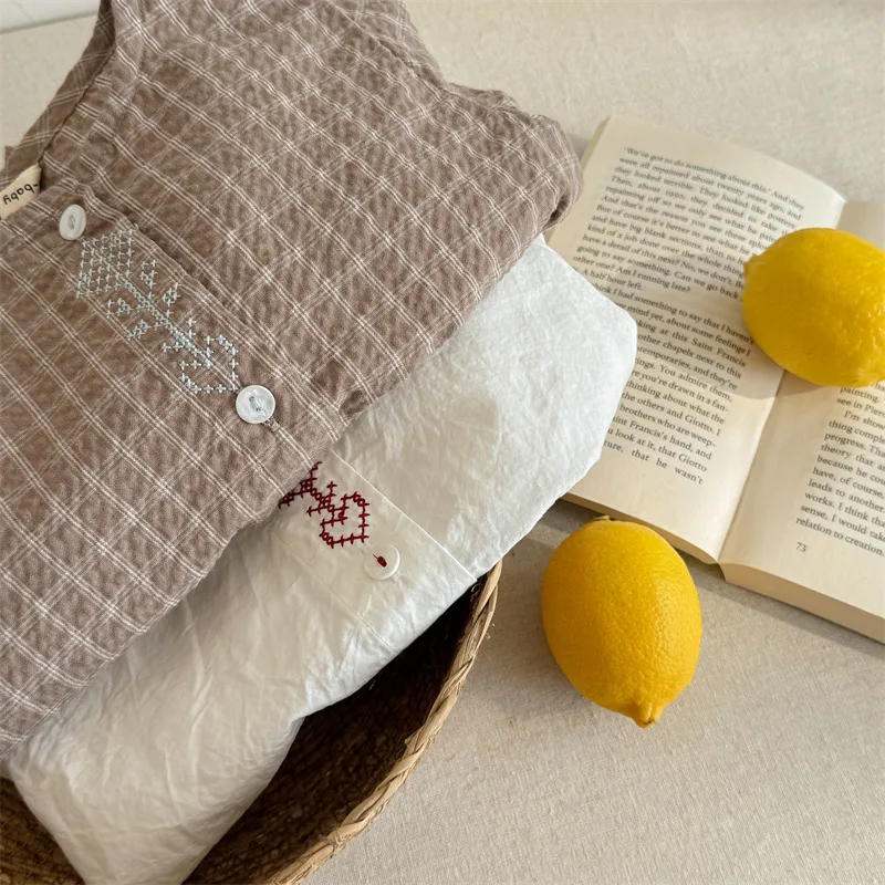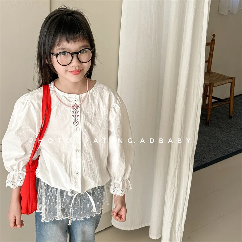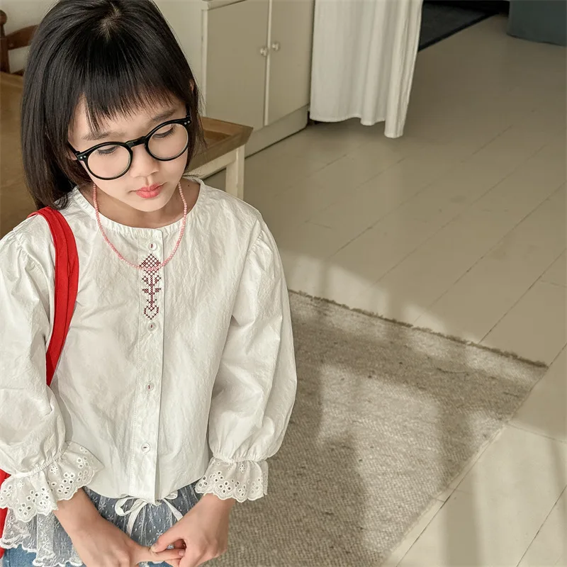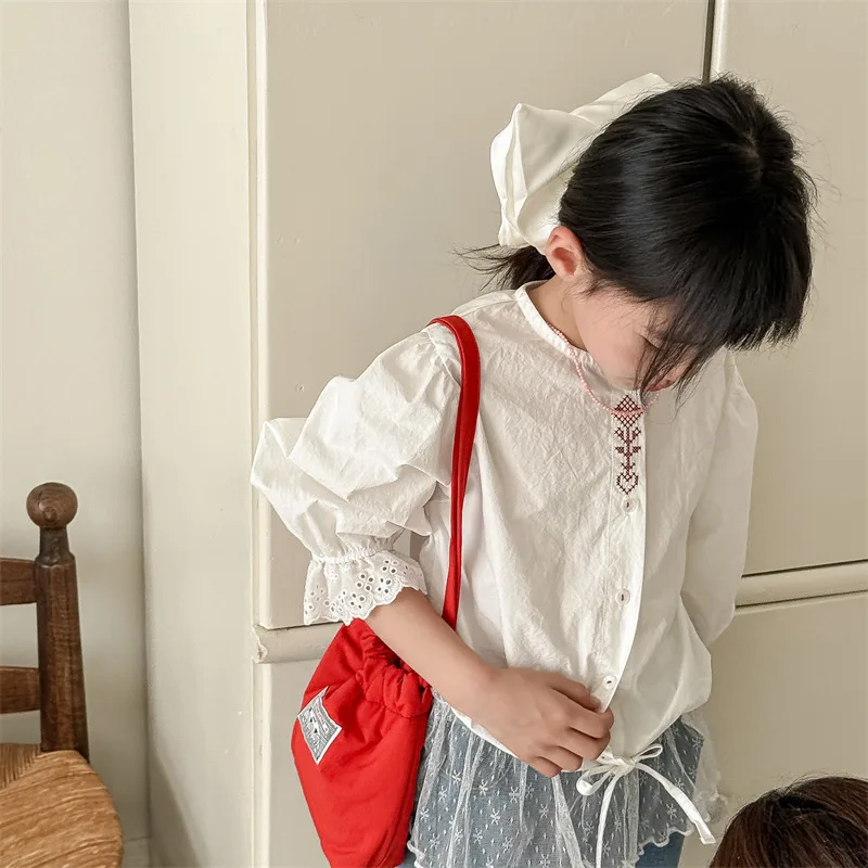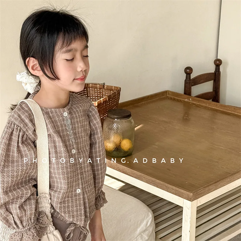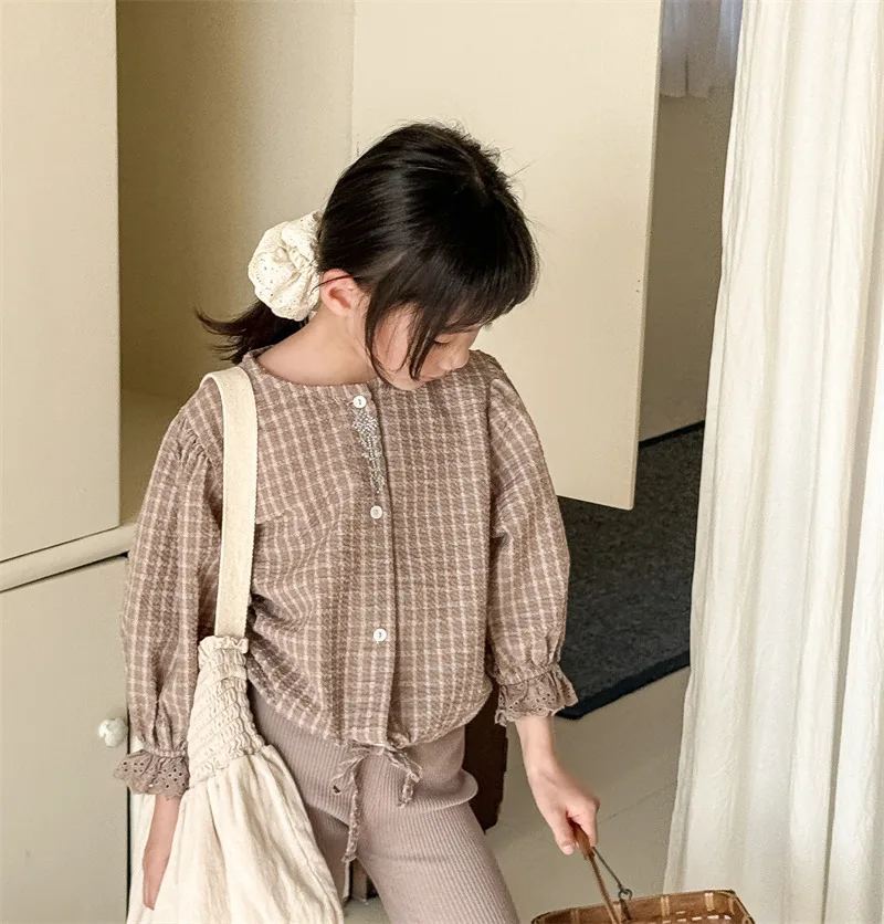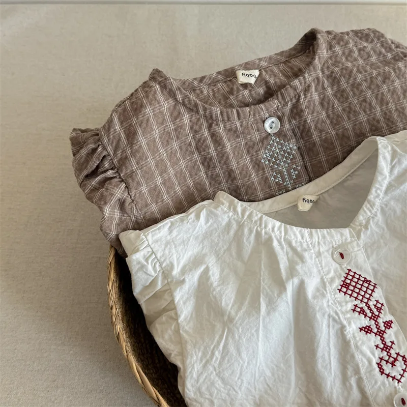 キッズトップス 刺繍ステッチワンポイントチェック/無地長袖パフスリーブブラウス【mh0008648】