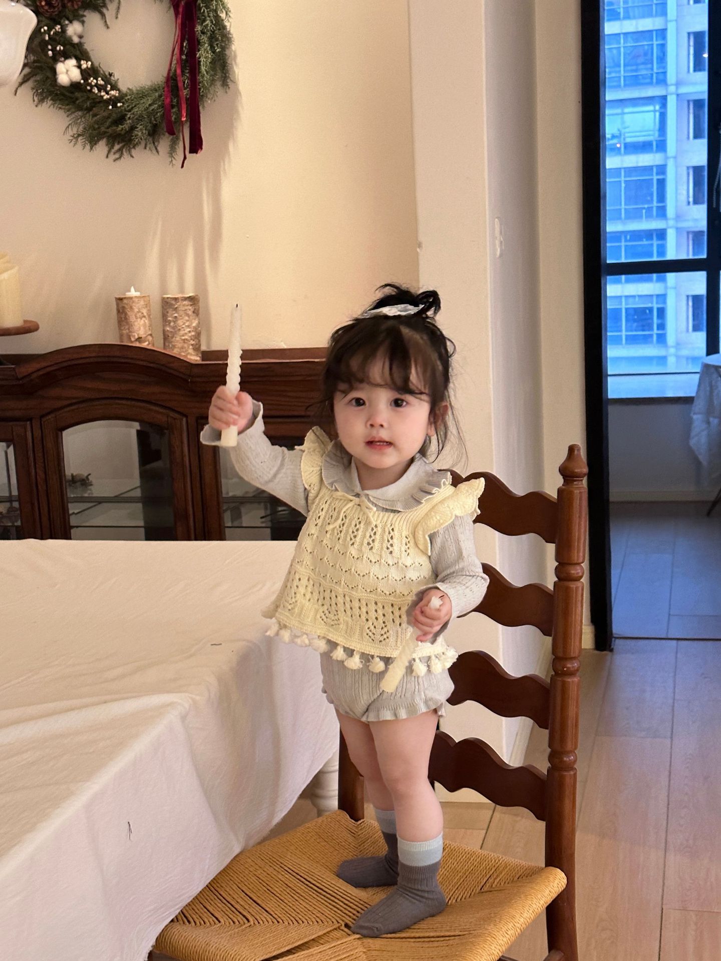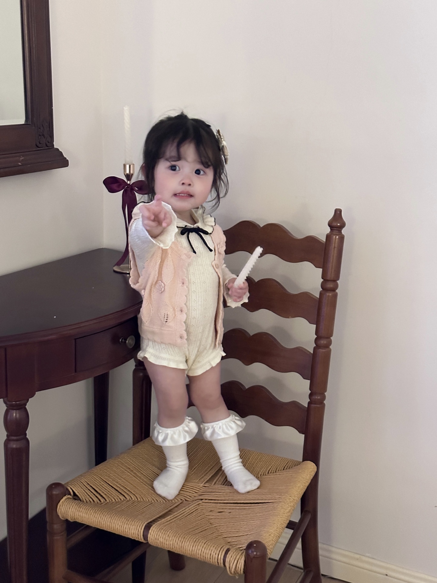 フリル襟とリボンが特徴のニット長袖ボディスーツが登場しました。柔らかなニット素材を使用しており、赤ちゃんの肌に優しい着心地を提供します。襟元のフリルとリボンが可愛らしさを引き立て、特別な日のおしゃれにもぴったりです。股下はスナップボタン仕様で、おむつ替えもスムーズに行えます。デイリー使いにも最適な、上品でかわいい一枚です。