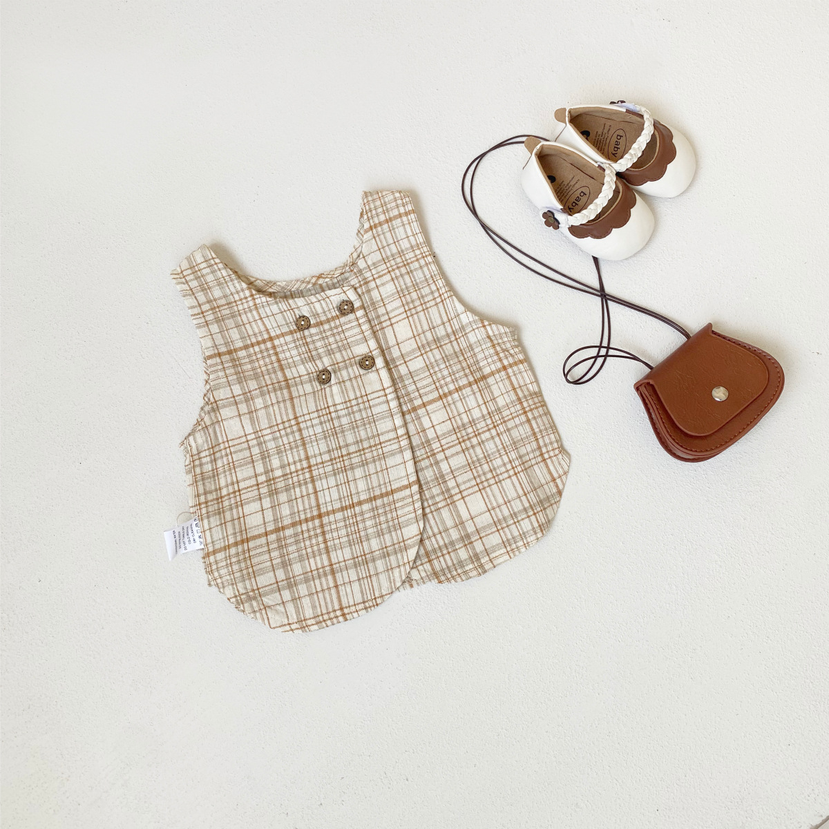 おしゃれなレトロチェック柄が目を引く、ベビー用ノースリーブベストです。春から夏にかけての季節にぴったりの、軽やかな着心地。カジュアルながらも洗練されたデザインで、普段のコーディネートにプラスするだけで、おしゃれ度がアップします。Tシャツやブラウスの上に重ね着したり、ワンピースの上に羽織ったりと、様々な着こなしが楽しめます。男の子にも女の子にも似合うユニセックスなデザインで、ちょっとしたお出かけにもおすすめです。
