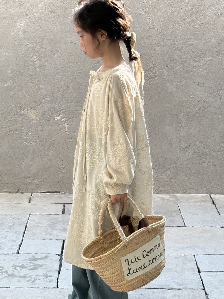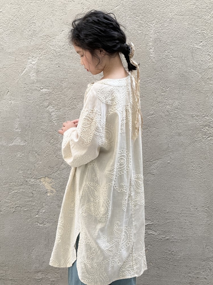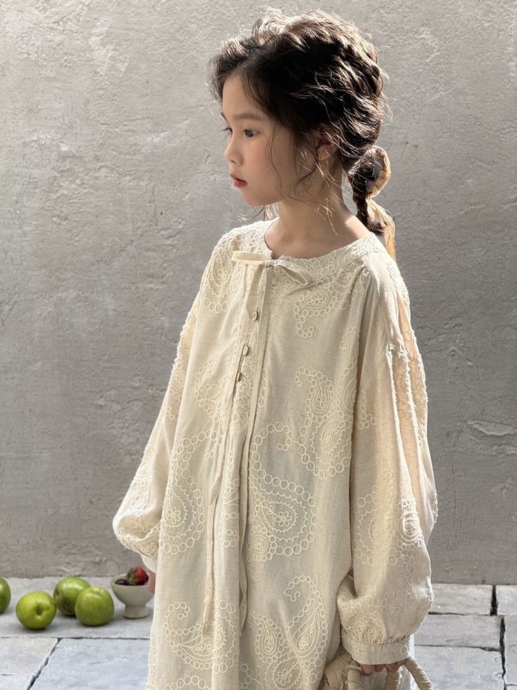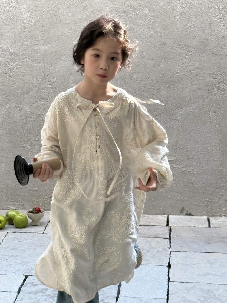 繊細な刺繍レースとサイドのスリットが、さりげないおしゃれを演出するキッズ用長袖ワンピースです。春にぴったりの、柔らかな素材と落ち着いた色合いが上品な印象。袖口のレースアップデザインも、さりげないポイントです。普段使いにはもちろん、ちょっとしたお呼ばれや、お習い事などにもおすすめです。文学的な雰囲気漂う、おしゃれな一枚です。