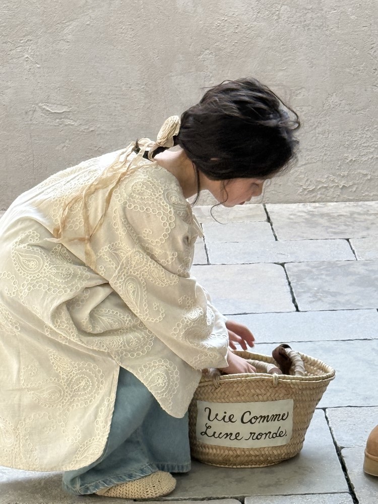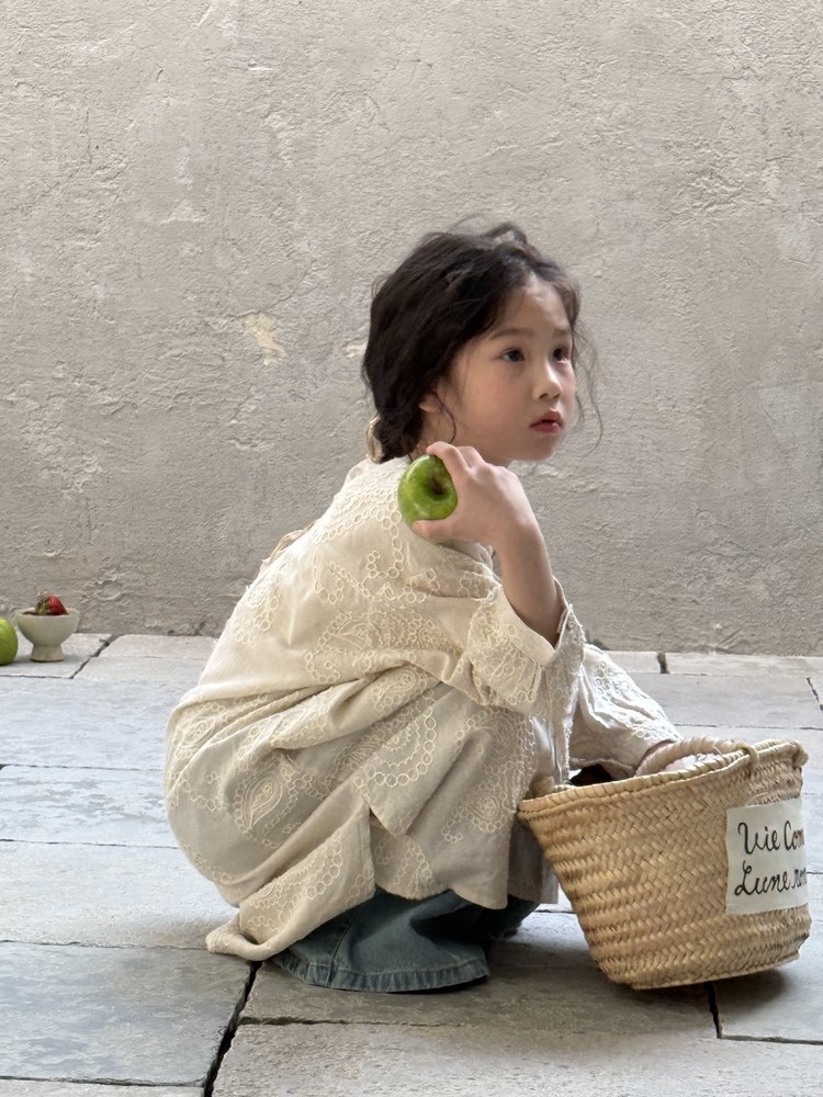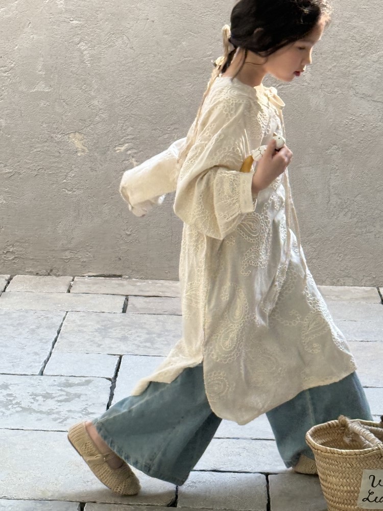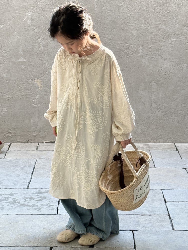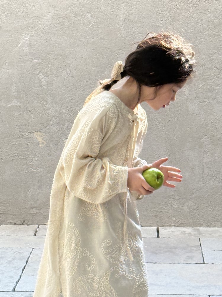 繊細な刺繍レースとサイドのスリットが、さりげないおしゃれを演出するキッズ用長袖ワンピースです。春にぴったりの、柔らかな素材と落ち着いた色合いが上品な印象。袖口のレースアップデザインも、さりげないポイントです。普段使いにはもちろん、ちょっとしたお呼ばれや、お習い事などにもおすすめです。文学的な雰囲気漂う、おしゃれな一枚です。