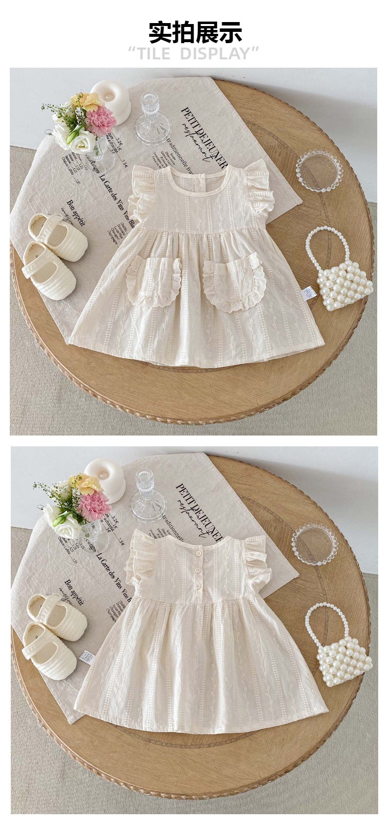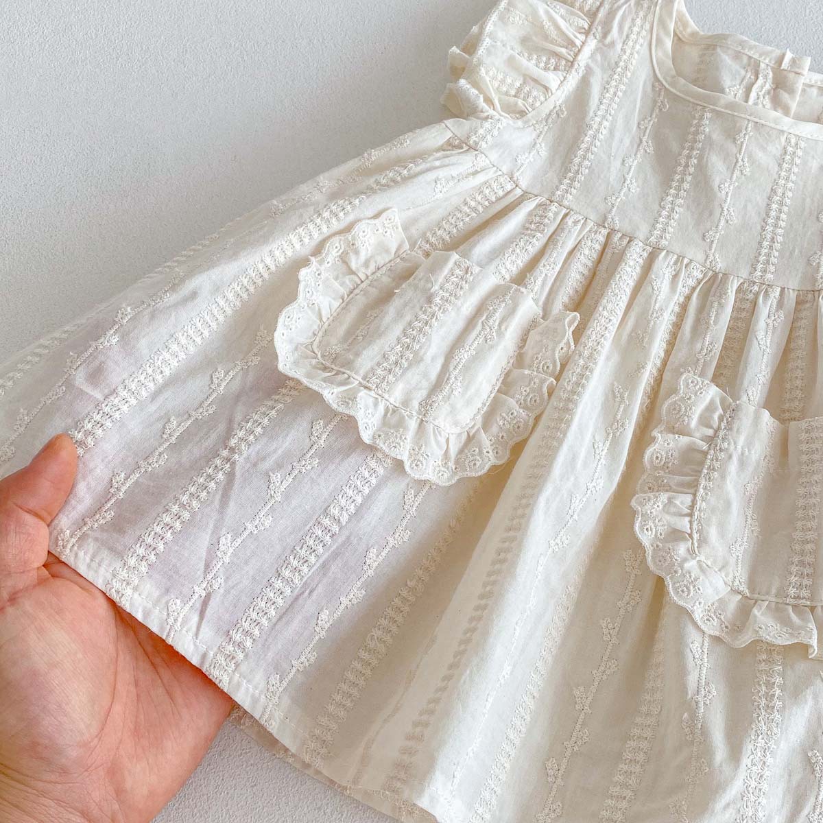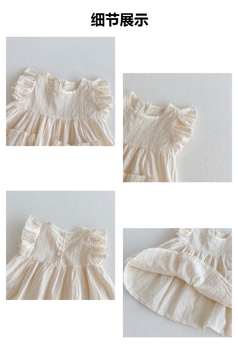 繊細な刺繍レースと、ふんわりとしたフリルスリーブが、まるで妖精のような可愛らしさを演出するキッズガール用コットンワンピースです。夏の装いにぴったりの、軽やかなコットン素材を使用。胸元のポケットにもレースがあしらわれ、おしゃれなアクセントになっています。普段使いにはもちろん、ちょっとしたお呼ばれや、おめかししたい日にもぴったりの一枚。お子様の可愛らしさを引き立てる、とっておきのサマードレスです。