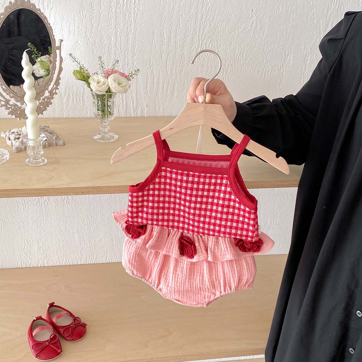 夏のおめかしにぴったりの、チェック柄キャミソールトップスと、フラワーアップリケとフリルが愛らしいブルマパンツのベビーガール用2点セットです。涼しげな素材で、暑い季節も快適に過ごせます。トップスは肩紐で長さ調節が可能。ブルマパンツは、ふんわりとしたシルエットで、ベビーの可愛らしさを引き立てます。初めてのお誕生日や、ちょっとしたお祝いの席にもおすすめです。もちろん、普段使いにもぴったり。上下別々にも着こなせるので、おしゃれの幅が広がります。