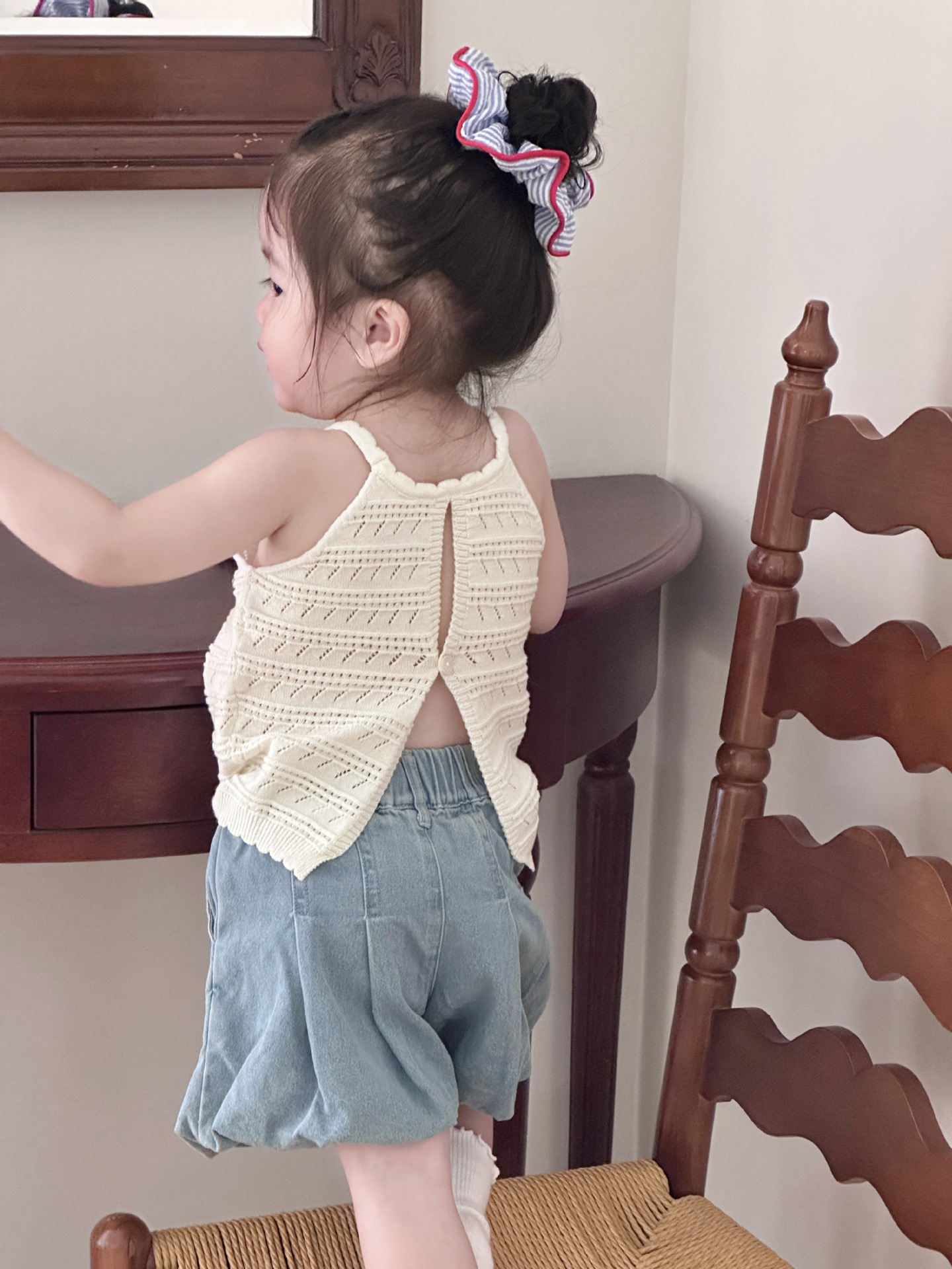 夏の装いにぴったりの、繊細なレースニットが目を引くキッズガール用キャミソールタンクトップスです。軽やかな透かし編みデザインで、涼しげな印象を与えます。バックレスデザインとリボンが、さりげない可愛らしさをプラス。Tシャツやブラウスとの重ね着はもちろん、一枚でもおしゃれに決まります。普段使いにはもちろん、ちょっとしたお出かけにもおすすめです。