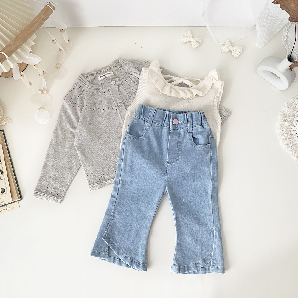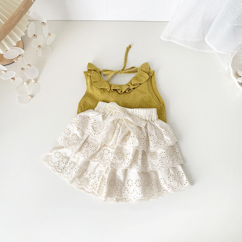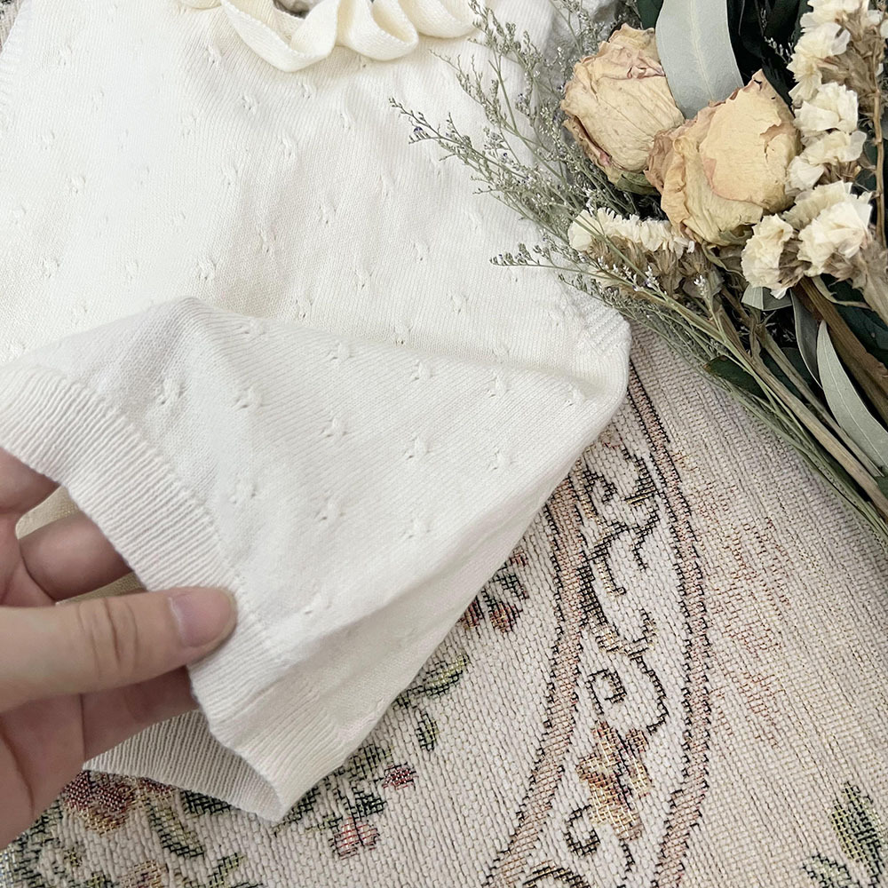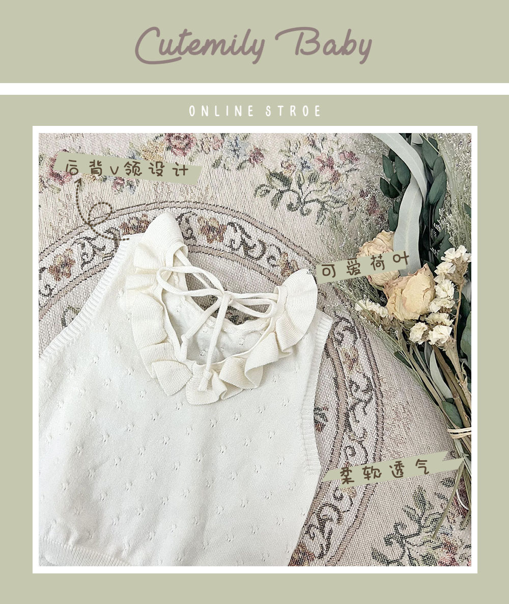 夏の装いにぴったりの、ラッフルフリル襟とバックオープンデザインが魅力的なキッズガール用ノースリーブニットトップスです。繊細な透かし編みが涼しげな印象を与え、柔らかなコットン素材で快適な着心地。後ろVネックのデザインがおしゃれなアクセントになっています。Tシャツやブラウスとの重ね着はもちろん、一枚でも洗練されたスタイルが完成します。普段使いはもちろん、ちょっとしたお出かけにもおすすめです。