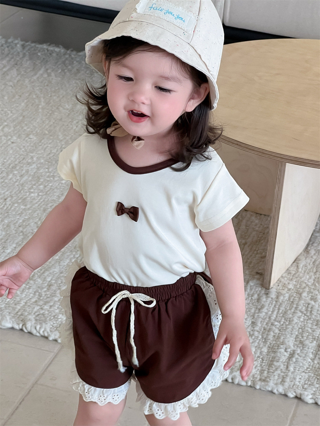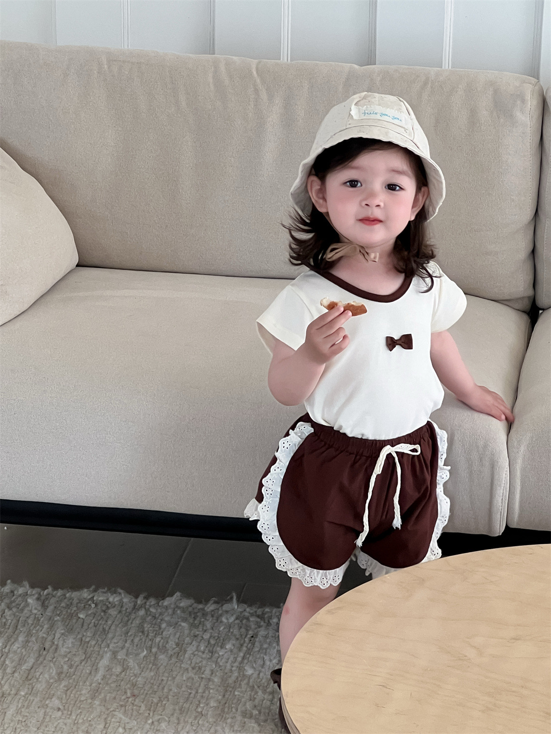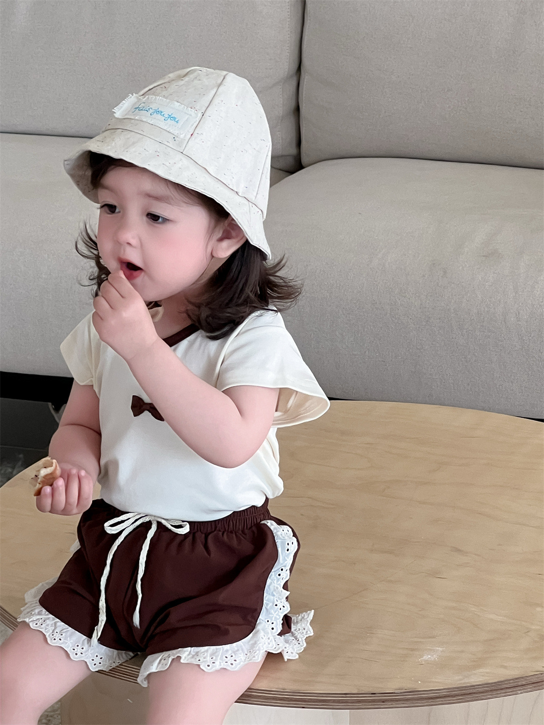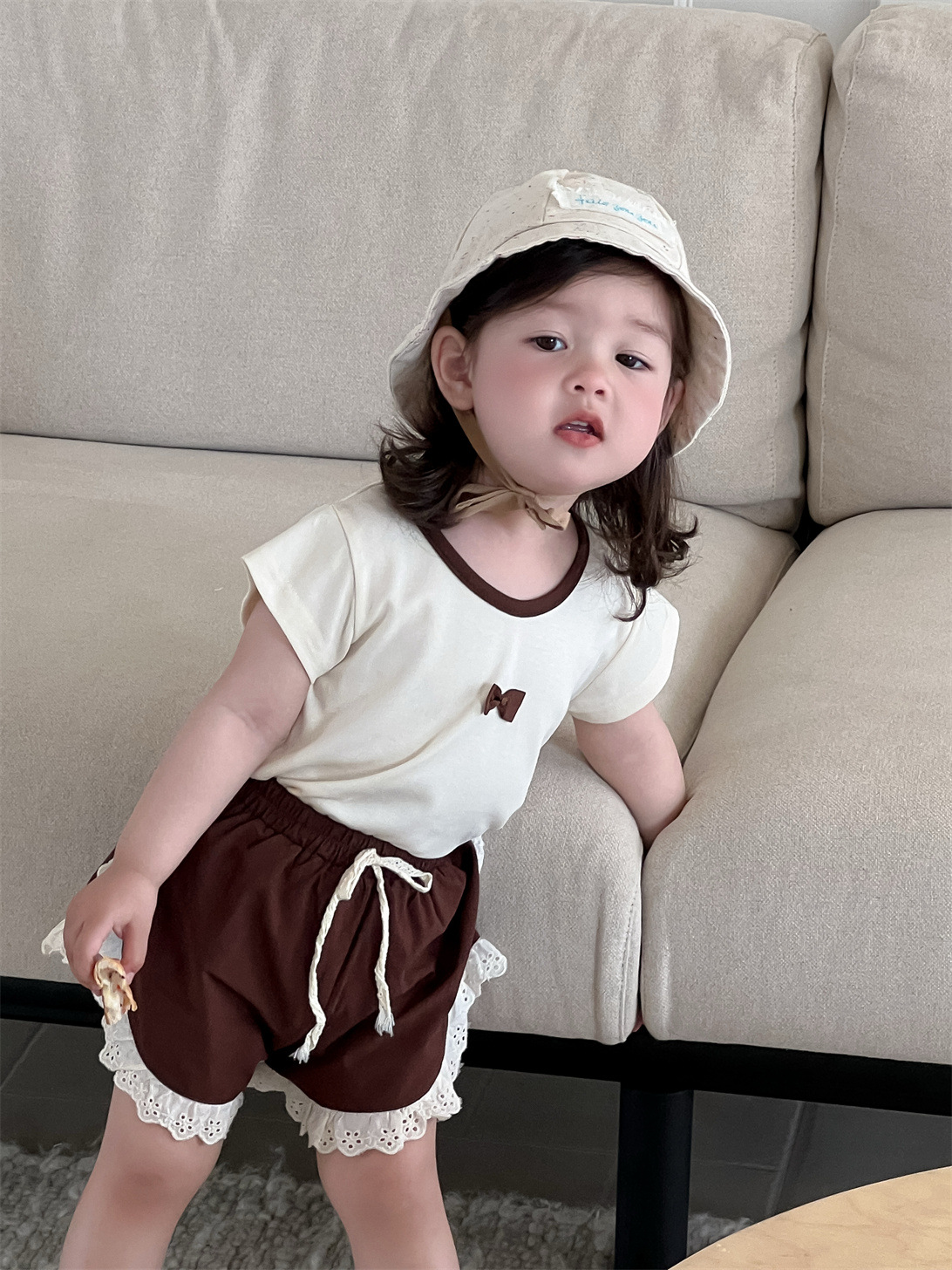 リボン/フラワープリント半袖Tシャツとサイドレースショートパンツのセットアップです。Tシャツはリボンまたはフラワープリントのデザインがあり、ショートパンツはサイドにレースがあしらわれた可愛らしいデザインです。